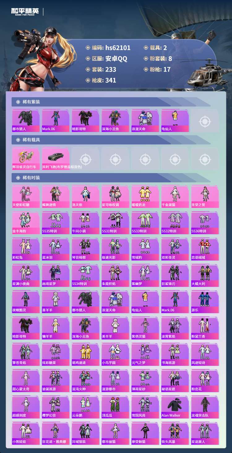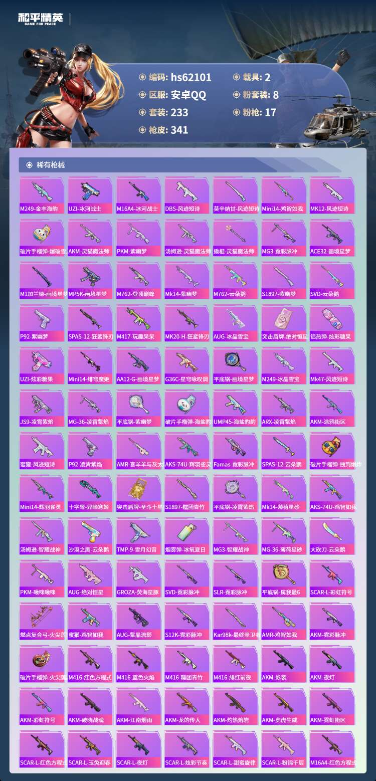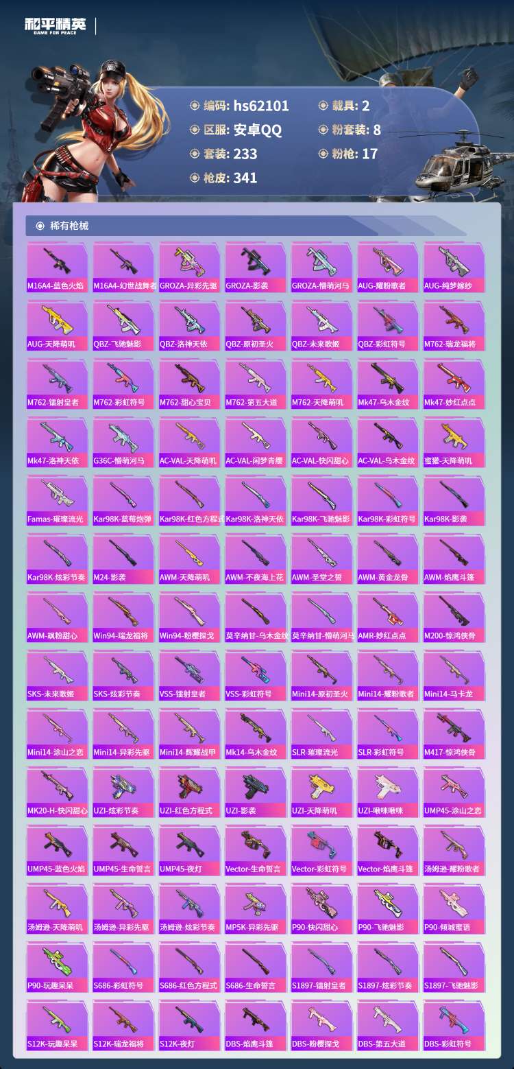 hs62101 安卓手Q-17王牌印记-8粉装-17特效枪-2载具-110617热力值-233套装-