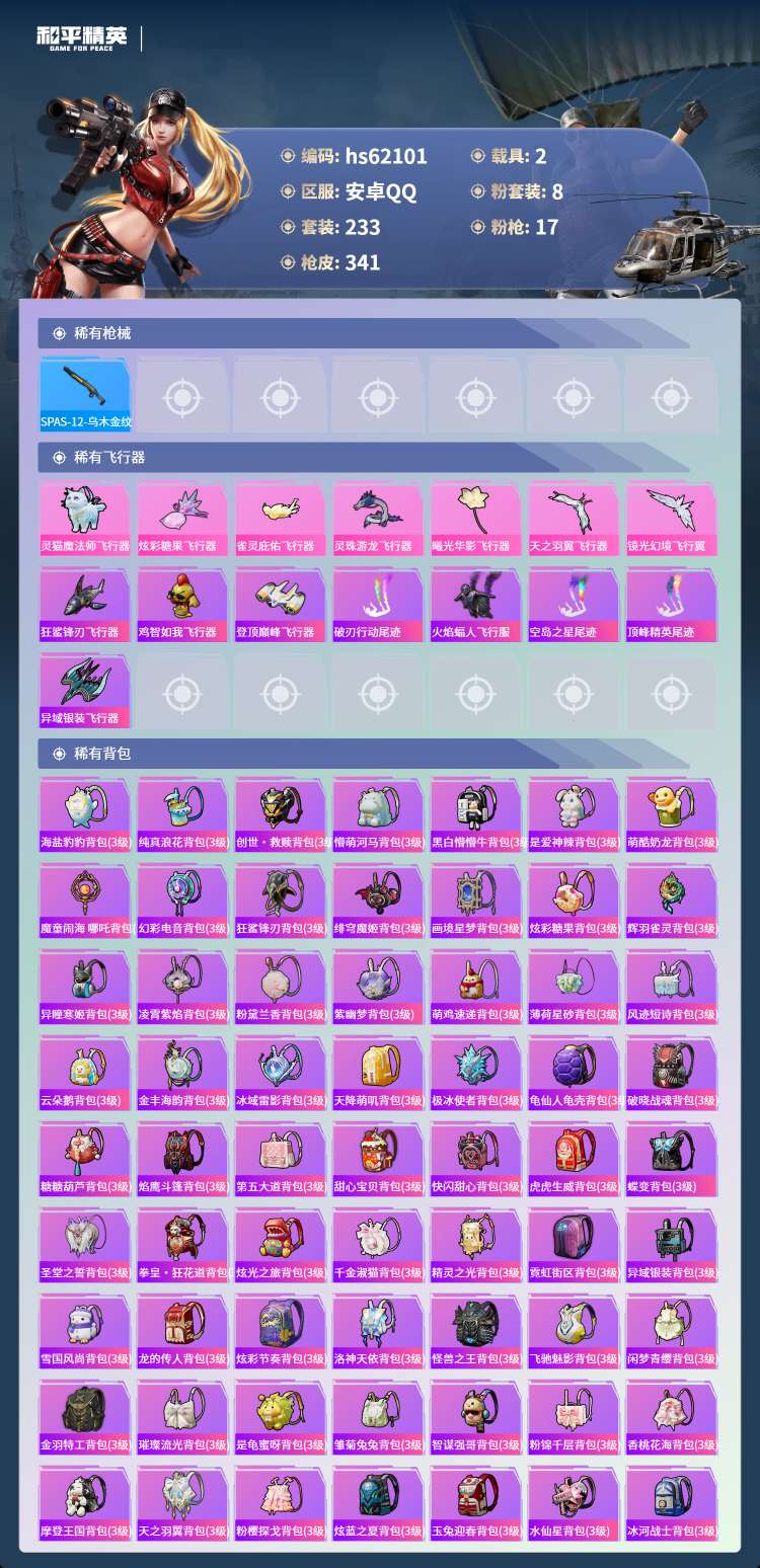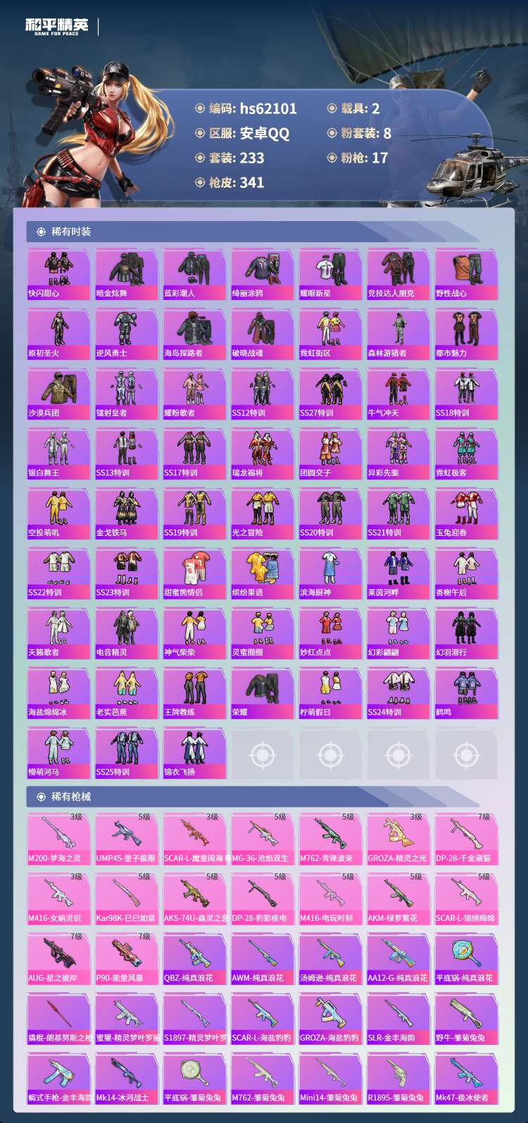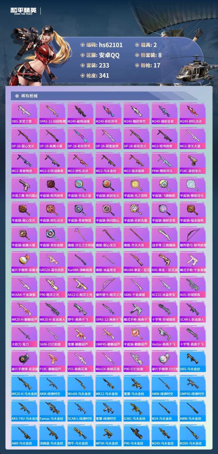 hs62101 安卓手Q-17王牌印记-8粉装-17特效枪-2载具-110617热力值-233套装-
