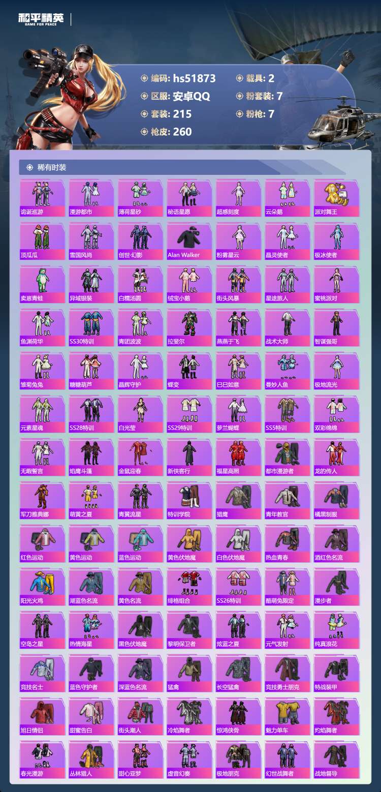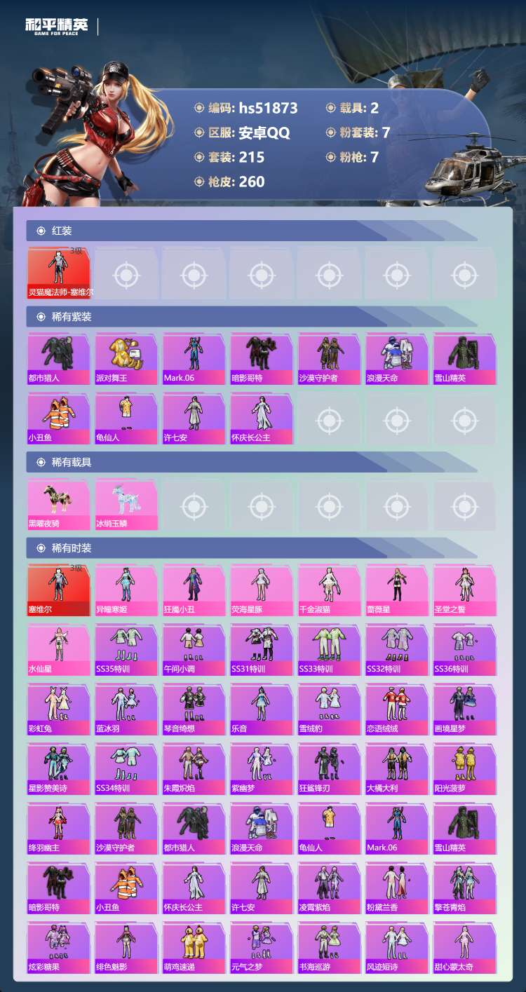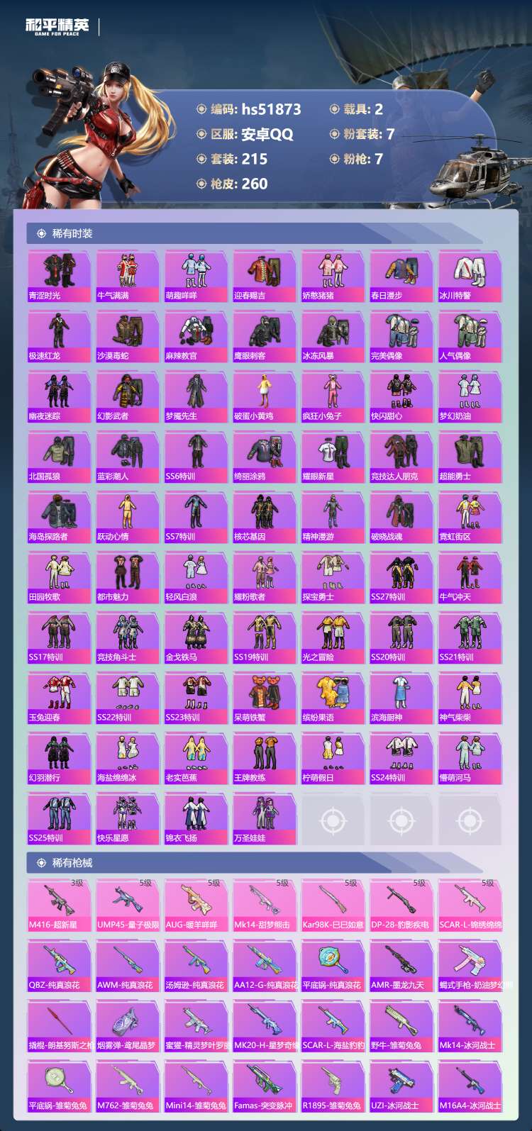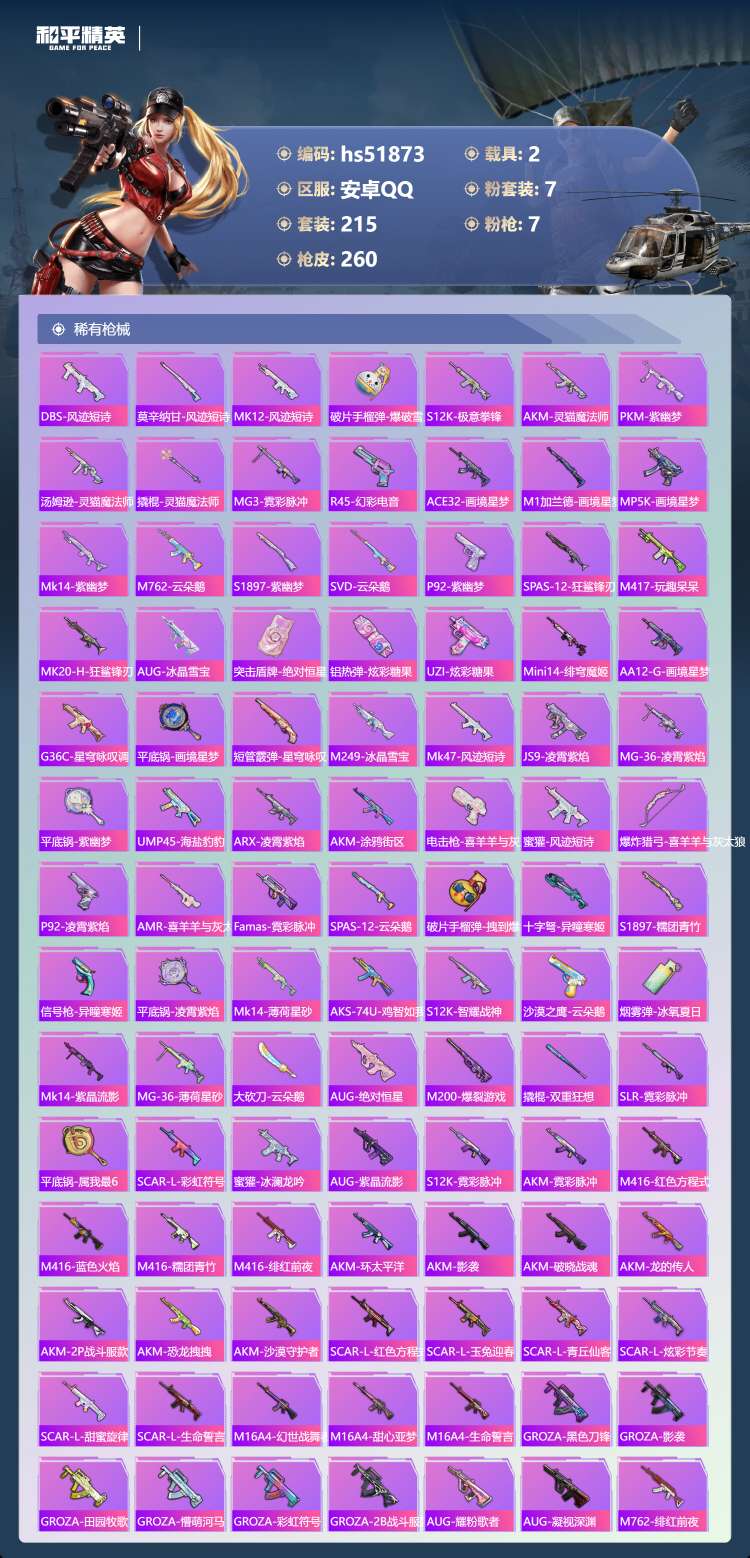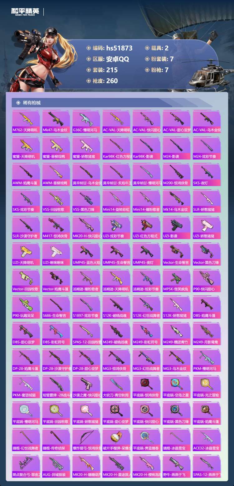 hs51873 安卓手Q-18王牌印记-1红装-7粉装-7特效枪-2载具-85046热力值-215套