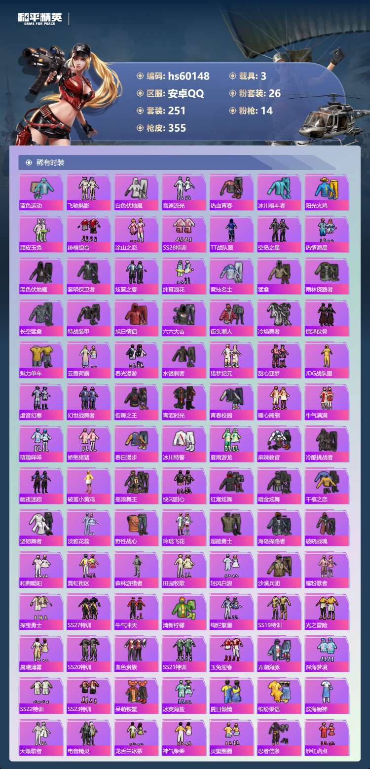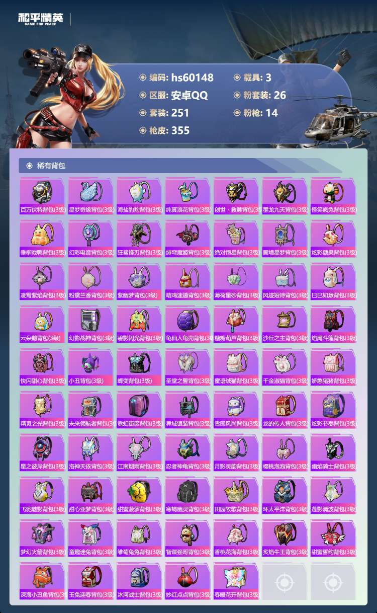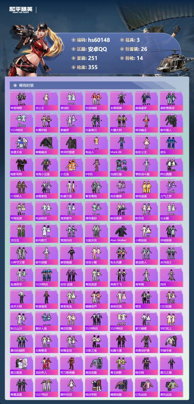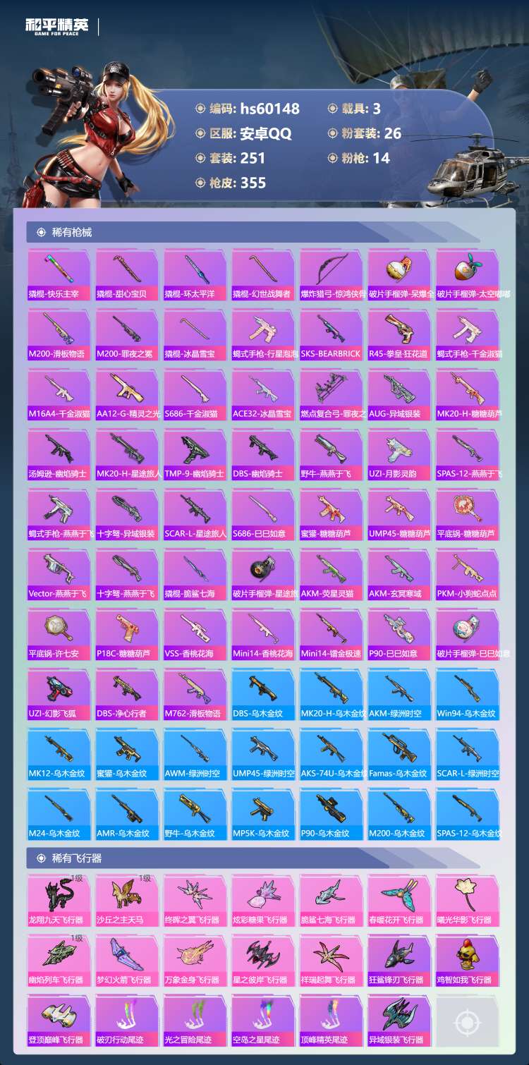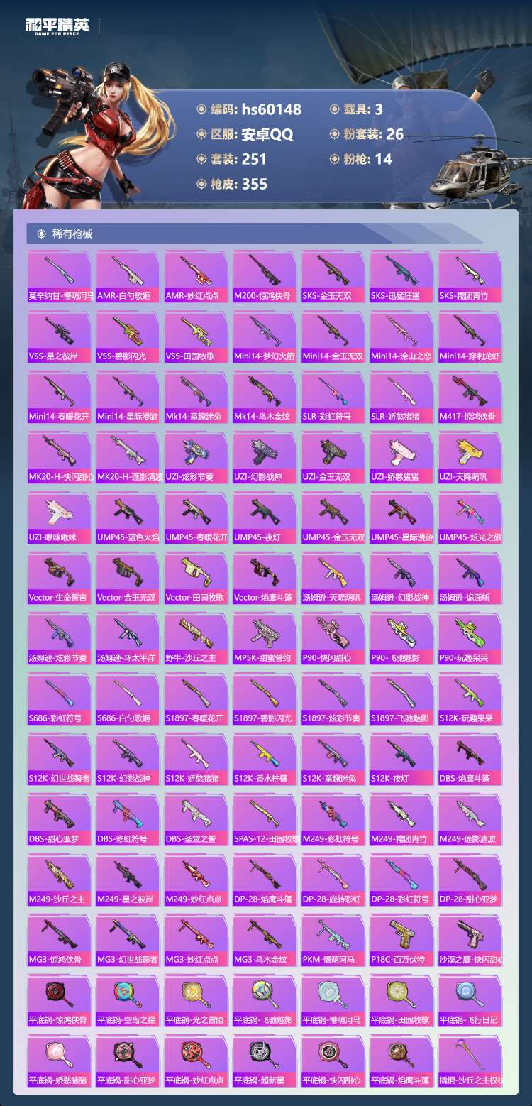 hs60148 安卓手Q-18王牌印记-有战神框-1红装-26粉装-14特效枪-3载具-122202