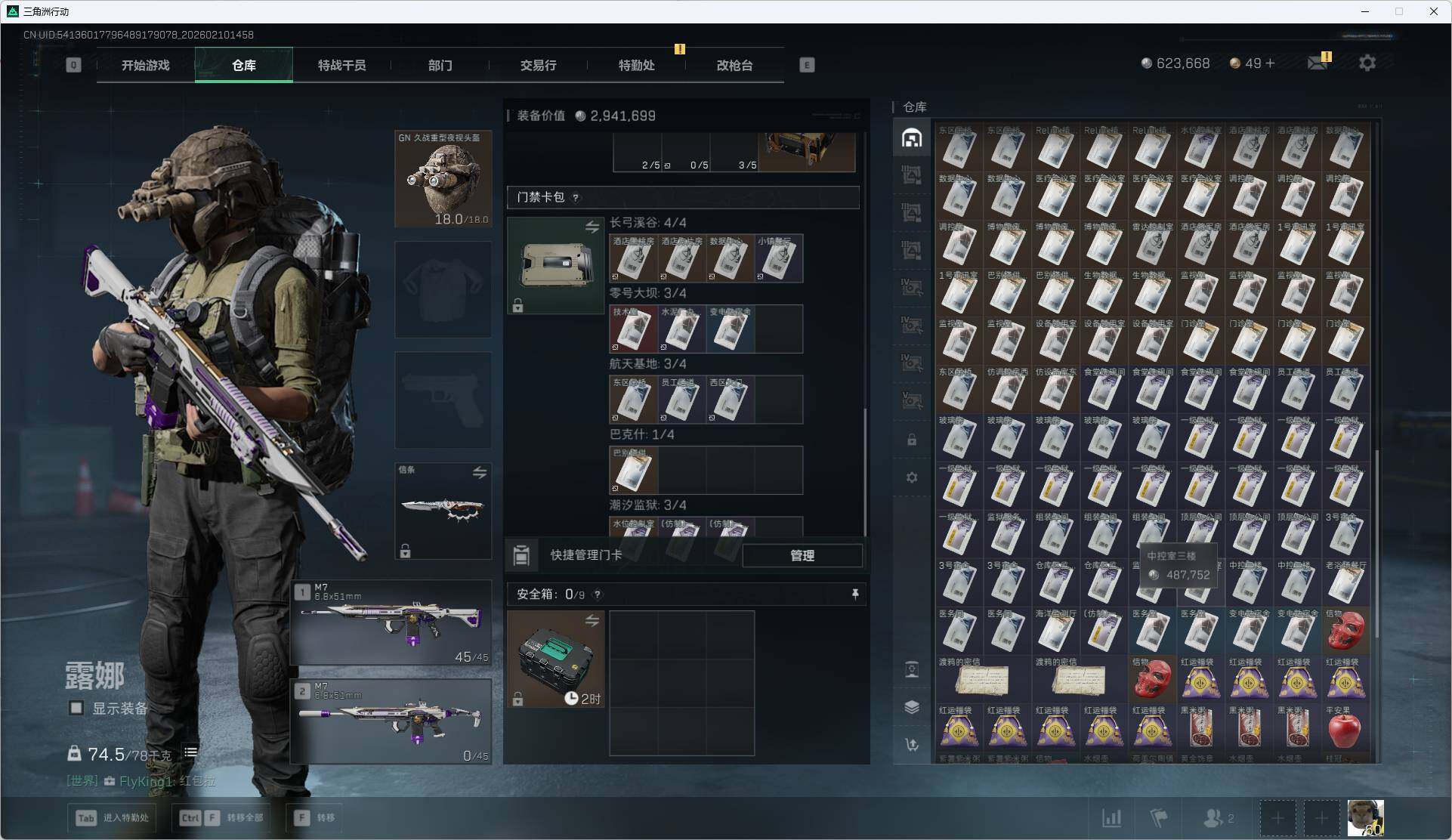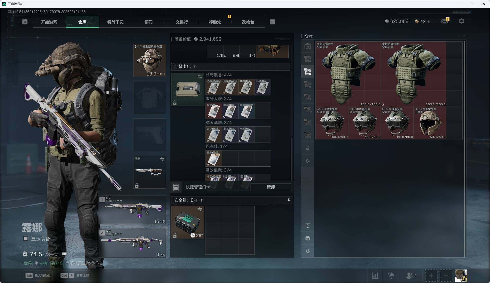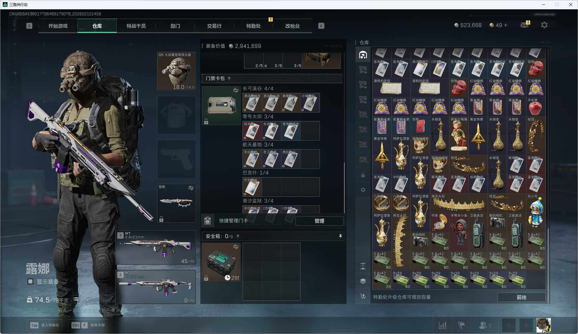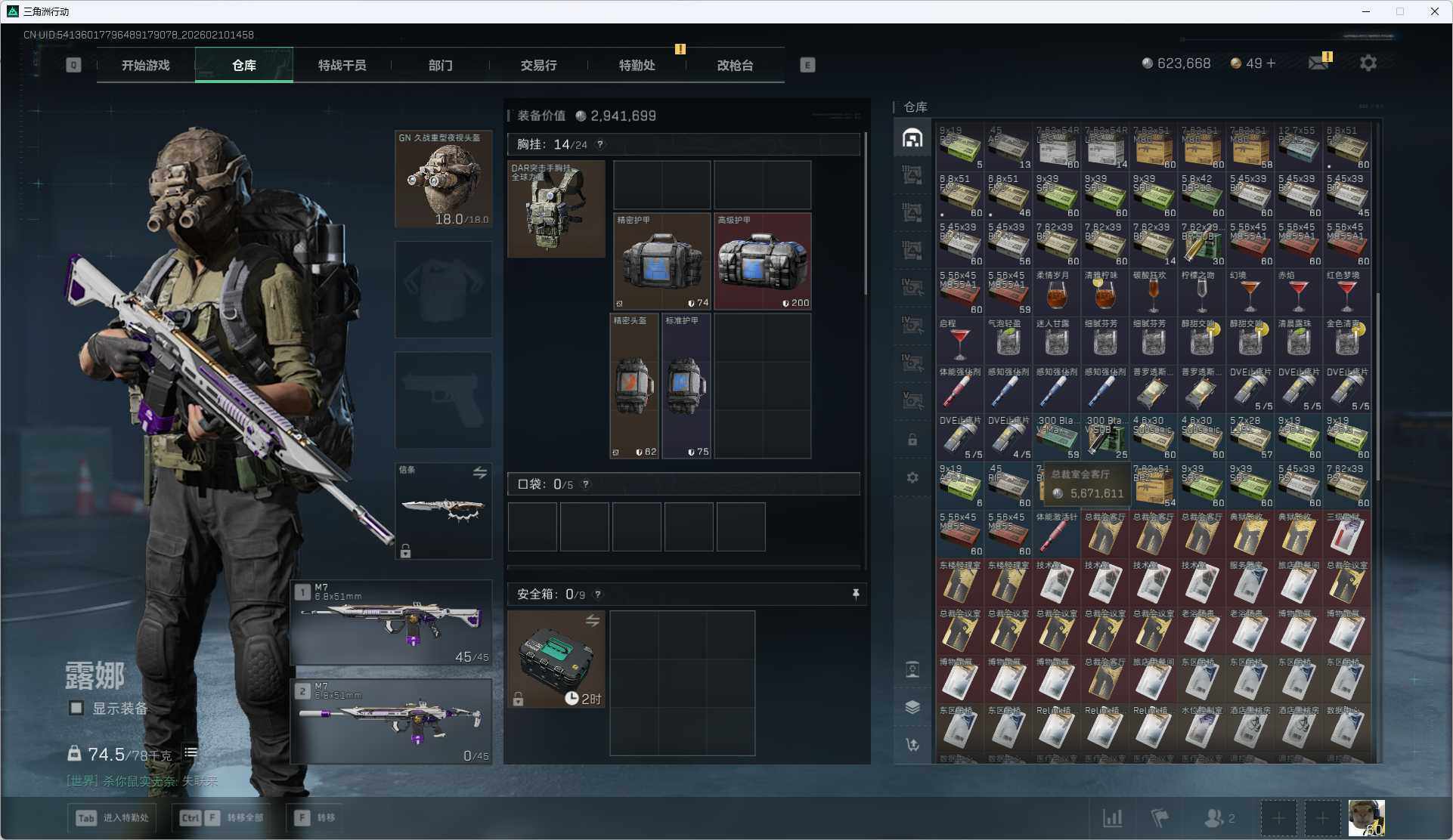 总资产(M):588M/哈夫币(K):623K/哈夫币(K):623K/传说枪皮数:6/全面战场等级