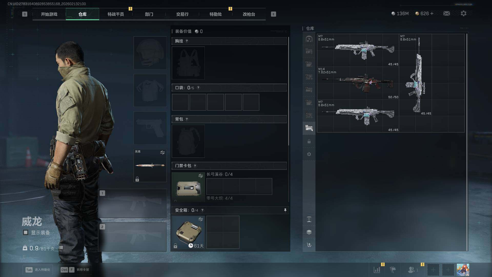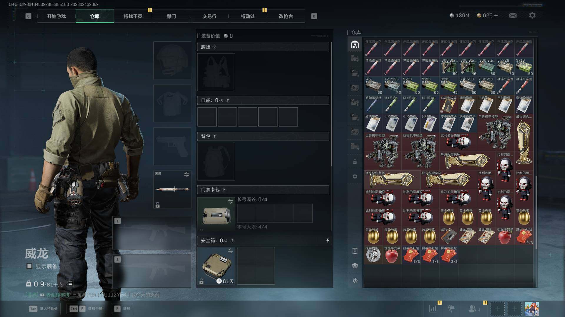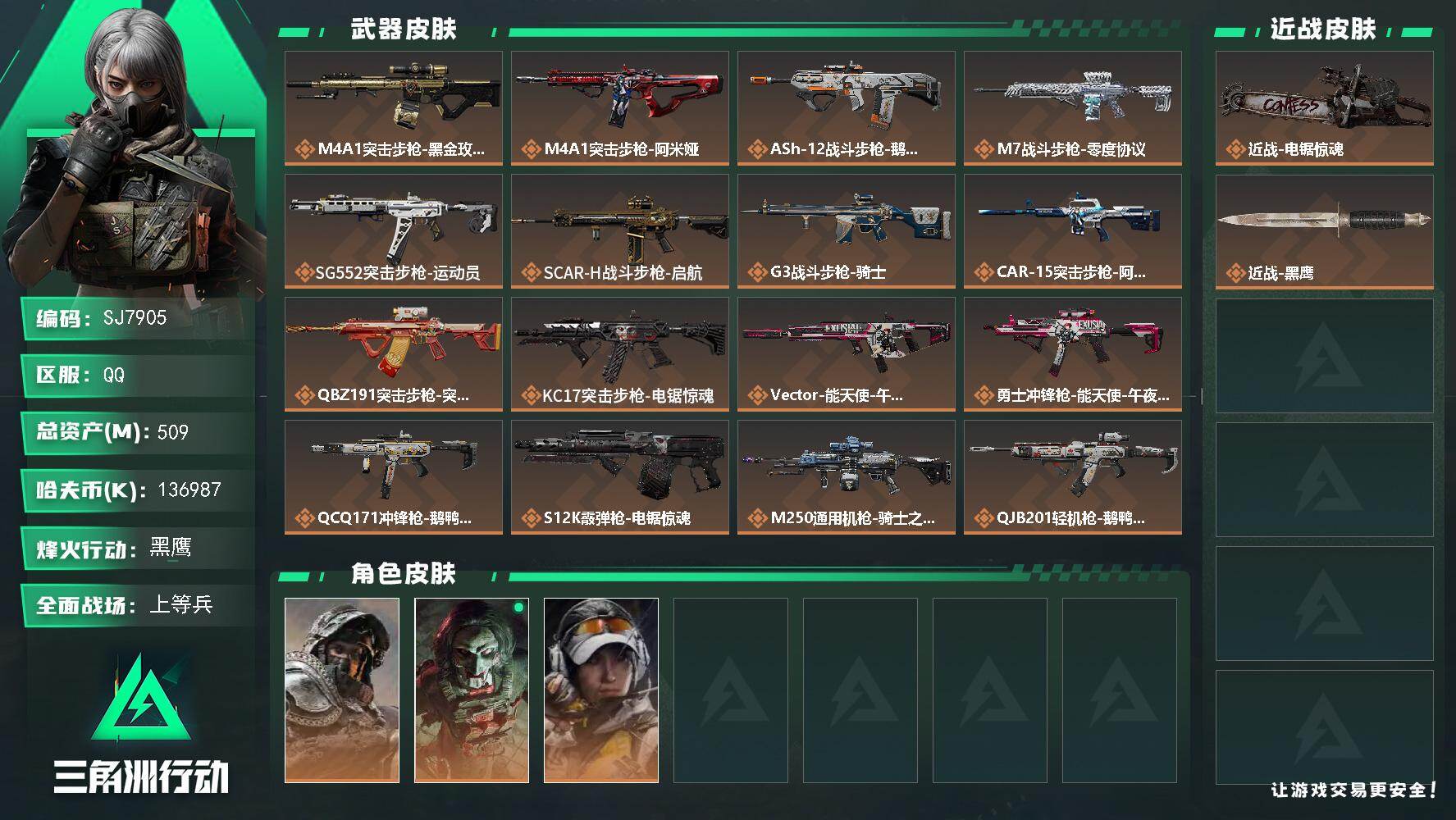 总资产(M):509M/哈夫币(K):136987K/哈夫币(K):136987K/传说枪皮数:21