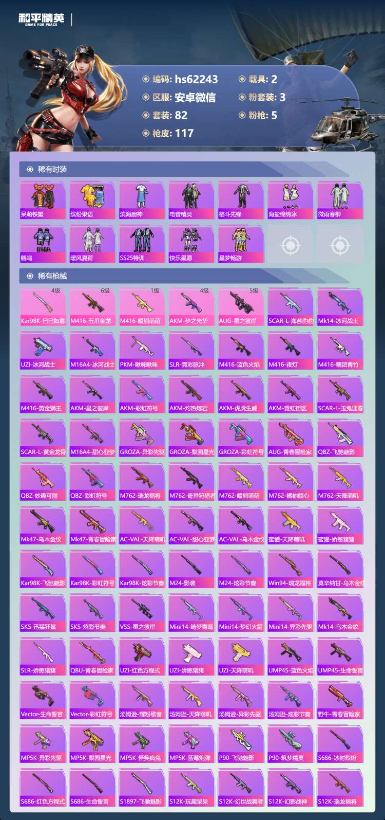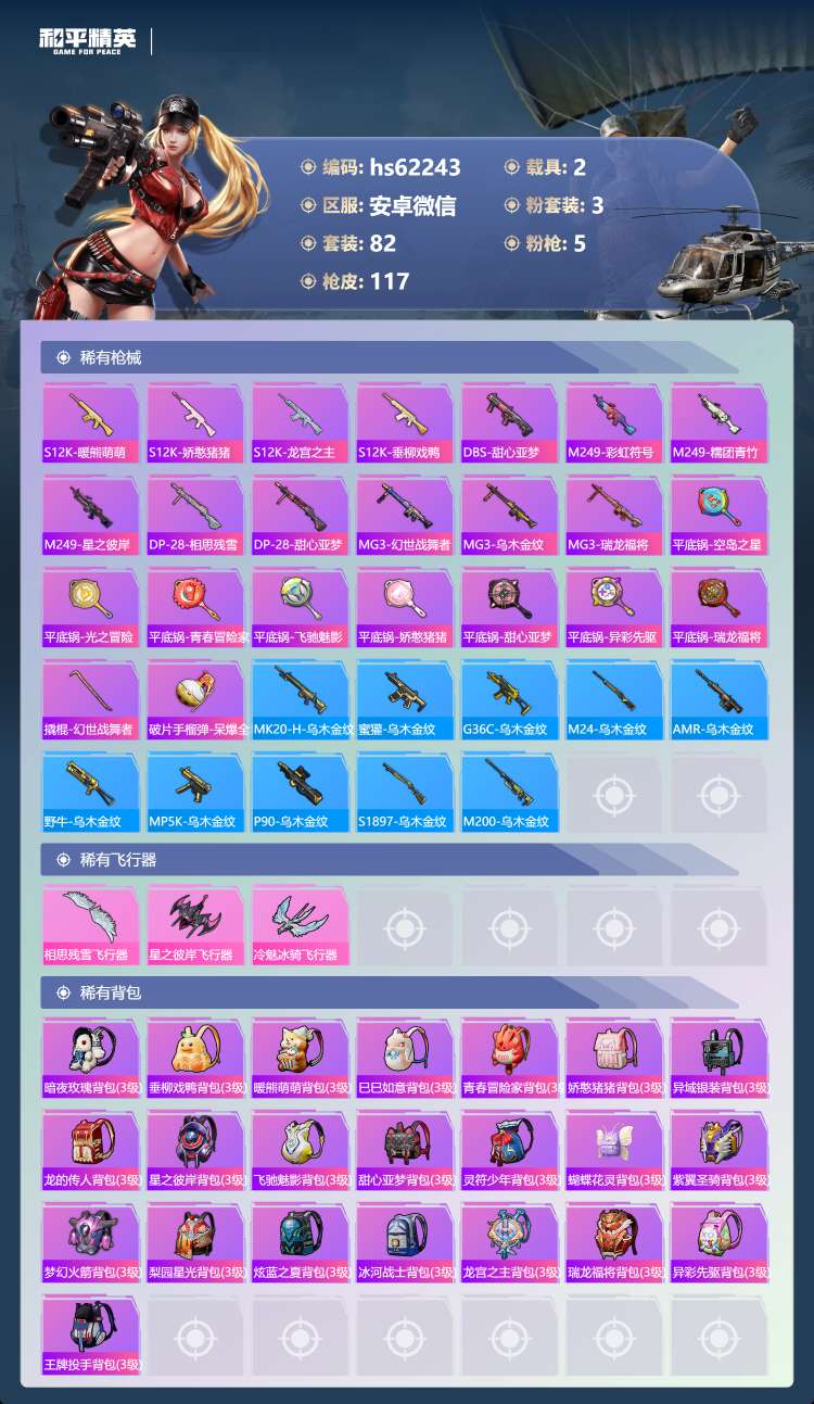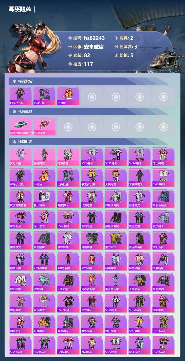 hs62243 安卓微-7王牌印记-3粉装-5特效枪-2载具-38445热力值-82套装-117枪