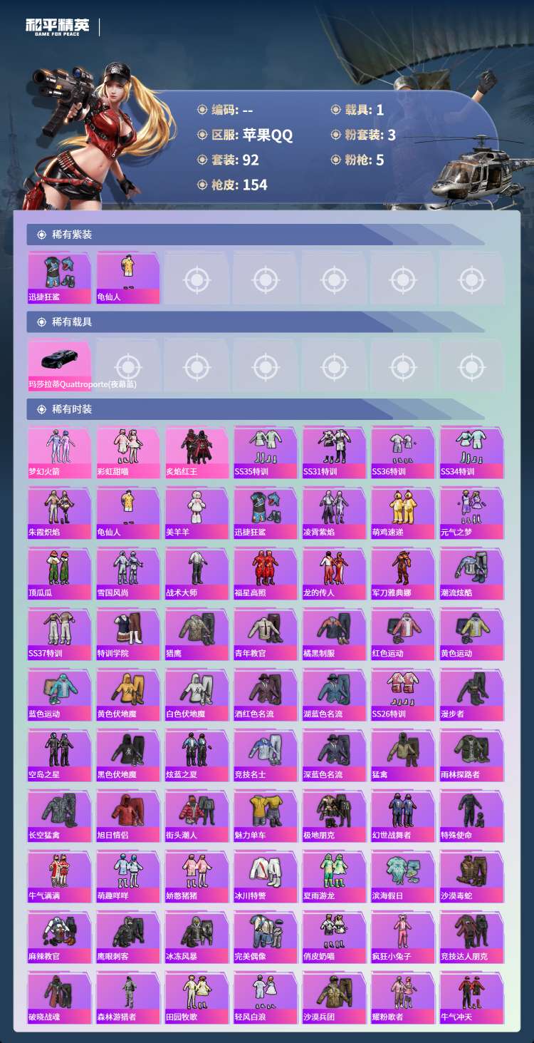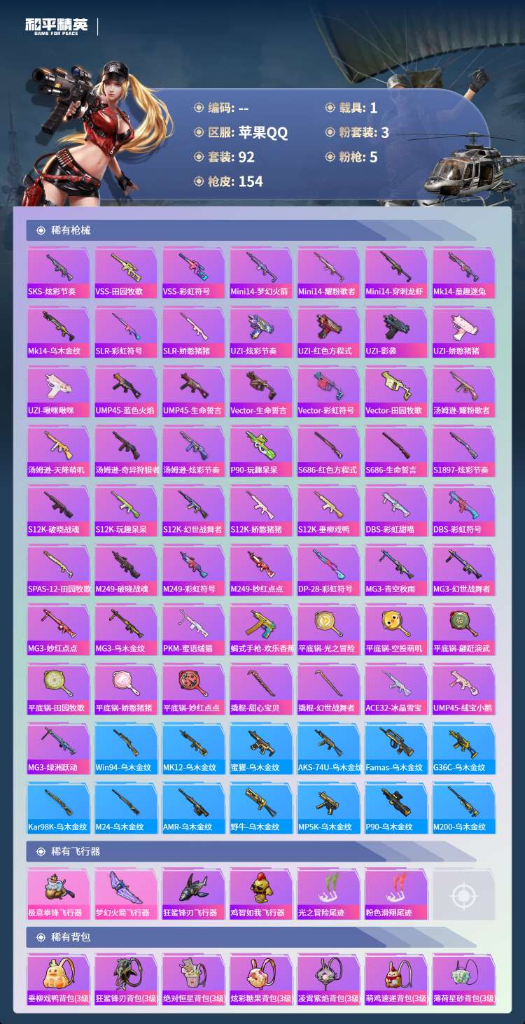 hs61894苹果手Q-4王牌印记-3粉装-5特效枪-1载具-43305热力值-92套装-154枪皮