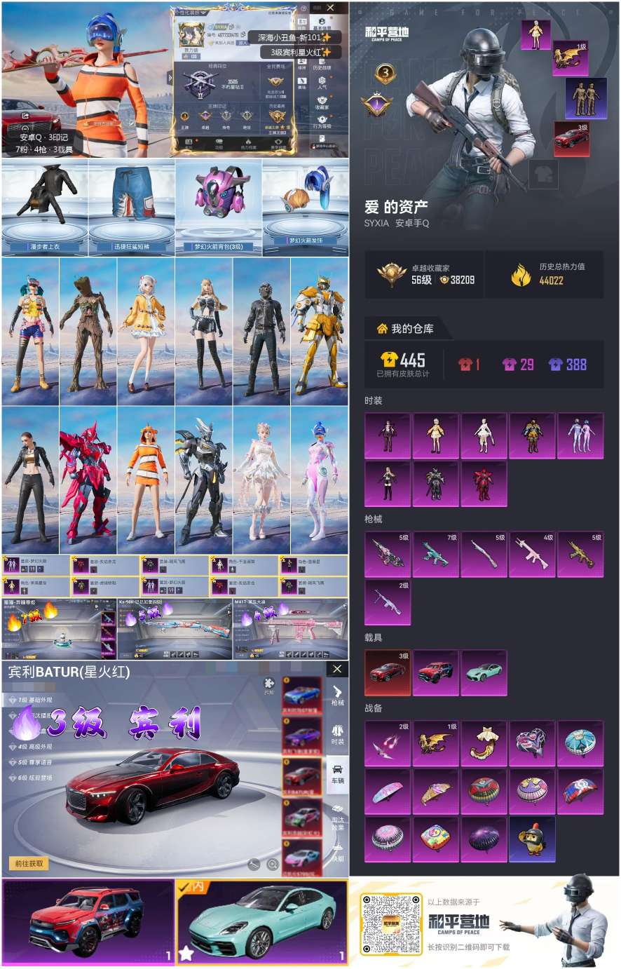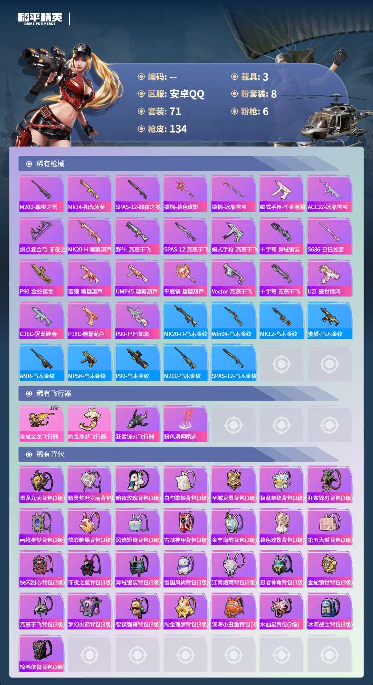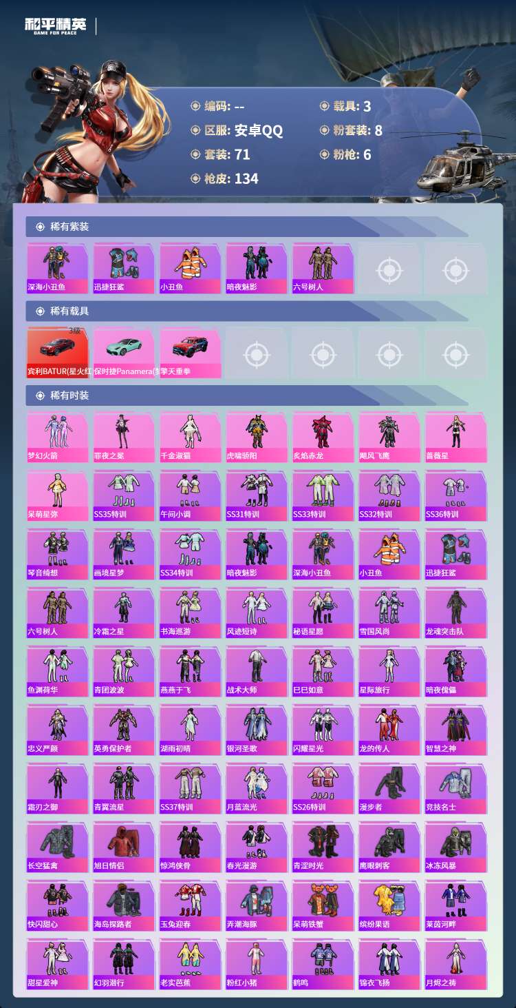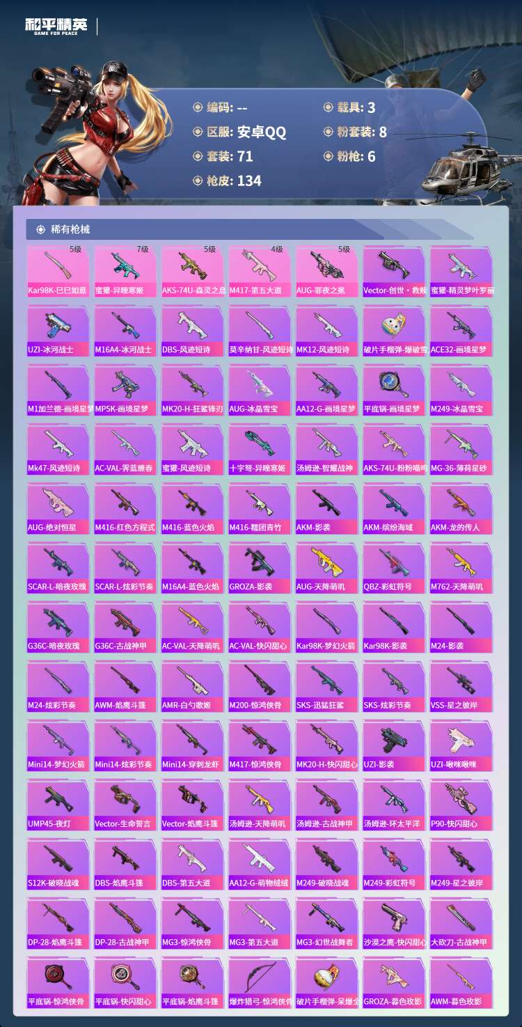 hs61840安卓手Q-3王牌印记-8粉装-6特效枪-3载具-44022热力值-71套装-134枪皮