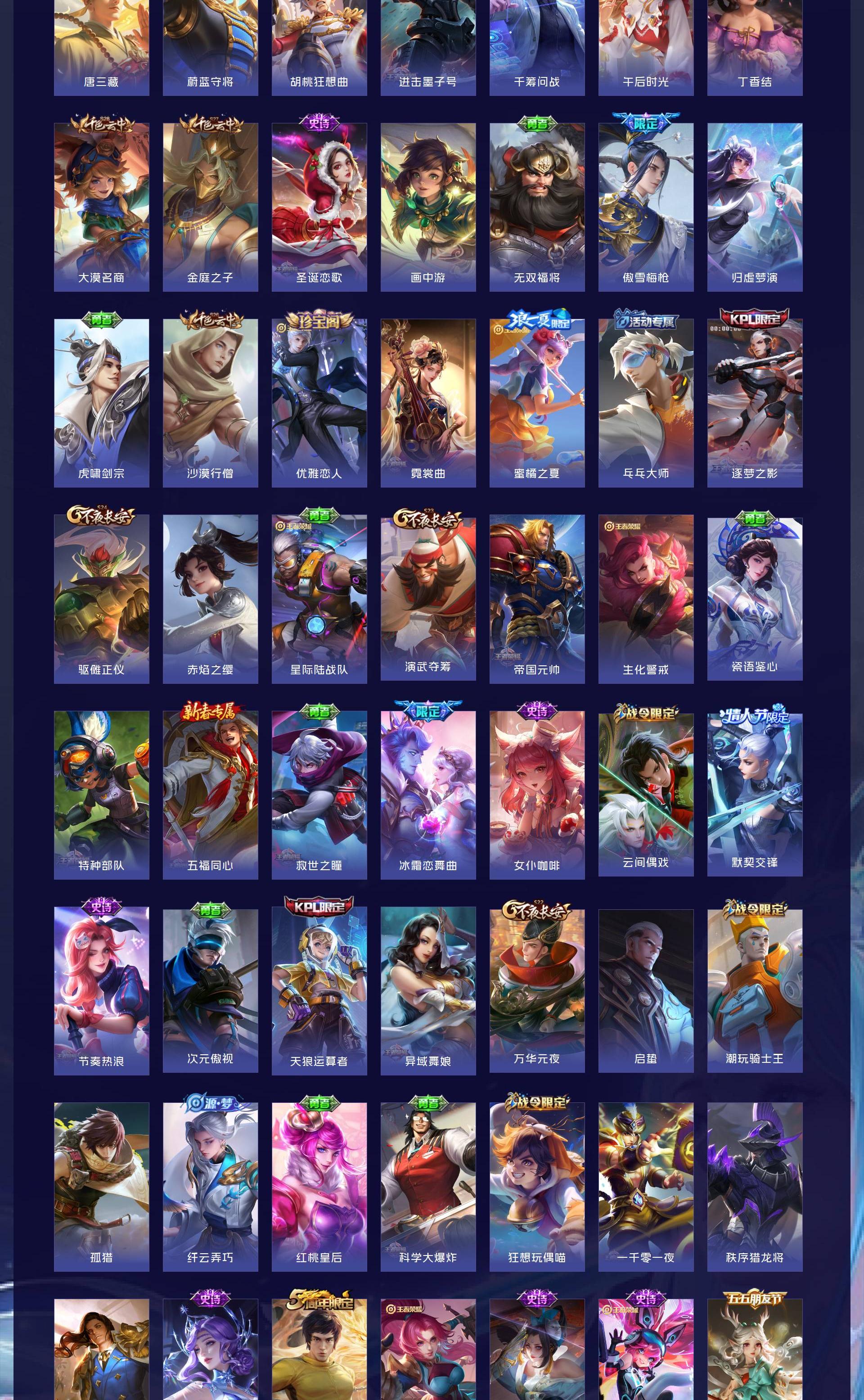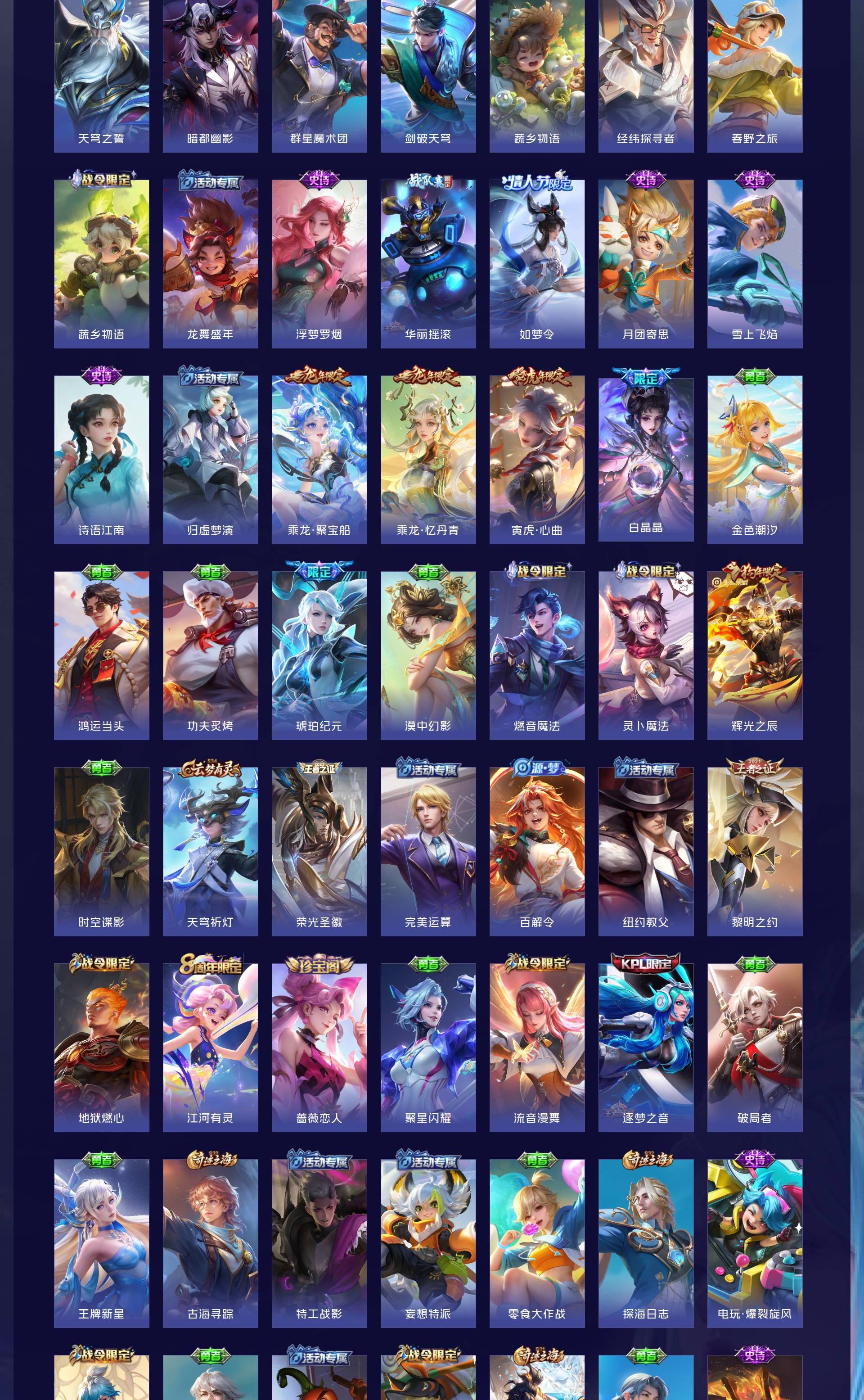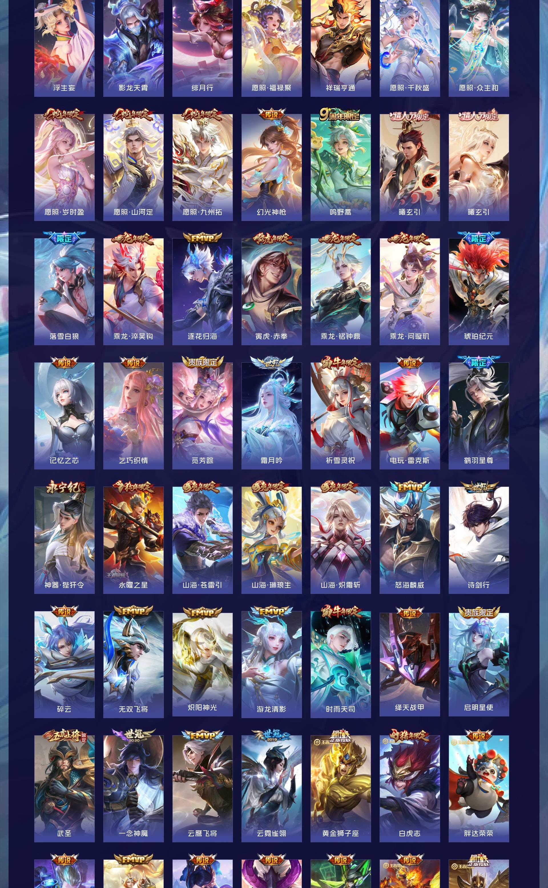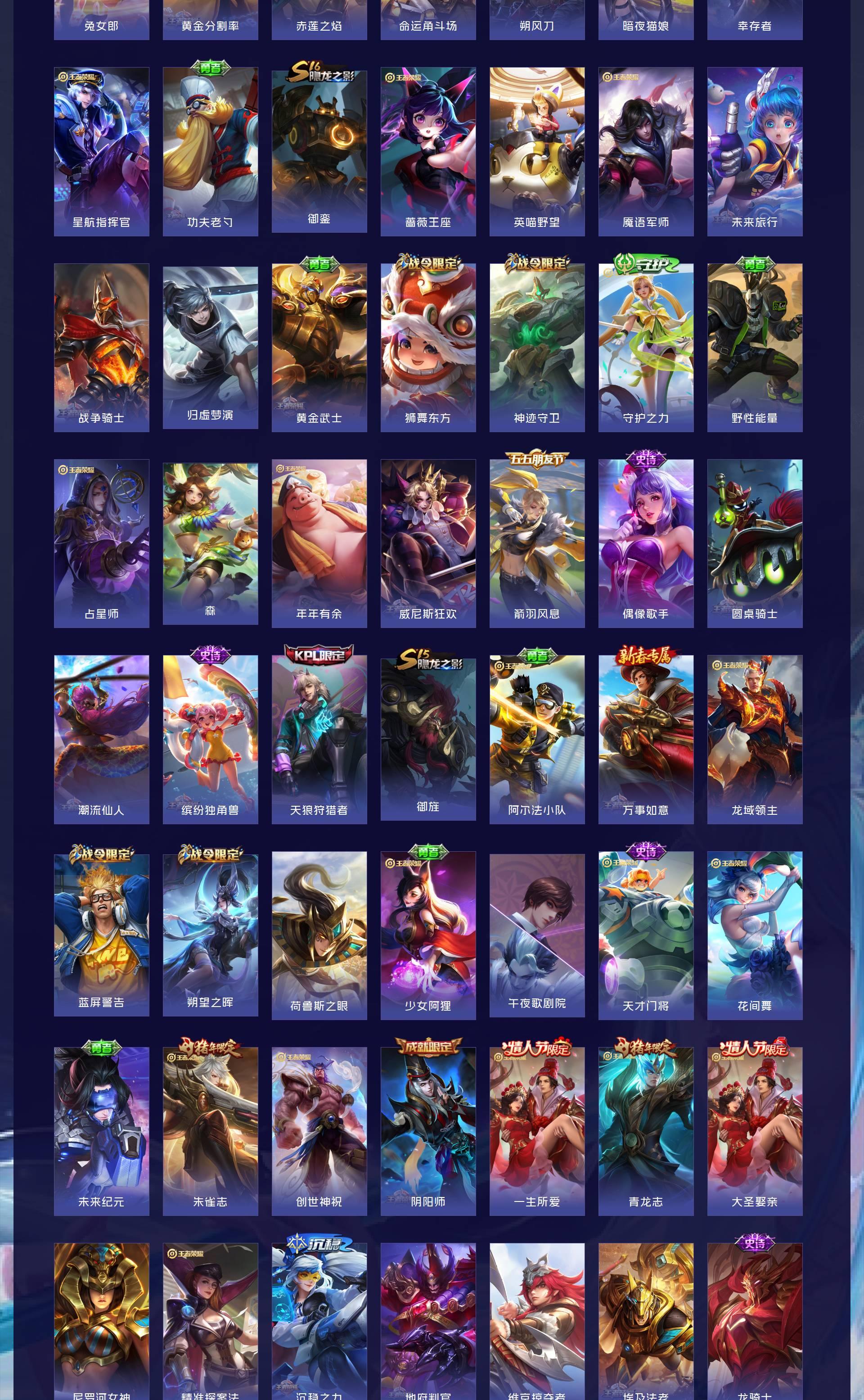 V10 皮肤501 至尊星耀 荣耀典藏5 无双皮肤3 珍品传说5 传说63 其他皮肤429