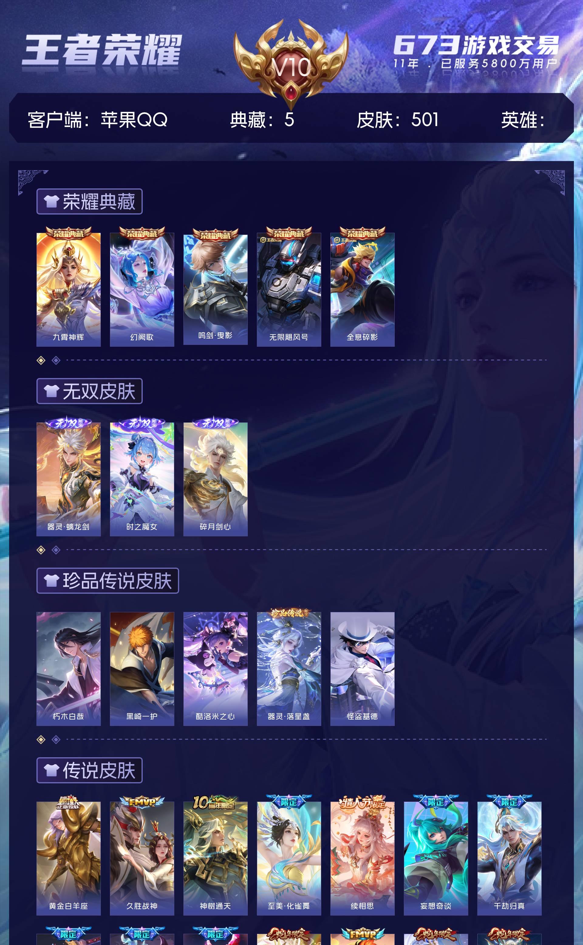苹果QQ/至尊星耀/501皮肤/126英雄/5典藏/0珍品无双/3无双/5珍品传说/64传说/158