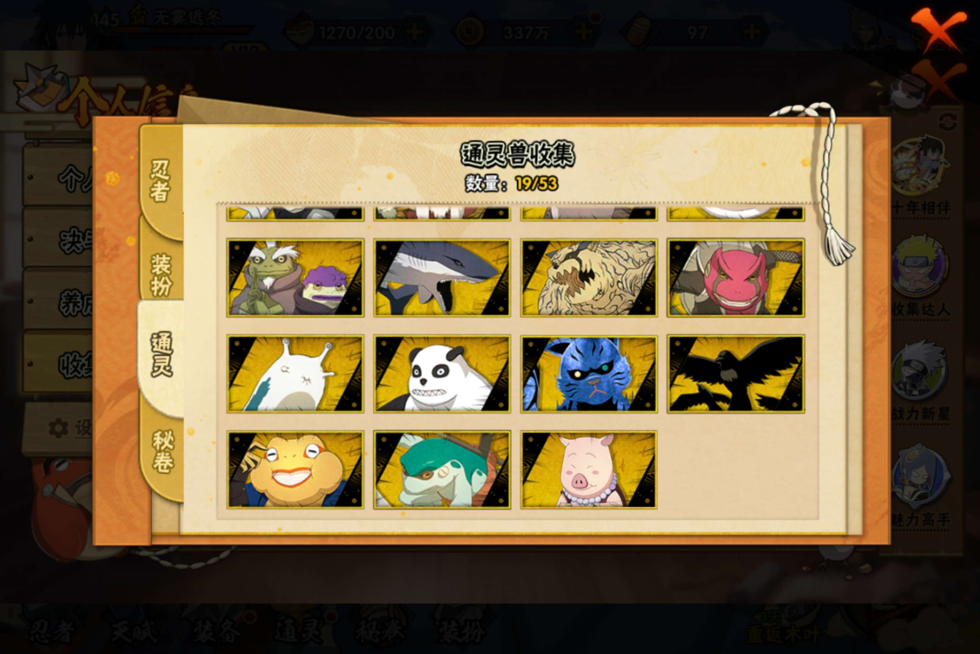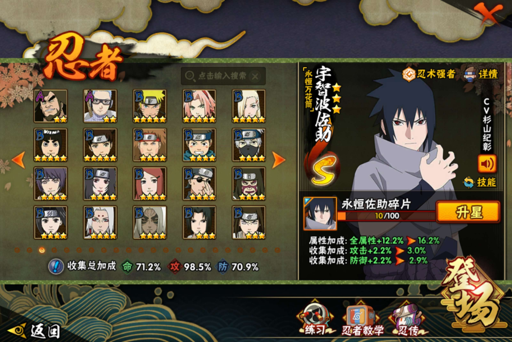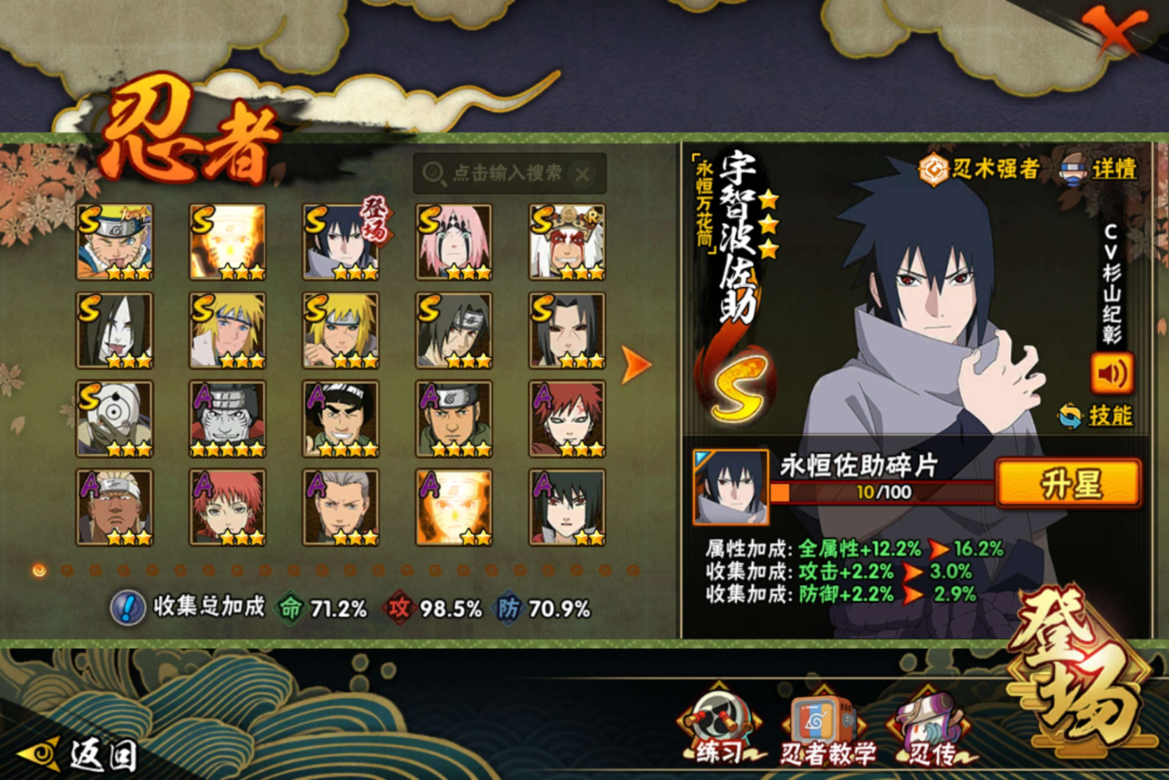 【S级忍者】宇智波佐助「永恒万花筒」(3星),春野樱「忍界大战」(3星),漩涡鸣人「九喇嘛连结」(3星),宇智波斑「白面具」(3星),波风水门「秽土转生」(3星),自来也「舞之豪杰」(3星),宇智波鼬「秽土转生」(3星),宇智波鼬「须佐能乎」(3星),漩涡鸣人·宇智波佐助(3星),波风水门(3星),大蛇丸