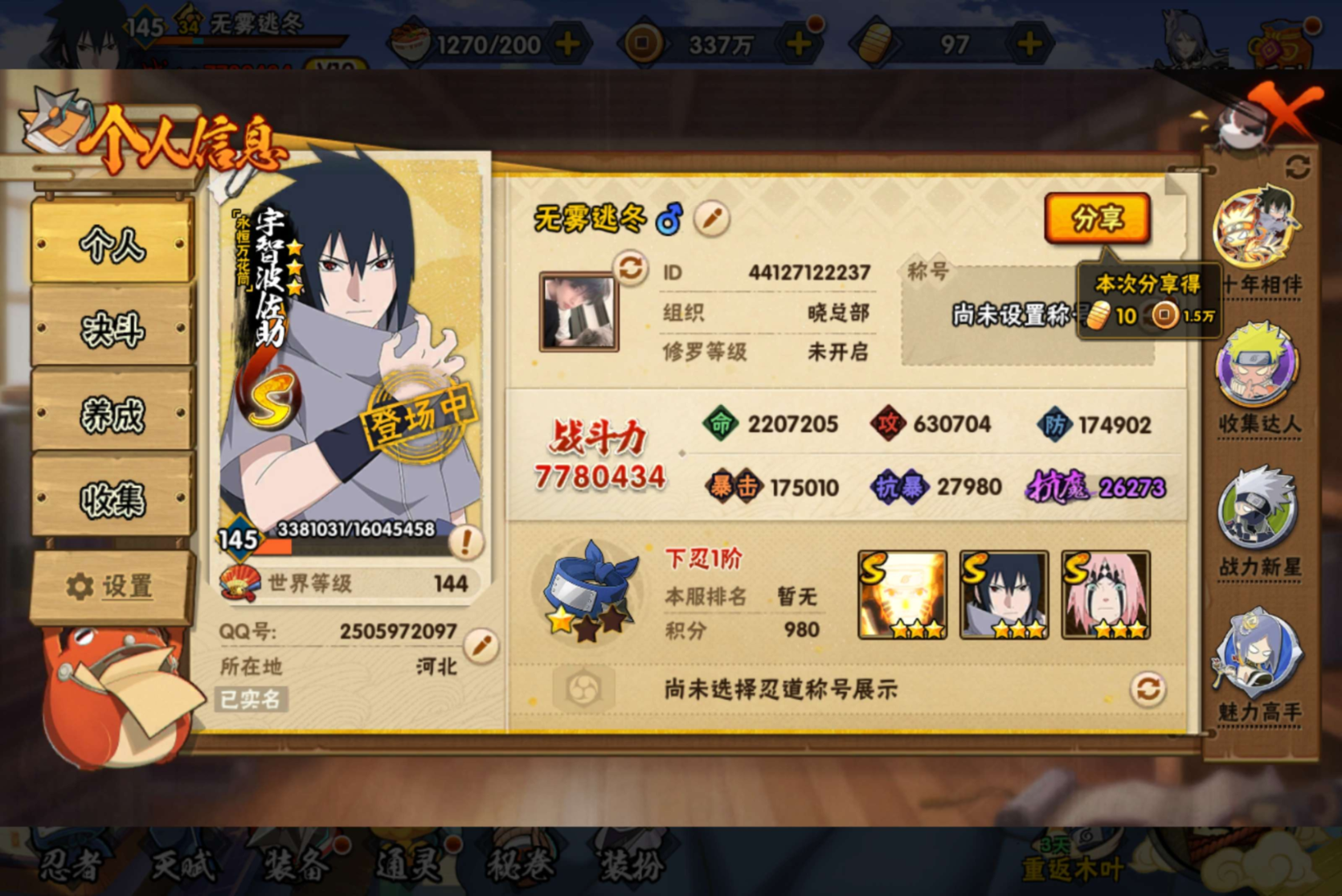 安卓QQ-可二次-v10捡漏号-十多个198a忍-熊猫-S忍者数:11- A忍者数:31