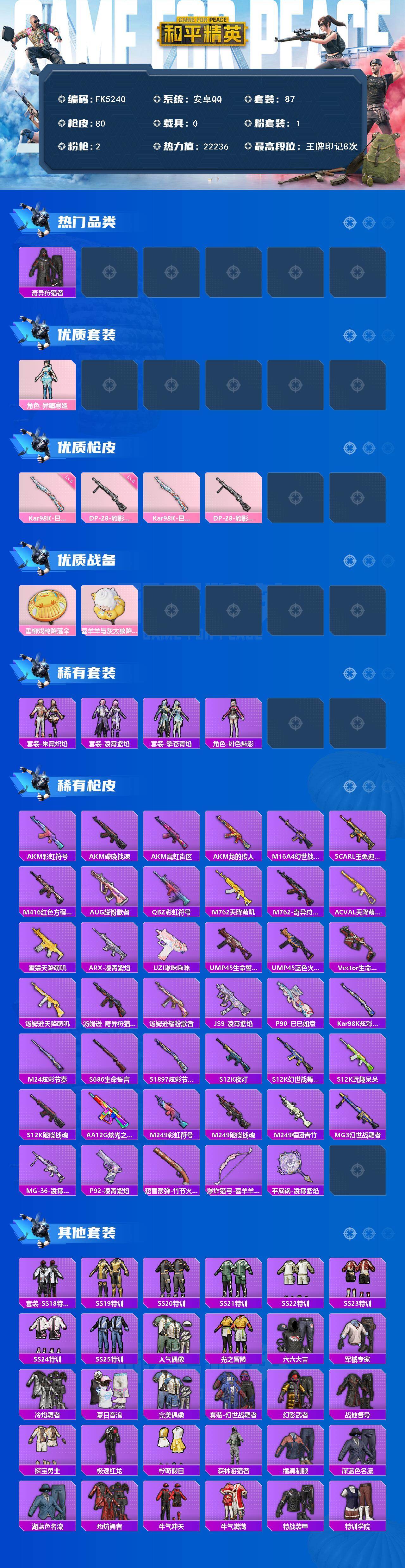 【FK5240】87套装/枪械2/装备68/战备54/王牌印记8/热力值222