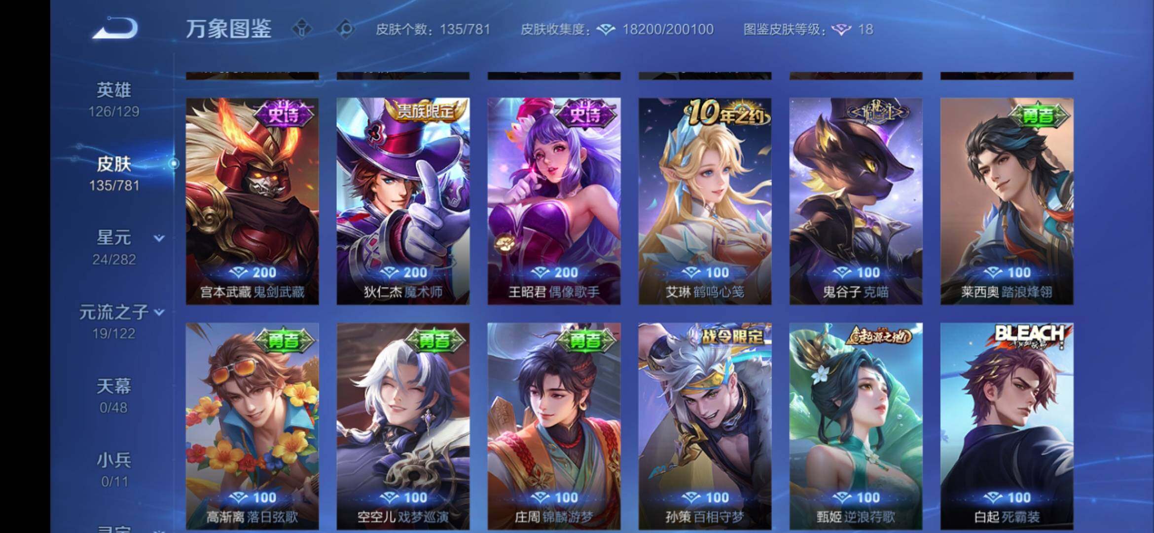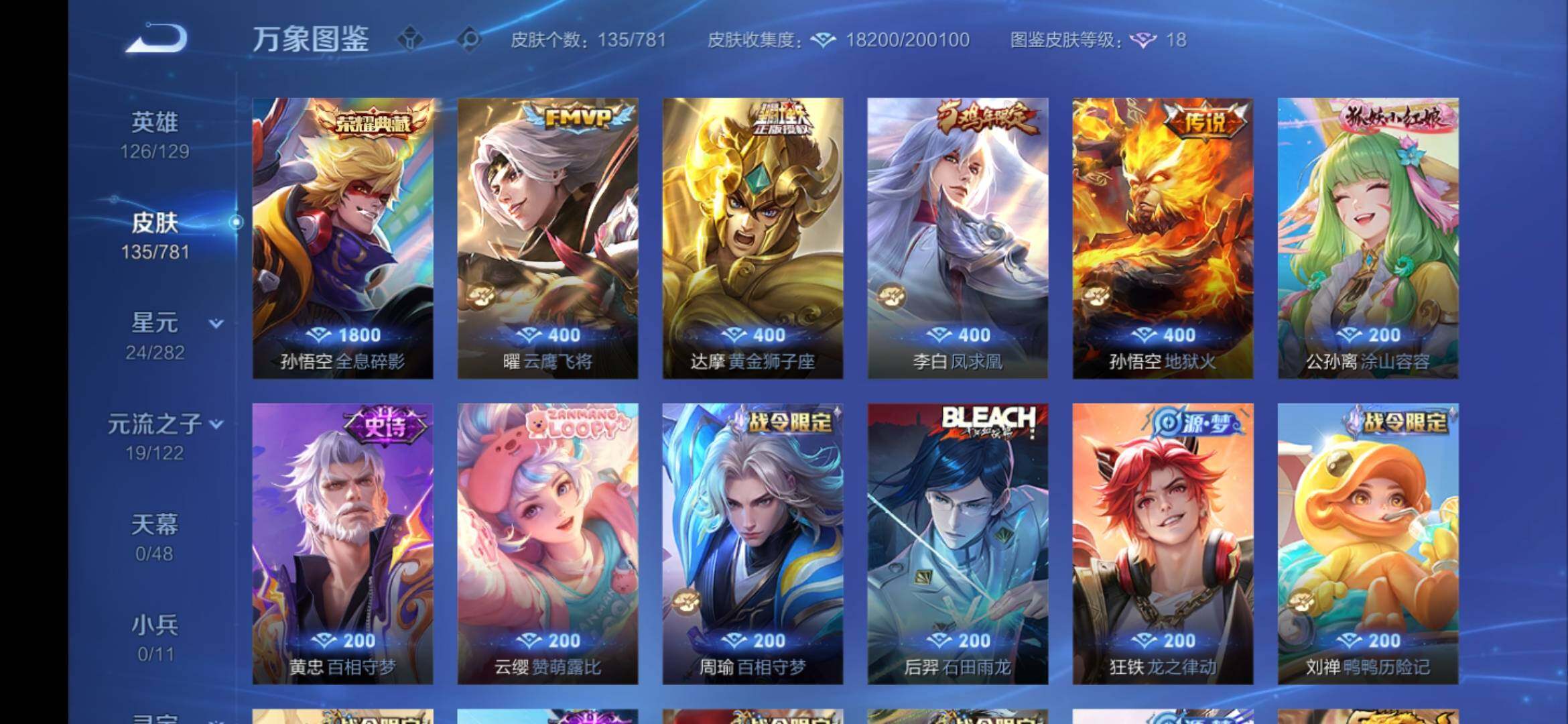 /安卓Q-V6-126英雄-135皮肤-1典藏-2星传说皮肤-4传说-35史诗
