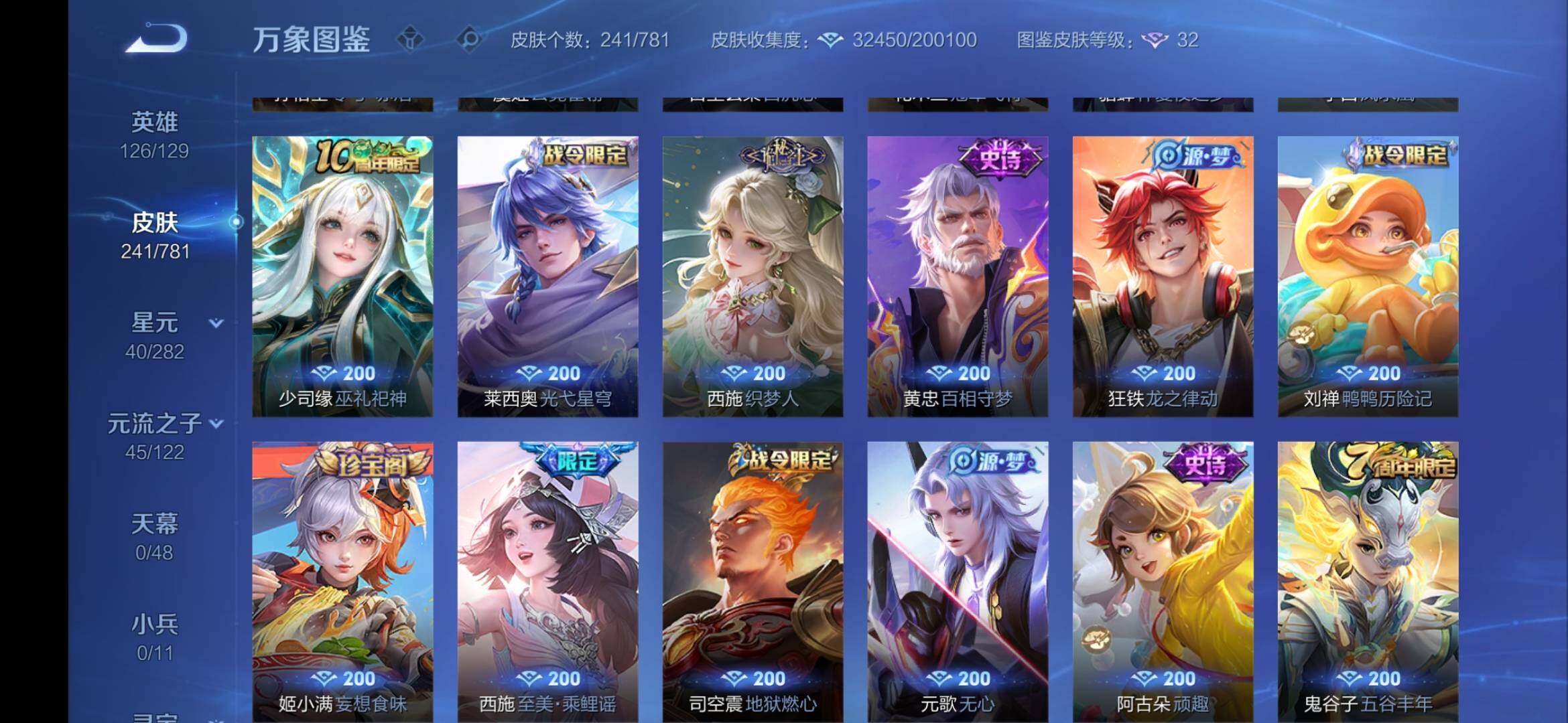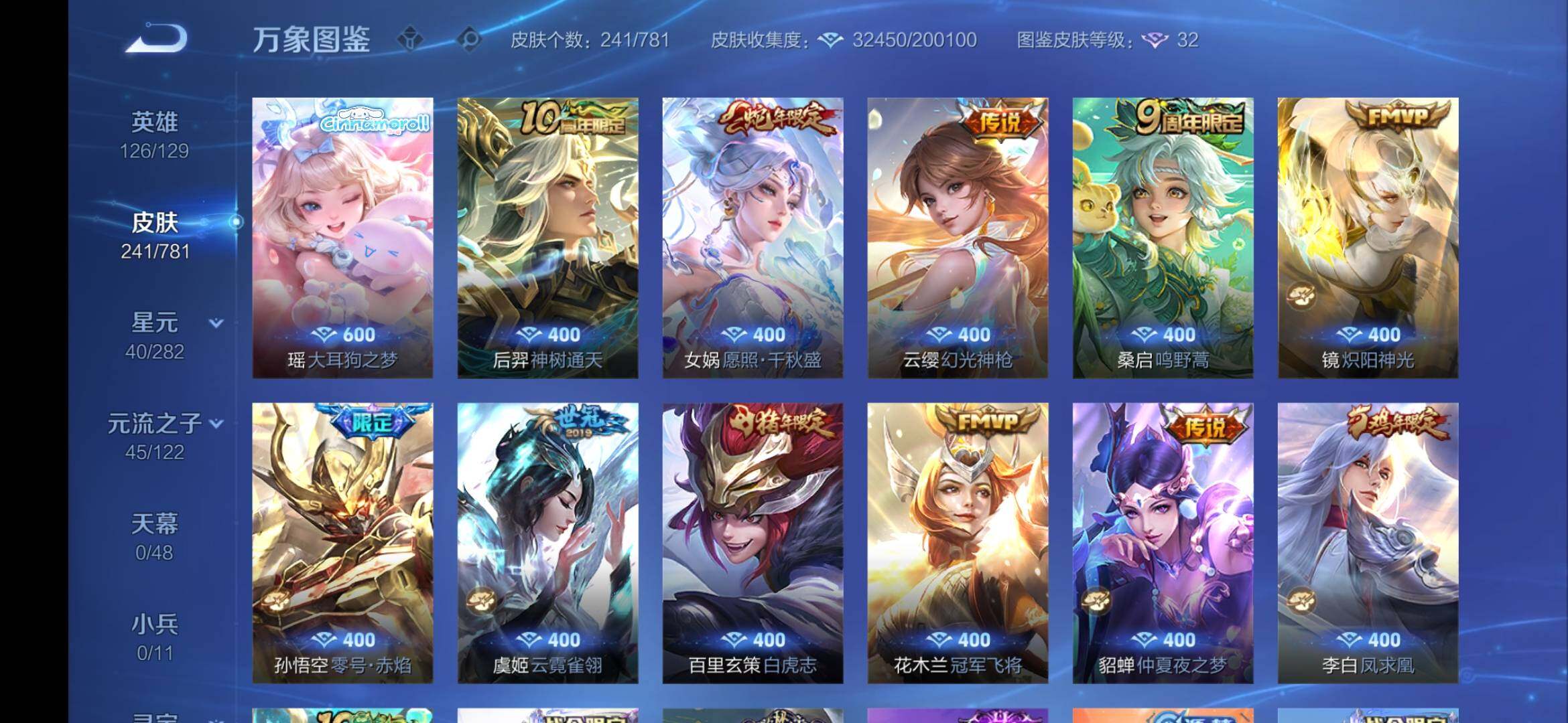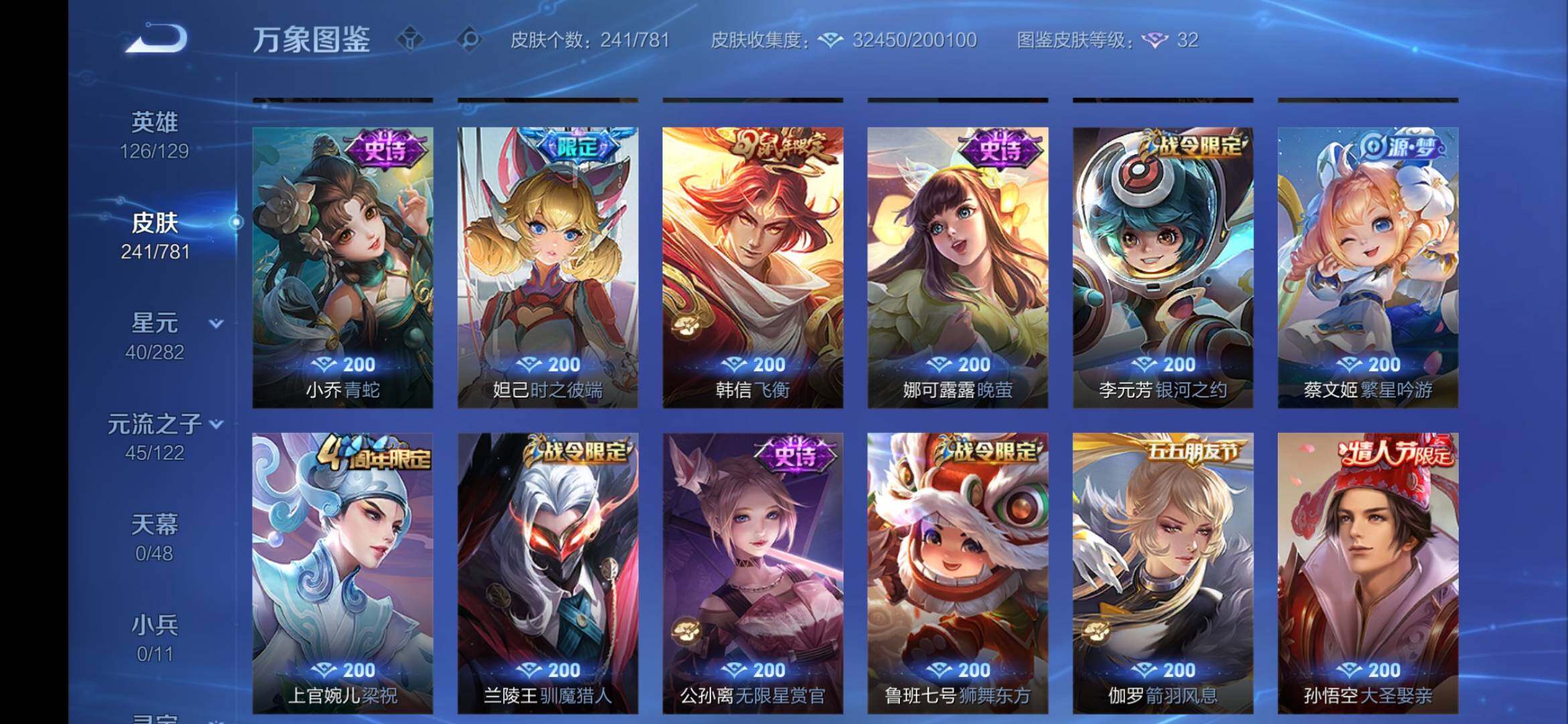 安卓Q-V7-尊贵铂金IV段位-126英雄-241皮肤-1珍品传说-1星传说-