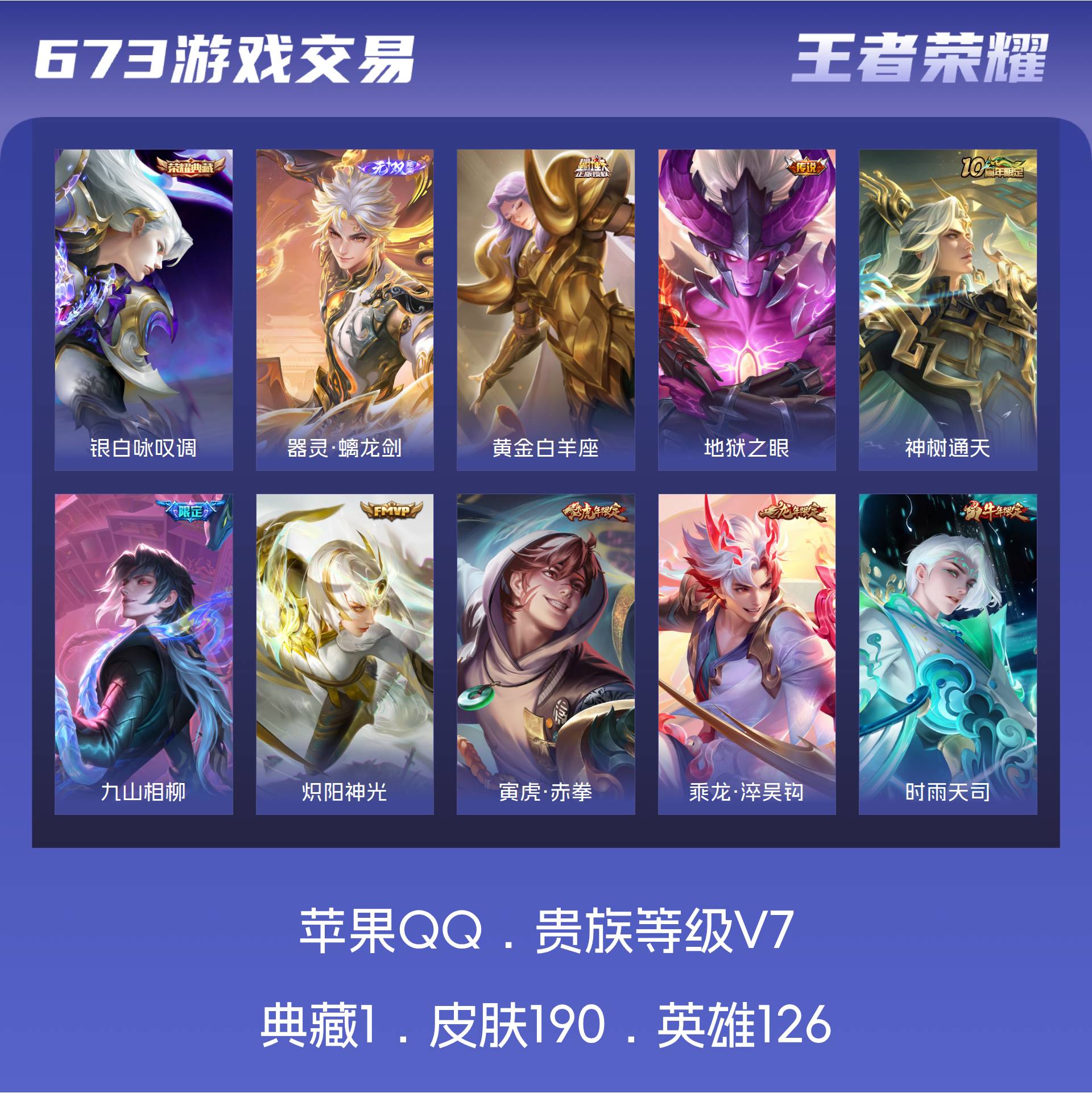 V7 皮肤190 英雄126 至尊星耀 荣耀典藏1 无双皮肤1 传说14 其他皮肤178