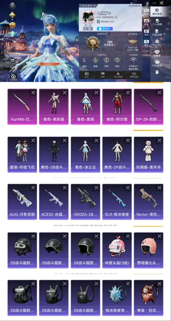 安卓Q区-女号-3粉2特效【可二次 地铁满天赋 3粉装 阿尔茜 茉莉星 美琪 冰公主 2P战斗服款 2B战斗服款 2特效枪 王者22皮1传说】-22880热力值-65套装-83枪皮-黄金I-游戏40级 【优质套装】: 阿尔茜 茉莉星 美琪 【特效枪等级】:Kar98K-巳巳如意(四级- Kar98K-巳巳如意) 【优质武器皮肤】: Kar98K-巳巳如意 【稀有武器皮肤】: Q