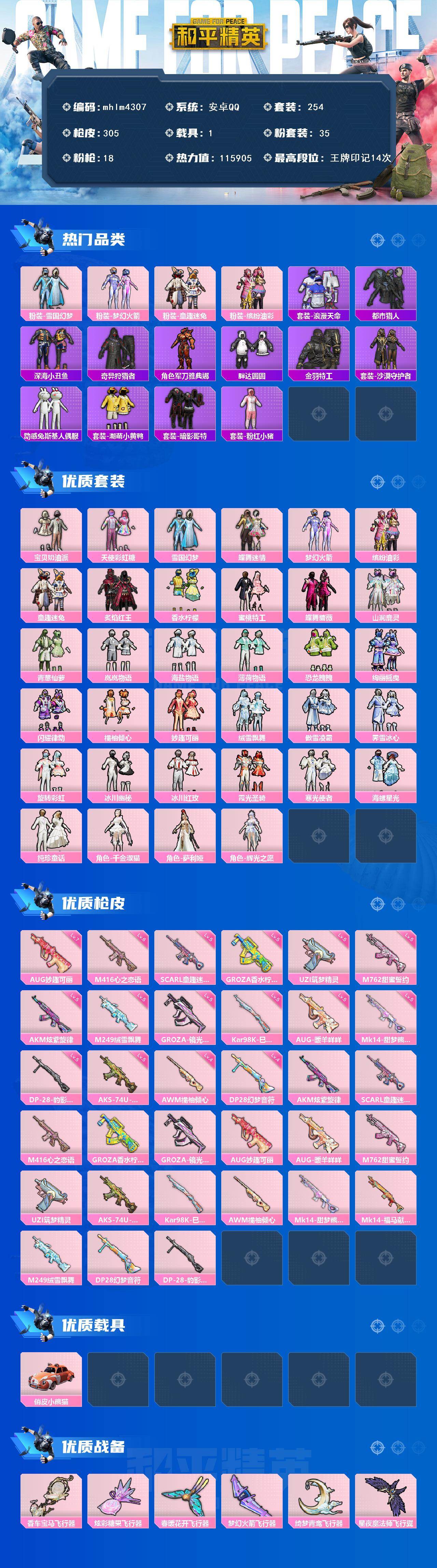 【mhlm4307】安卓 手Q-35粉装-18特效枪-1载具-10粉色飞行器-115905热力值-14王牌印记-254套装-305枪皮