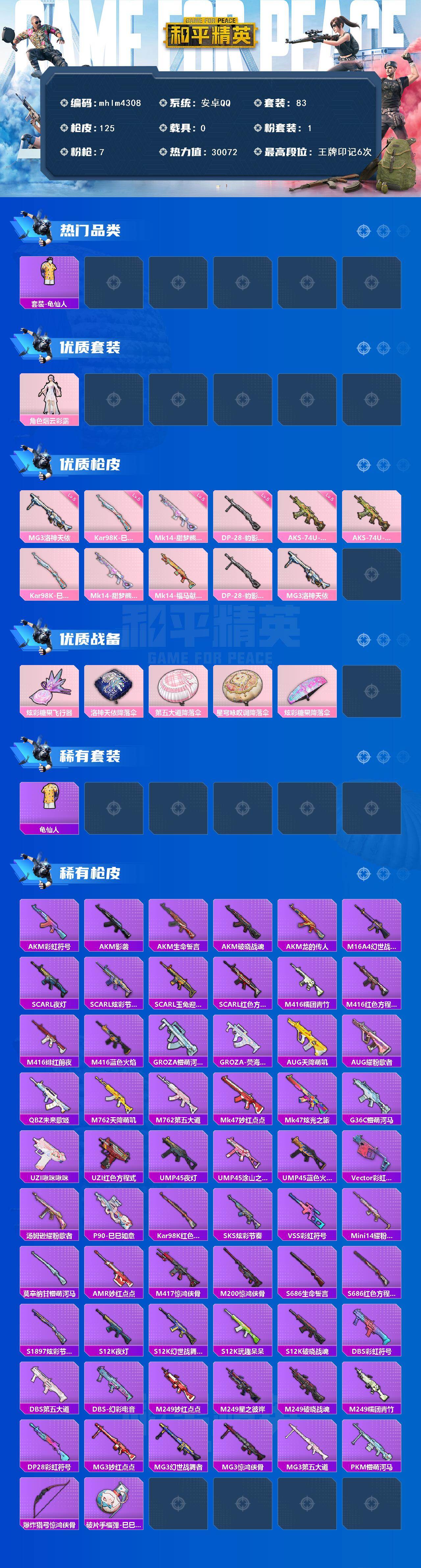 【mhlm4308】安卓 手Q-1粉装-7特效枪-0载具-1粉色飞行器-30072热力值-6王牌印记-83套装-125枪皮