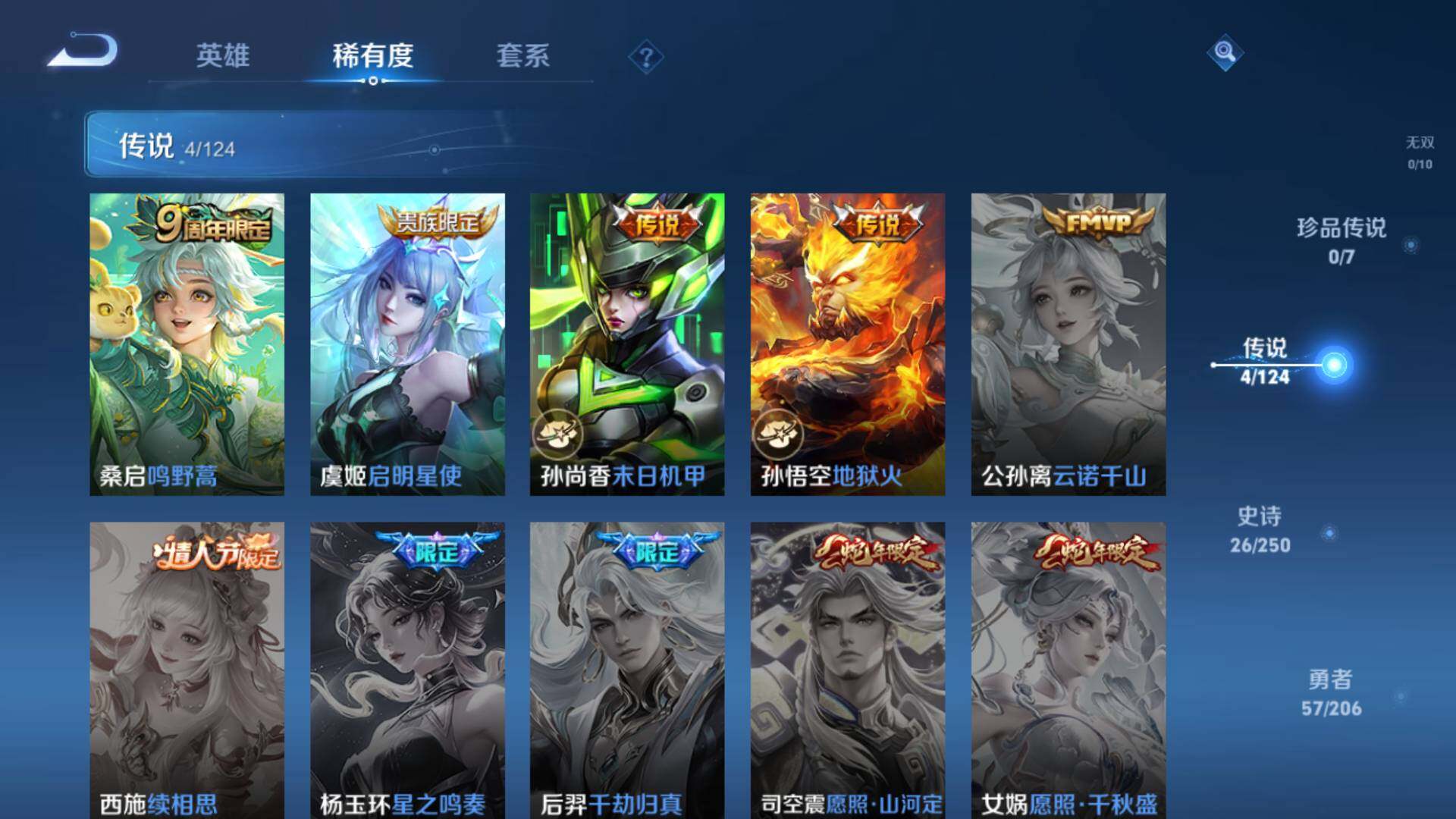 【传说皮肤】:孙悟空地狱火,孙尚香末日机甲,虞姬启明星使,桑启鸣野蒿