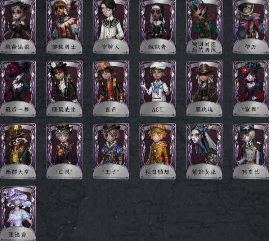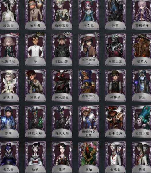 ,精致的笑容(小丑),寒香舞(空军),十三娘(红蝶),不屈的信仰(先知),索菲亚(昆虫学者),川上富江(梦之巫女),小丑皇(小丑),流萤(医生),浴火绯花(医生),幽灵公主(园丁),寻宝贵族(魔术师),柴郡猫(佣兵),小红帽(机械师),女武神(舞女),暗金蛋糕(盲女),花嫁(红蝶),白无垢(红蝶),死灵师(黄衣之主),摩根勒菲(祭司),引路人(祭司),今夜不再(调香师),亚兹拉尔(摄影师)