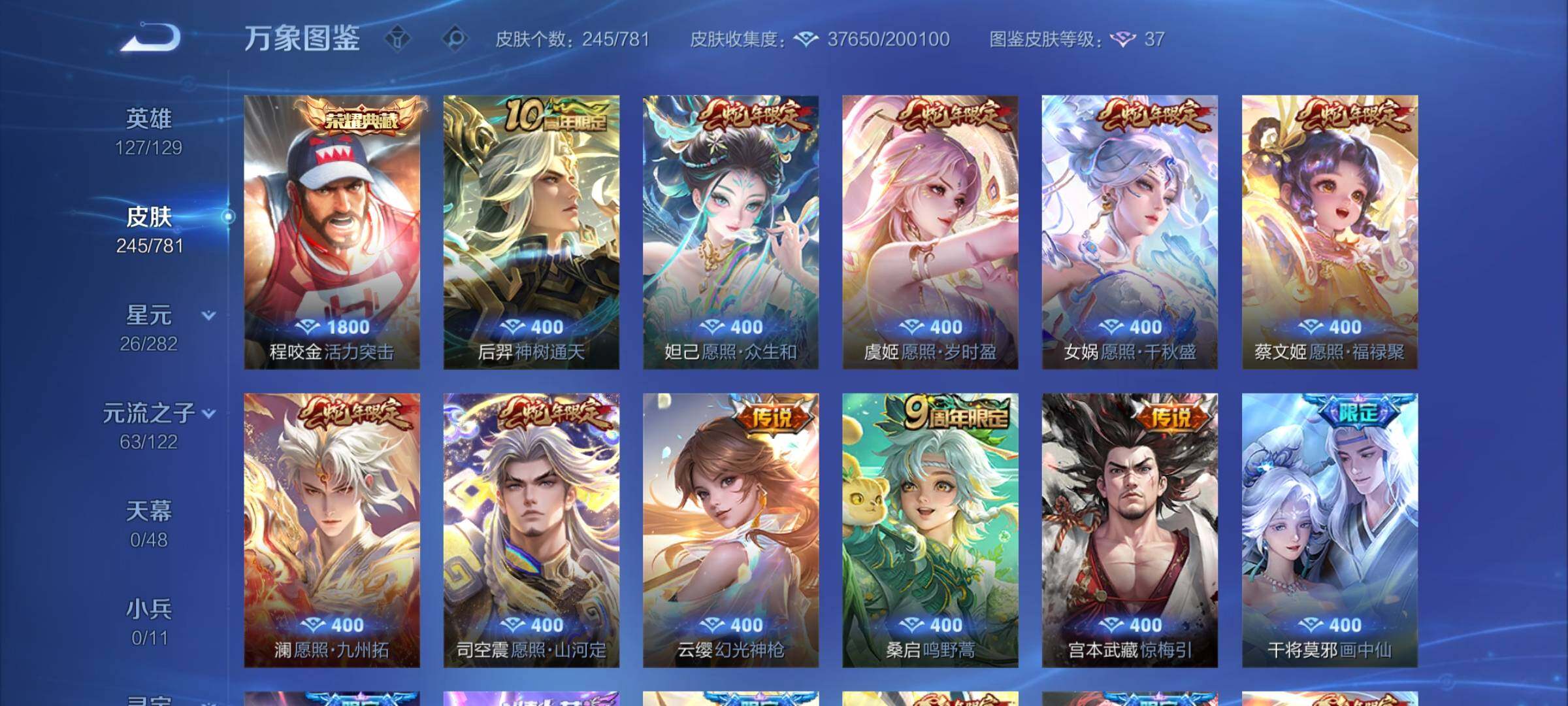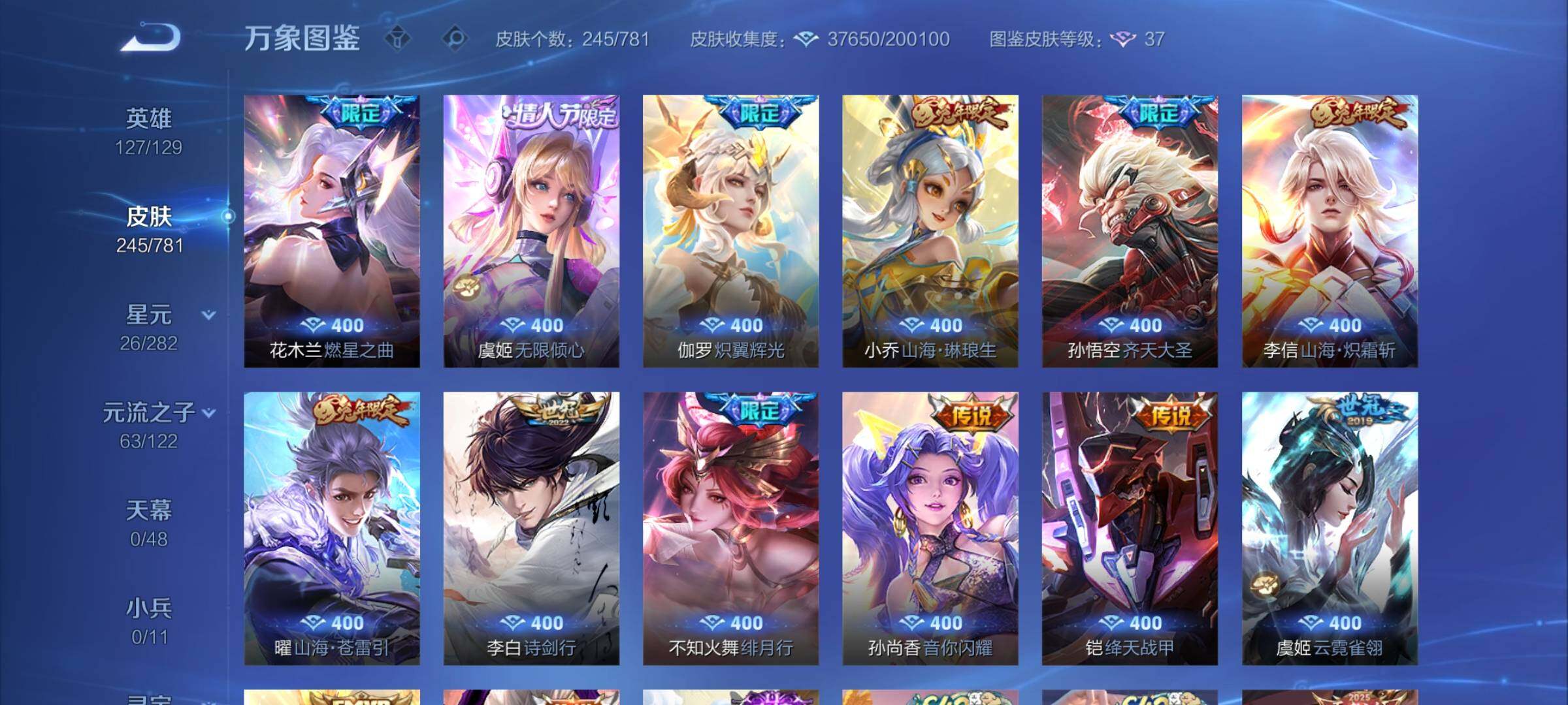 精品推荐·满蛇年限定·满兔年限定·活力突击·愿照山河定·愿照众生和·惊梅引·齐天大圣·山海苍雷引·山海炽霜斩·诗剑行·绯月行·傲雪梅枪·幽冥之眼·可二次】YXw16639-安卓Q-127英雄-245皮肤-6王者印记-150铭文-贵族积分4w【贵族7】【1典藏·2星传说·25传说·32按键】【因赛季更新游戏段付以上号为准!】
