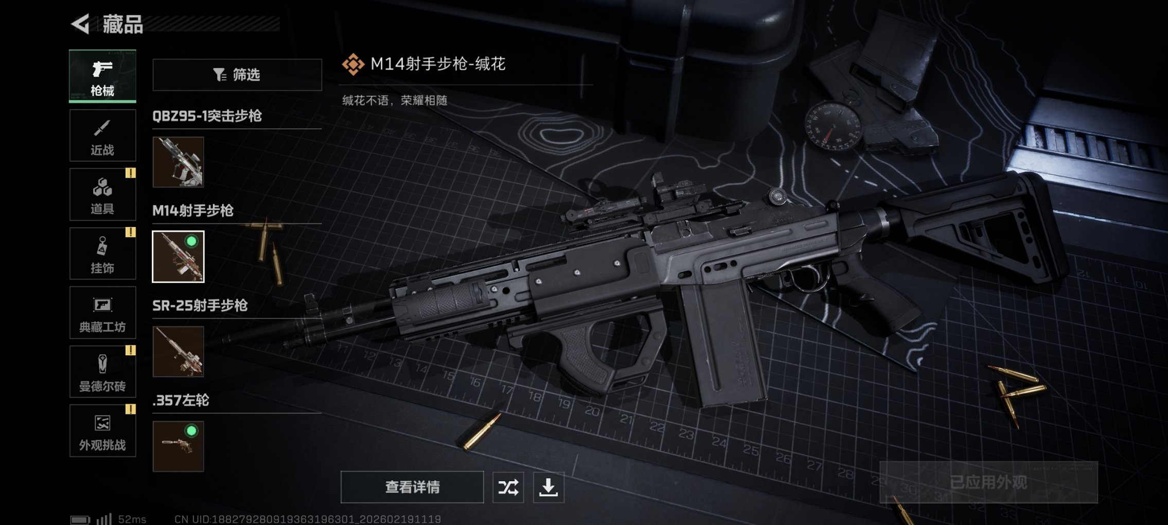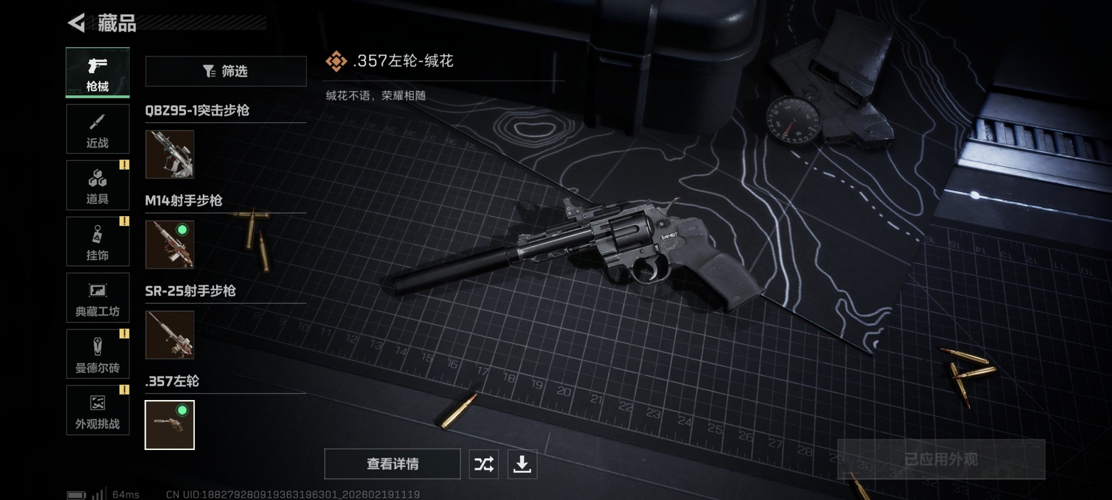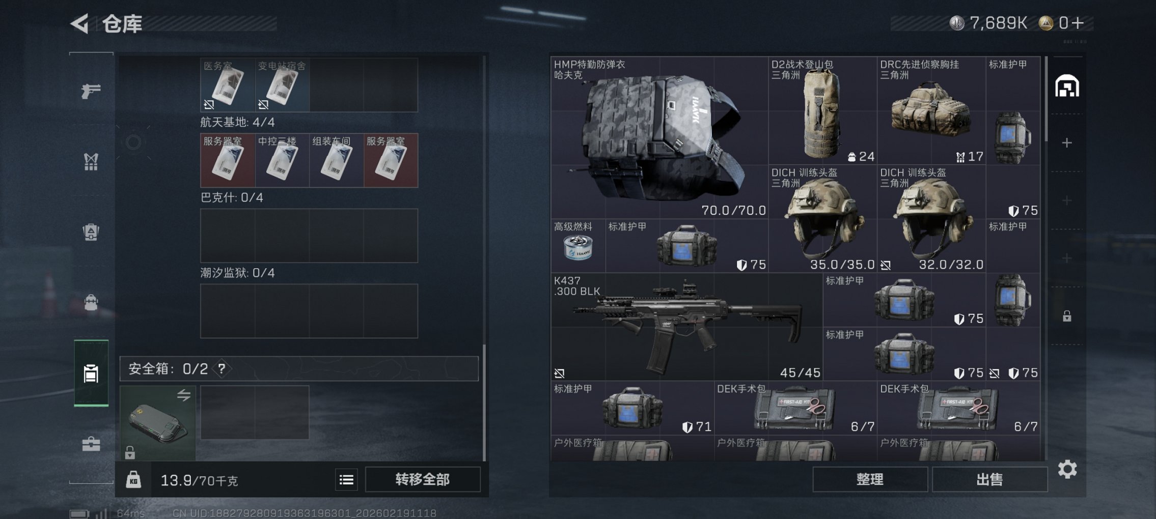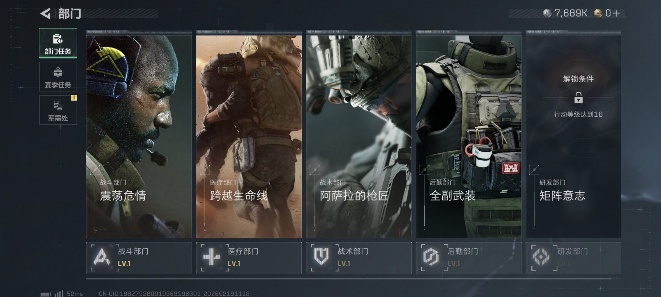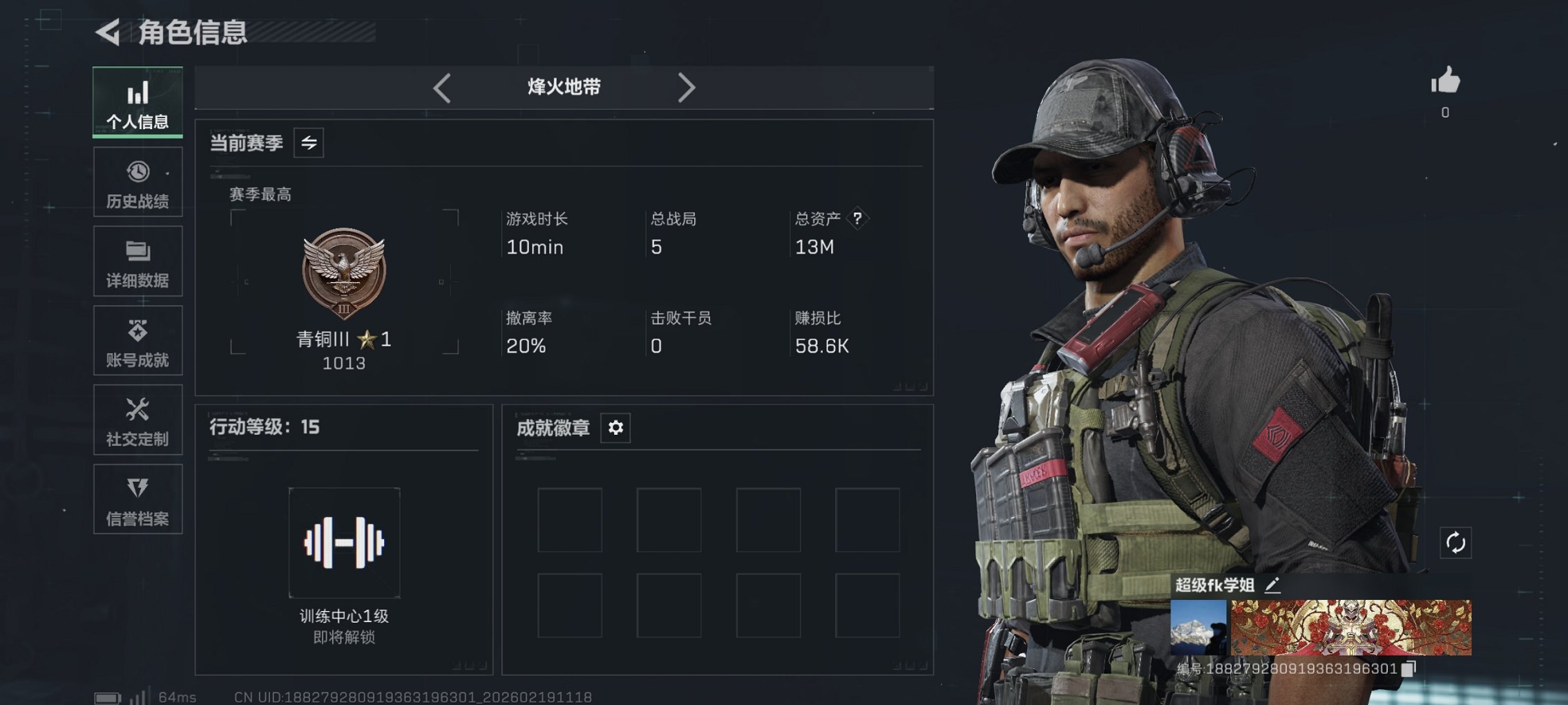 可二次【红皮威龙】总资产13M,哈夫币7,689K,行动等级:15,干员红皮数量:1,仓库等级:4级,训练中心等级:0级,靶场等级:0级,干员皮肤:1,枪皮:6