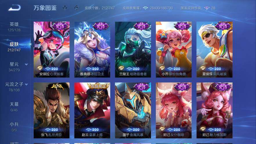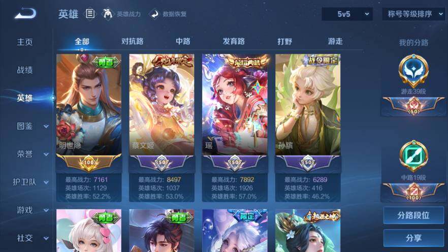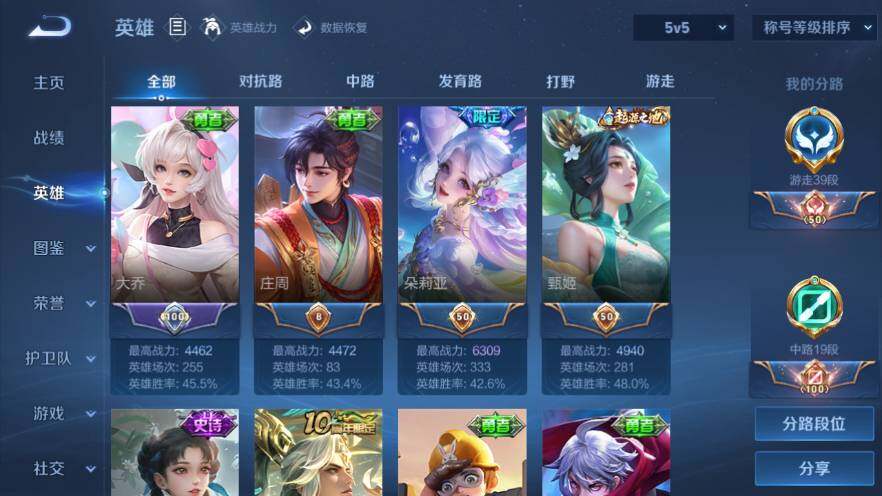 /巅峰游走39段-1金标-巅峰中路-安卓Q-V7-215皮肤-1典藏-1珍品-4传说-57史诗-5400紫星币-10个按键
