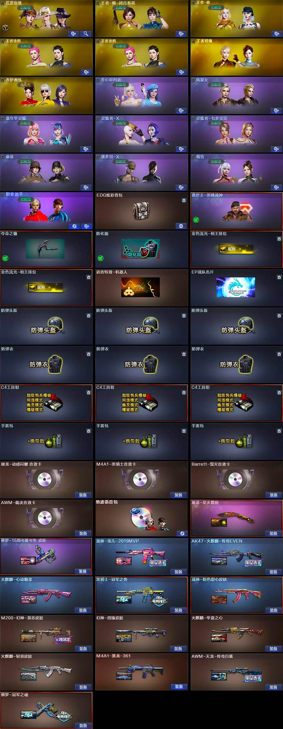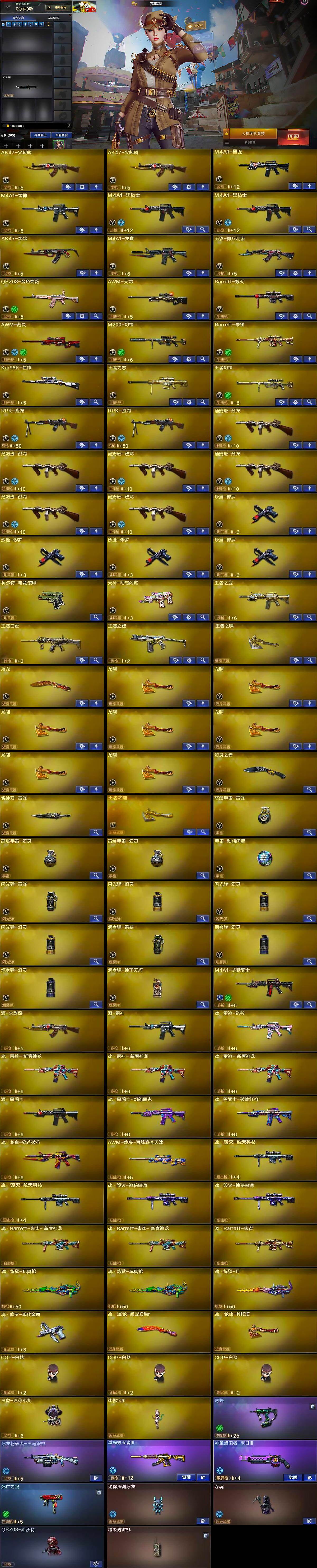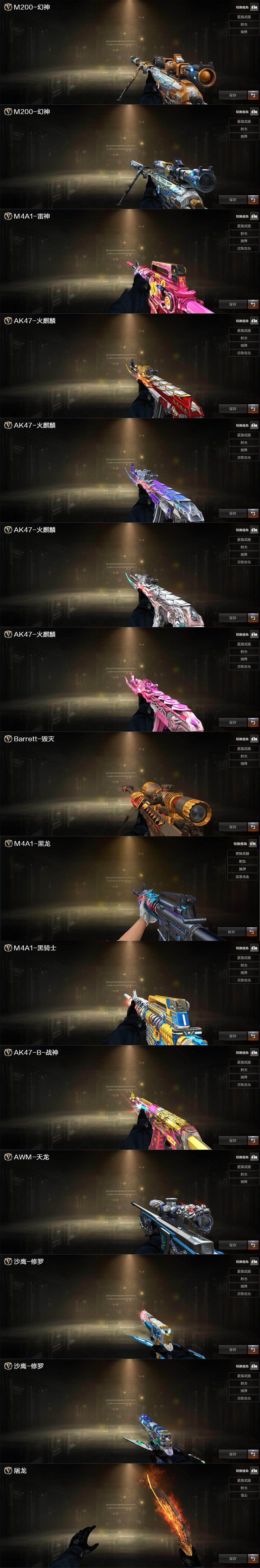 【热门武器】:王者白虎,QBZ03-金色蔷薇,M200-幻神,死亡之眼,QBZ03-街机,Kar98K-星神,毒蜂,M4A1-黑骑士*2,汤姆逊-烈龙*6,RPK-盘龙*2,降世魔童,COP-白鲨*3,沙鹰-修罗*4