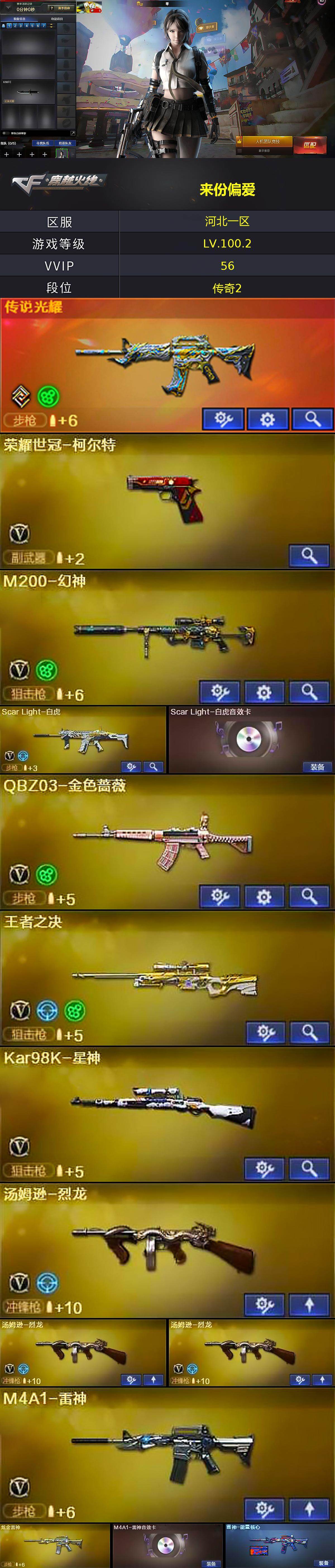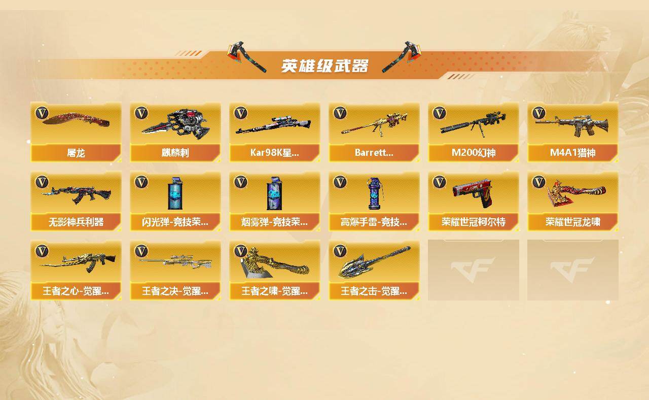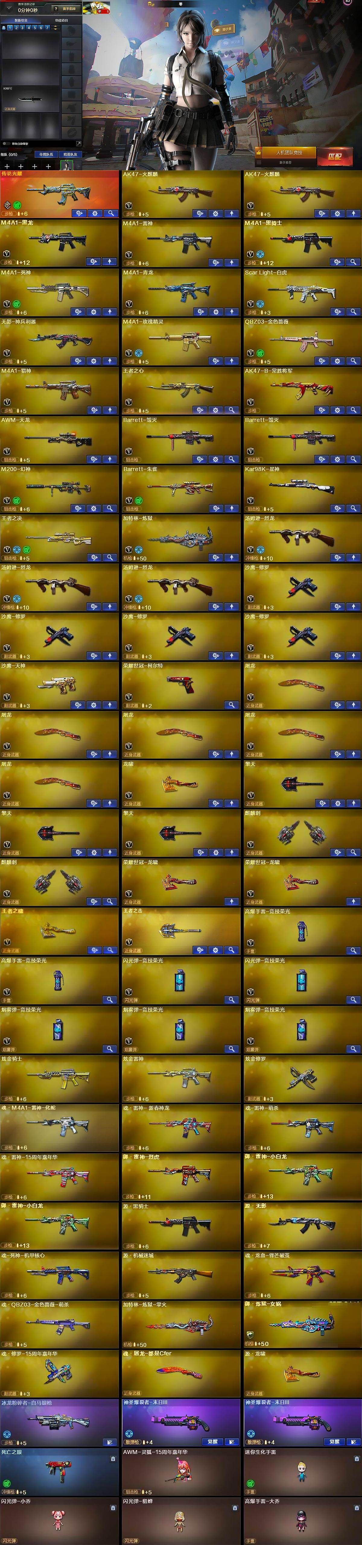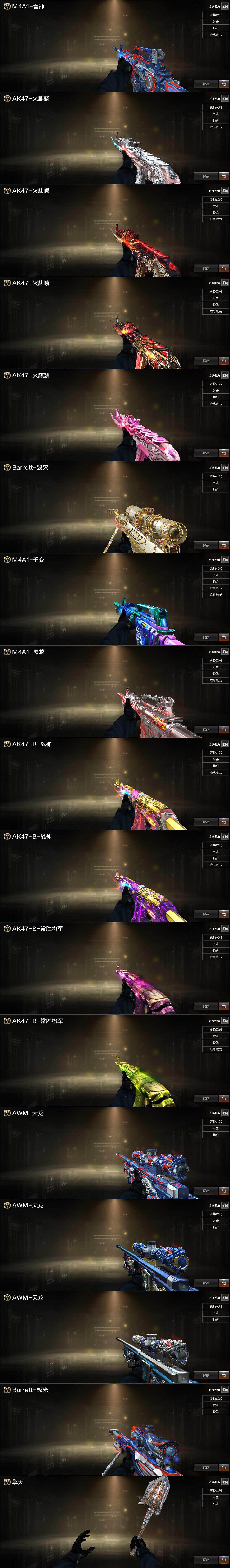 【热门武器】:传说光耀,QBZ03-金色蔷薇,Scar Light-白虎,M4A1-青龙,M200-幻神,死亡之眼,荣耀世冠-柯尔特,Kar98K-星神,M4A1-黑骑士,汤姆逊-烈龙*3,加特林-炼狱,降世魔童,沙鹰-修罗*4,荣耀世冠-龙啸*2,金刚伞