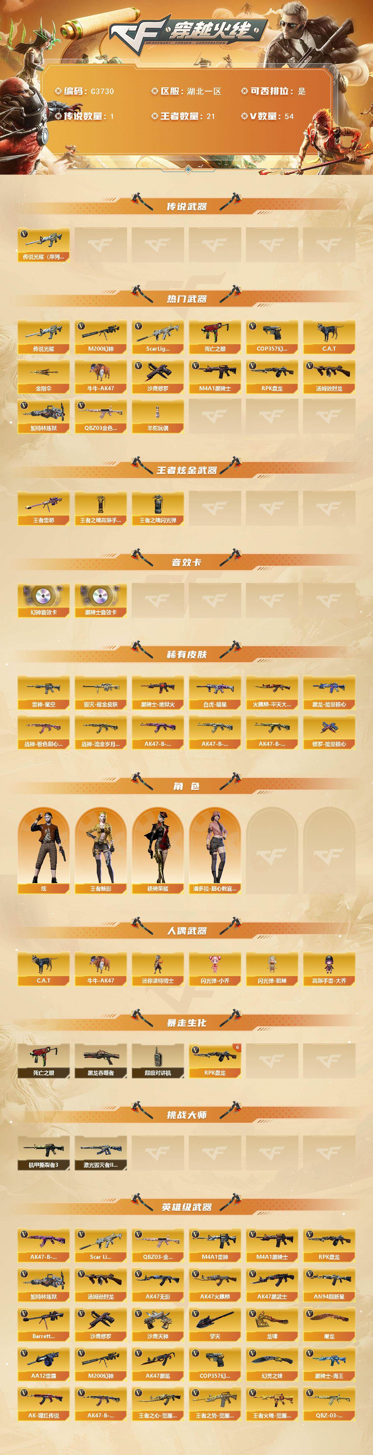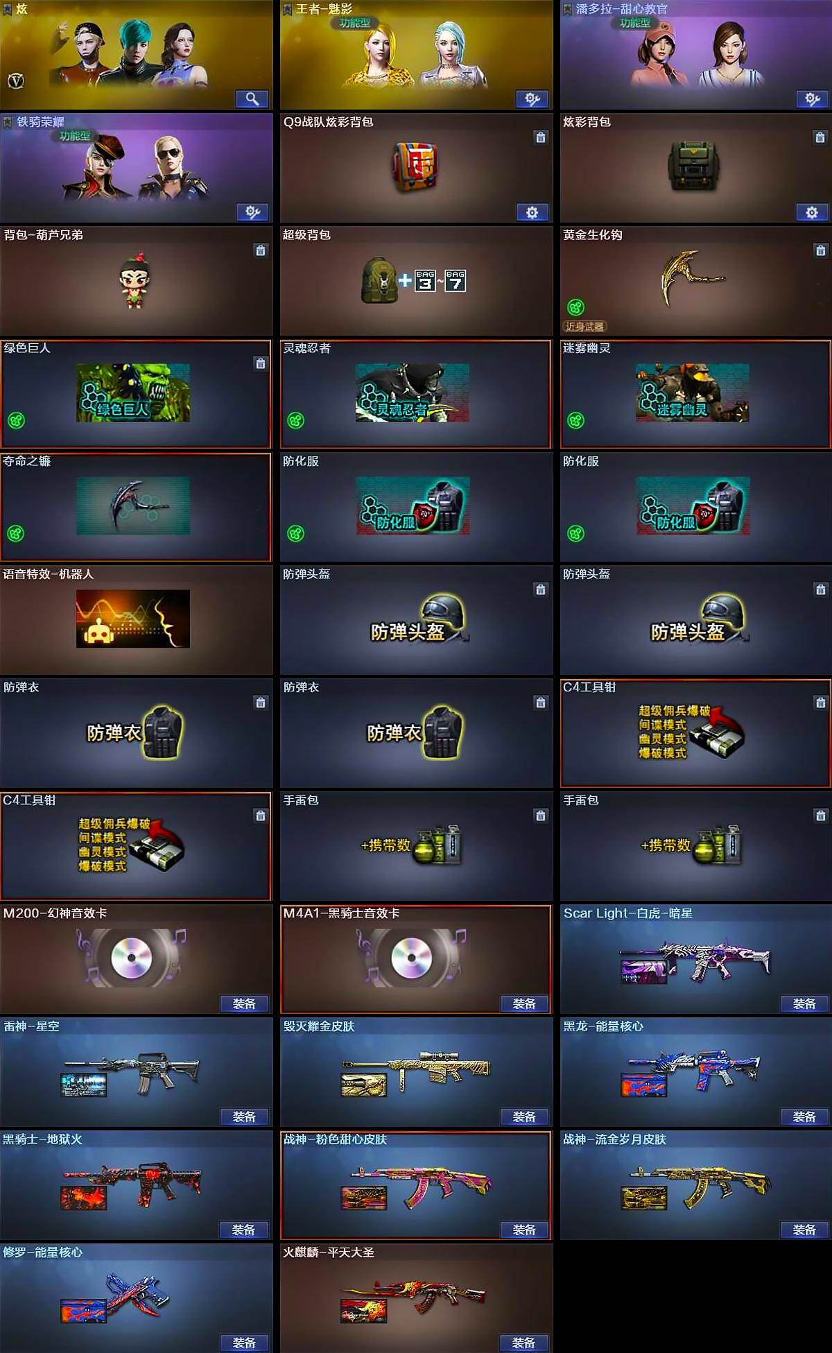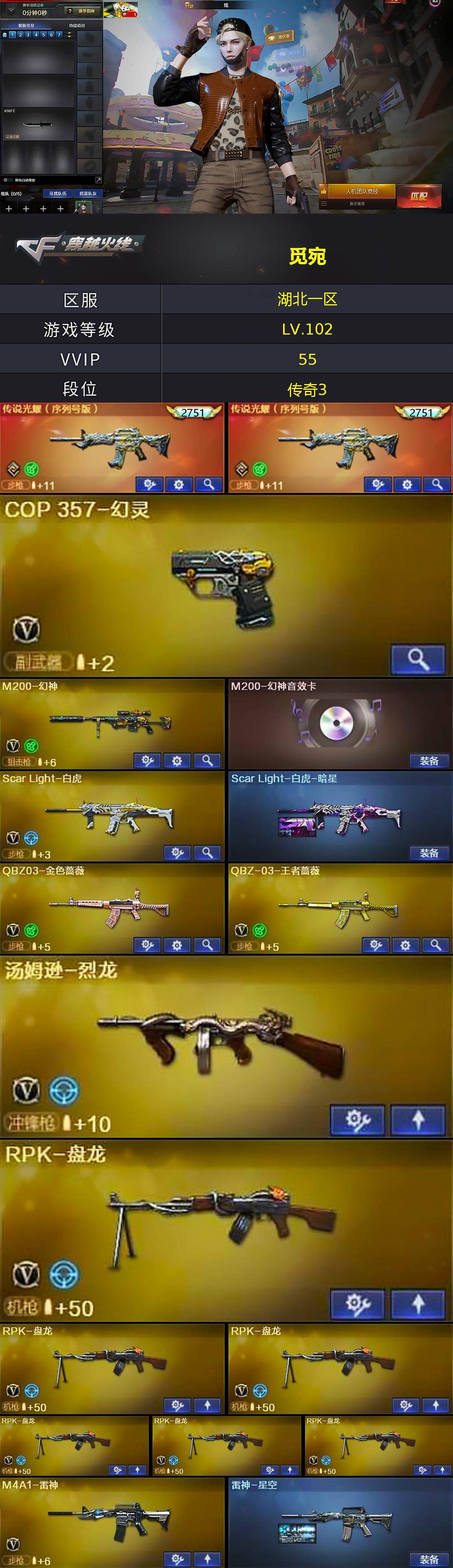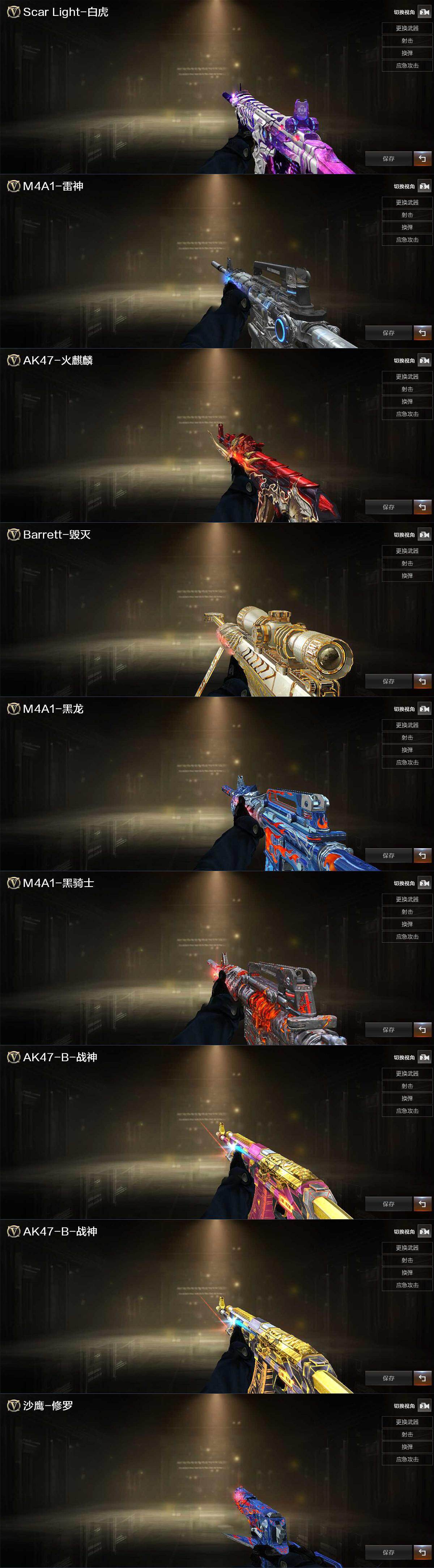 【热门武器】:传说光耀,QBZ03-金色蔷薇,Scar Light-白虎,M200-幻神,死亡之眼,C.A.T,牛牛-AK47,M4A1-黑骑士,汤姆逊-烈龙,RPK-盘龙*6,加特林-炼狱,羊驼玩偶,COP 357-幻灵,沙鹰-修罗*5,金刚伞