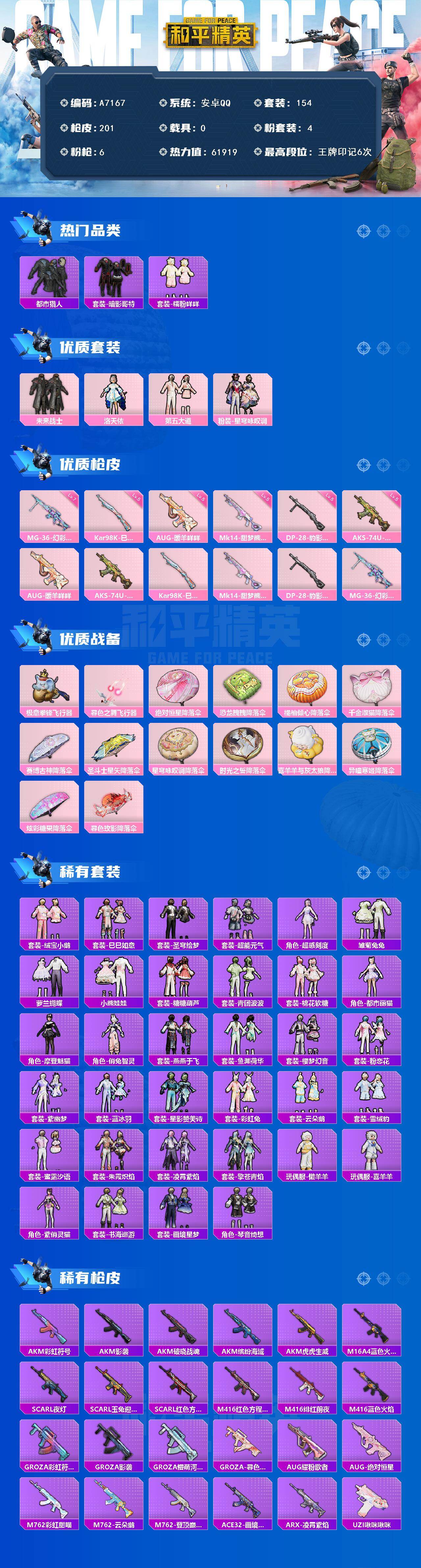 【A7167】安卓 【套装-都市猎人/套装-暗影哥特/AUG-暖羊咩咩(五级)】手Q-4粉装-6特效枪-0载具-3粉色飞行器-61919热力值-6王牌印记-154套装-201枪皮
