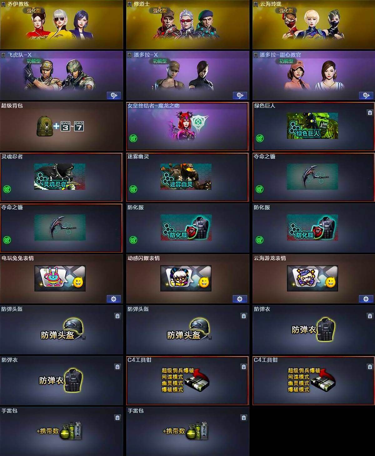 【道具】:超级背包,女皇终结者-魔龙之吻,绿色巨人,灵魂忍者,迷雾幽灵,夺命之镰*2,防化服*2,电玩兔兔表情,动感闪耀表情,云海游龙表情,防弹头盔*2,防弹衣*2,C4工具钳*2,