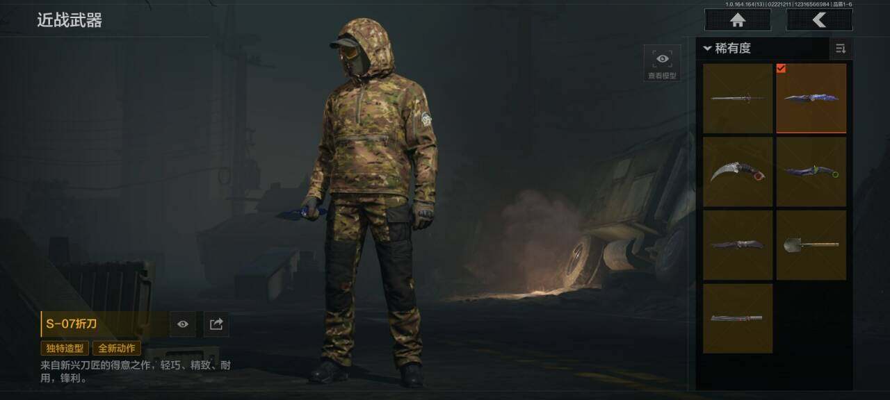 段位:王牌/仓库价值(百万):69/急袭弯刀/下弦月/百炼恒常/S-07折刀/野战折刀/工兵铲/来战开山刀/白蔷薇斯黛拉/