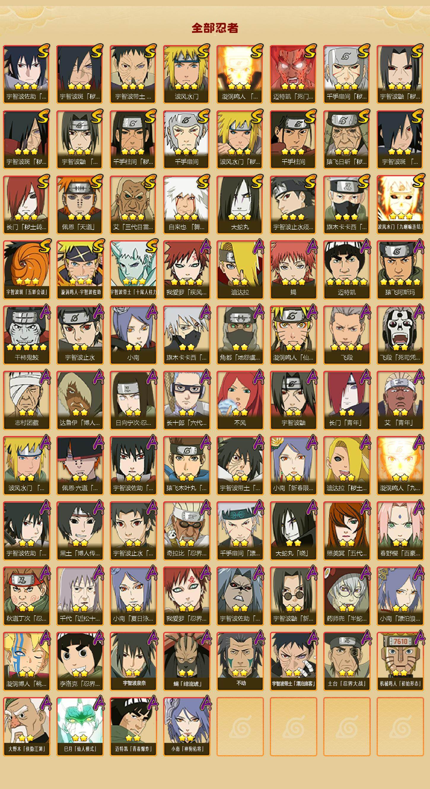 【HYYT269】V11/S忍27/A忍57/秽土转生-宇智波斑/2星大野木「侠隐江湖」/3星波风水门「九喇嘛连结」/3星宇智波带土「十尾人柱力」/五代目雷影-达鲁伊/死司凭血-飞段/宇智波止水/5星猿飞阿斯玛/须佐能乎-旗木卡卡西/2星小南「神驹佑将」/秽土转生-猿飞日斩/五代目水影-照美冥/千手扉间/3星蝎/5星迈特凯/新春限定-宇智波鼬/忍界大战-奇拉比/秽土转生-千手扉间/六代目水影-长十郎/2星蝎「绯流琥」/百豪-春野樱/死门-迈特凯/千手柱间/漂泊浪客-佩恩·六道/暴怒-宇智波带土/