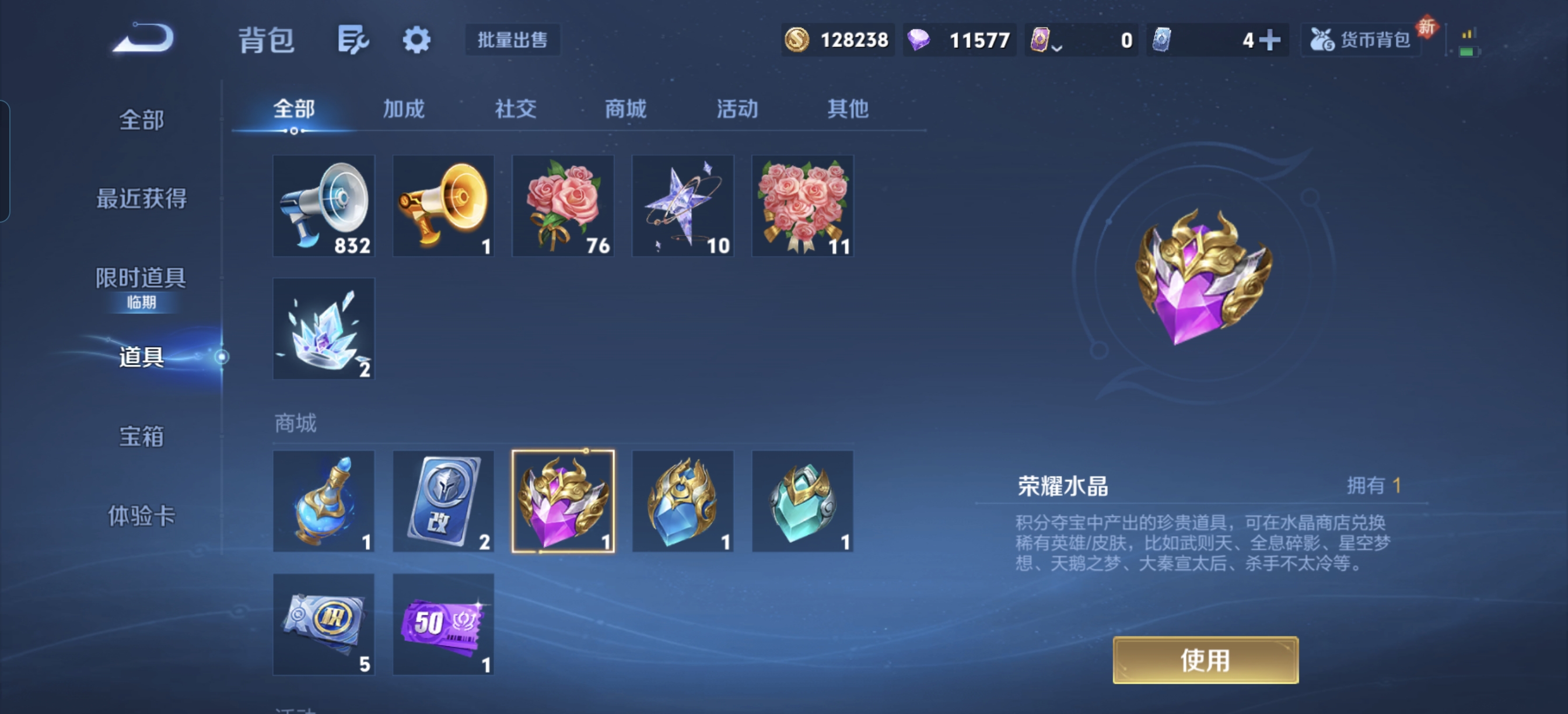 王者有一颗荣耀水晶没有使用,和平有很多抽的紫装,两套红装两个红装枪(m416和akm常用枪)一车一马