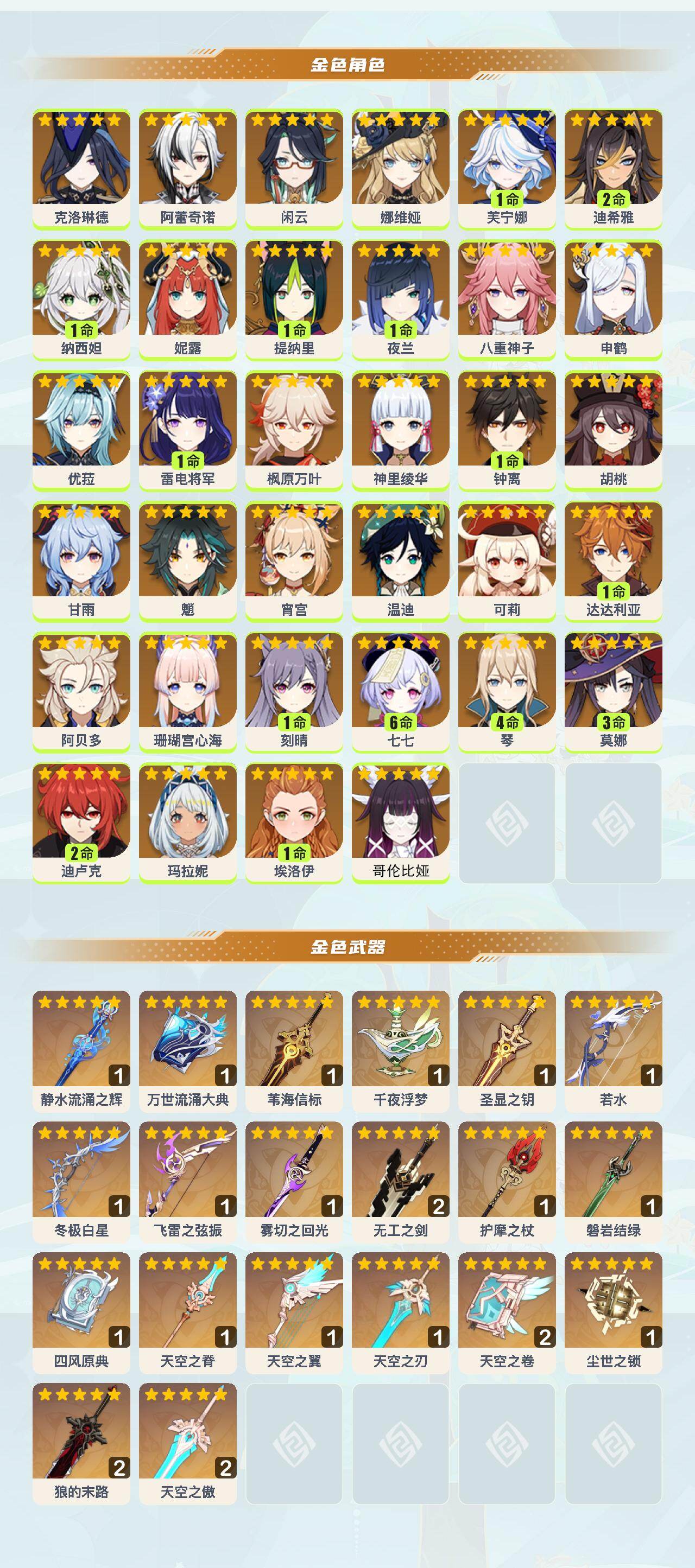 【YSYT777】60级/83黄/女主/34个五星角色/20个五星武器/0命哥伦比娅/1命夜兰/1命钟离/申鹤/优菈/甘雨/神里绫华/八重神子/1命雷电将军/1命刻晴/1命纳西妲/1命芙宁娜/妮露/珊瑚宫心海/宵宫/胡桃/可莉/娜维娅/闲云/枫原万叶/魈/温迪/4命琴/克洛琳德/1命提纳里/玛拉妮/1命达达利亚/阿蕾奇诺/2命迪希雅/2命迪卢克/阿贝多/3命莫娜/满命七七/0命埃洛伊/飞雷之弦振/若水/冬极白星/天空之翼/千夜浮梦/尘世之锁/四风原典/精2天空之卷/天空之脊/护摩之杖/苇海信标/
