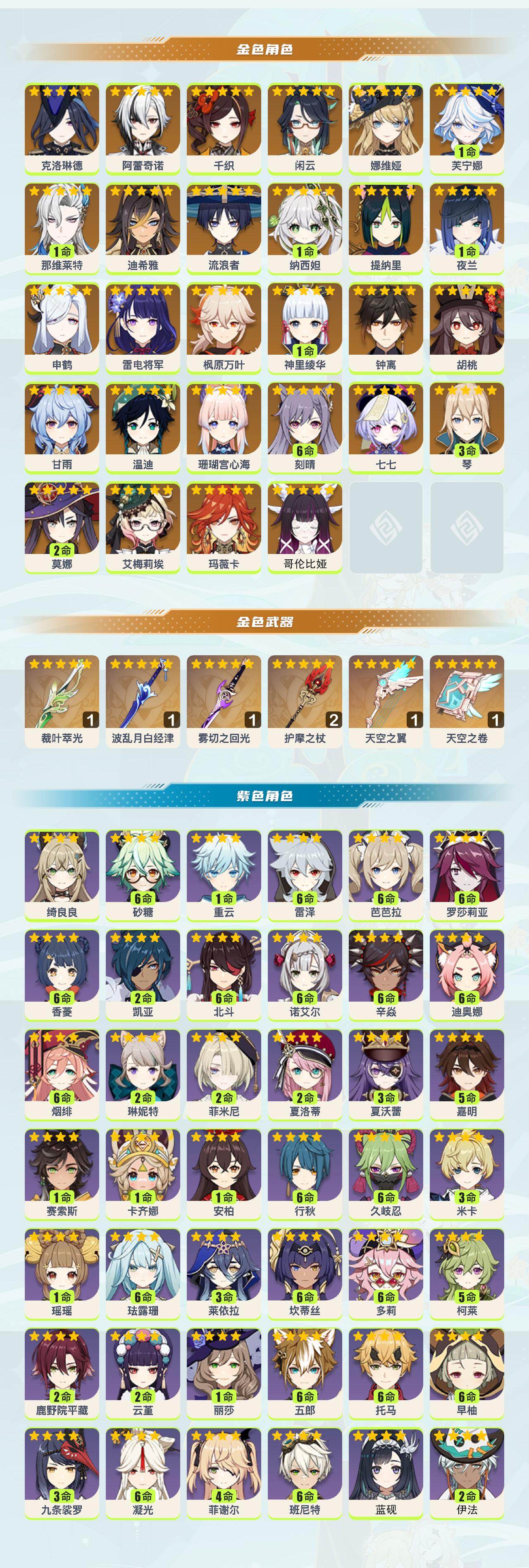 【YSZ3163】60级/男主/30个五星角色/0命哥伦比娅/玛薇卡/艾梅莉埃/克洛琳德/阿蕾奇诺/千织/闲云/娜维娅/1命芙宁娜/1命那维莱特/迪希雅/流浪者/1命纳西妲/提纳里/1命夜兰/申鹤/珊瑚宫心海/雷电将军/1命神里绫华/枫原万叶/胡桃/甘雨/钟离/温迪/3命琴/满命刻晴/2命莫娜/七七/裁叶萃光/波乱月白经津/雾切之回光/精2护摩之杖/天空之卷/天空之翼/2命伊法/0命蓝砚/1命卡齐娜/1命赛索斯/5命嘉明/3命夏沃蕾/2命夏洛蒂/2命菲米尼/2命琳妮特/绮良良/3命米卡/瑶瑶/满