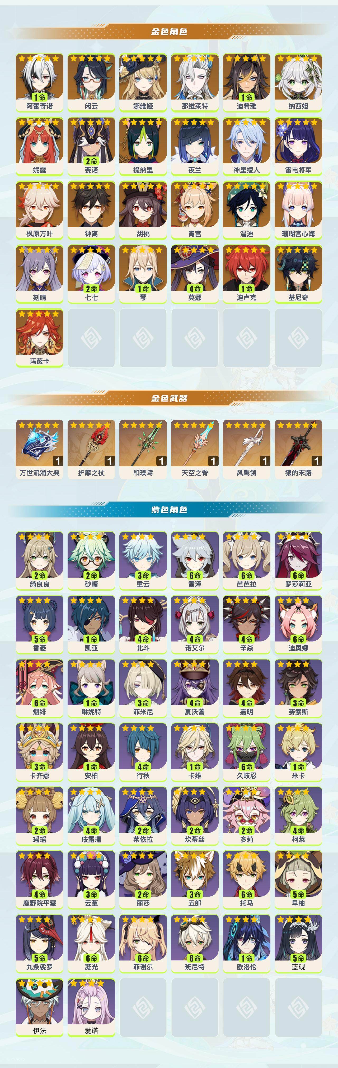 【YSZ3164】60级/男主/28个五星角色/玛薇卡/基尼奇/1命阿蕾奇诺/闲云/娜维娅/那维莱特/1命迪希雅/纳西妲/妮露/2命赛诺/提纳里/夜兰/神里绫人/珊瑚宫心海/雷电将军/宵宫/枫原万叶/胡桃/钟离/温迪/1命琴/刻晴/1命迪卢克/4命莫娜/2命七七/万世流涌大典/护摩之杖/和璞鸢/狼的末路/风鹰剑/天空之脊/0命爱诺/0命伊法/5命蓝砚/0命欧洛伦/3命卡齐娜/3命赛索斯/4命嘉明/4命夏沃蕾/3命菲米尼/琳妮特/2命绮良良/卡维/1命米卡/2命瑶瑶/4命珐露珊/2命莱依拉/2命坎
