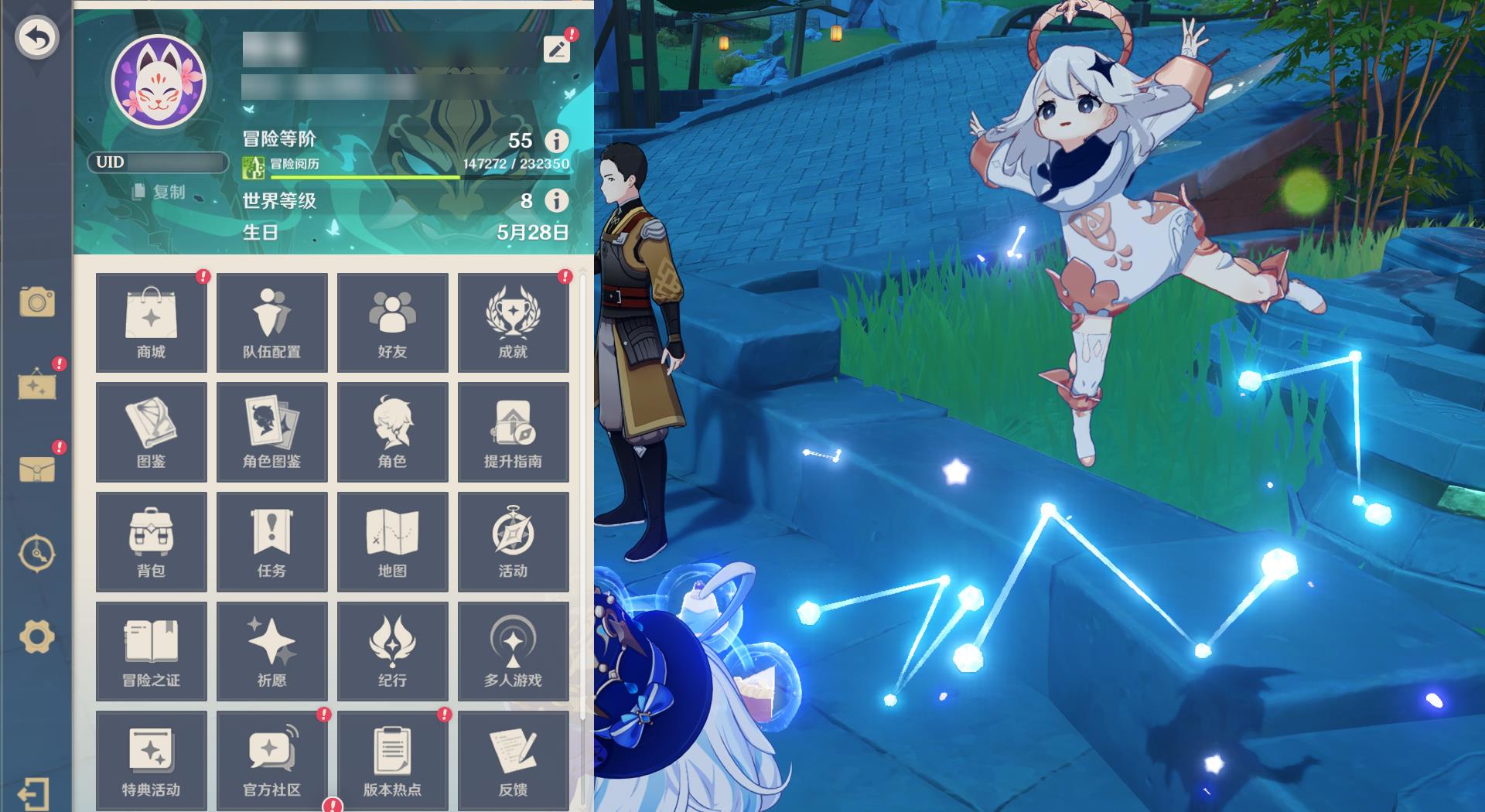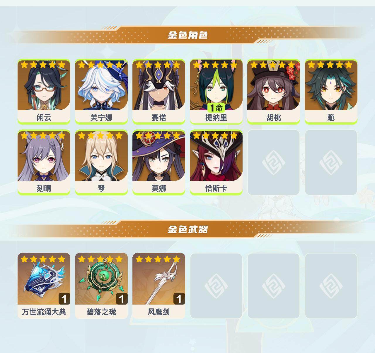 55级/15黄/女主/10个五星角色/4个五星武器/芙宁娜/魈/胡桃/赛诺/1命提纳里/琴/闲云/恰斯卡/刻晴/莫娜/风鹰剑/万世流涌大典/碧落之珑