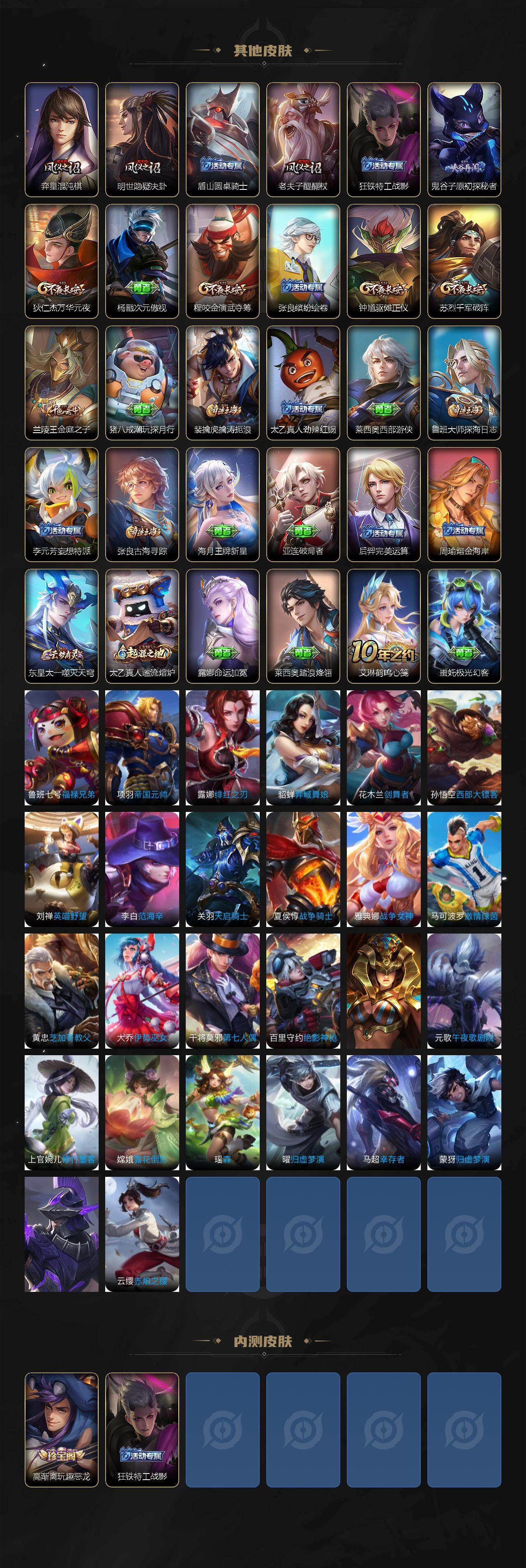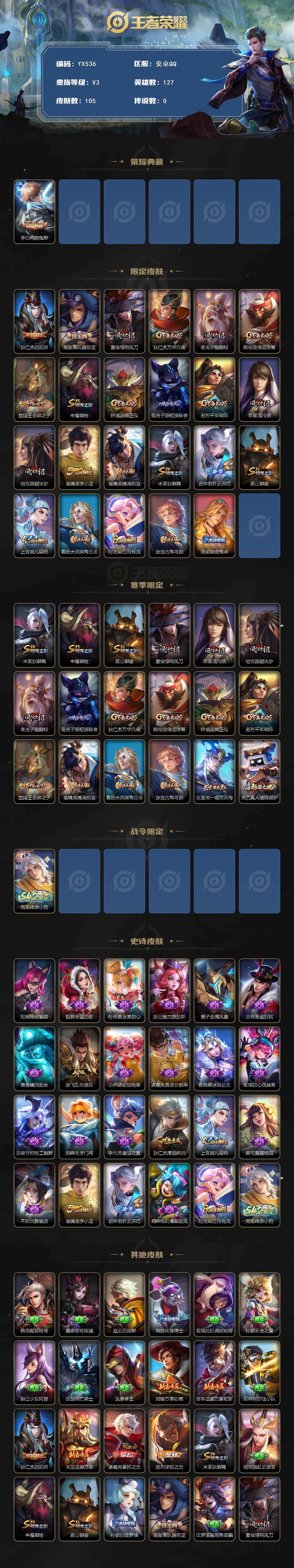 【鸣剑曳影】105皮肤1典藏23史诗 狄仁杰阴阳师,高渐离玩趣恶龙,夏侯惇朔风刀,狄仁杰万华元夜,老夫子醍醐杖,程咬金演武夺筹,兰陵王金庭之子,牛魔御旌,钟馗驱傩正仪,鬼谷子原初探秘者,苏烈千军破阵,弈星混沌棋,明世隐疑决卦,裴擒虎李小龙,裴擒虎擒涛扼浪,米莱狄御霄,云中君纤云弄巧,盾山御銮,上官婉儿梁祝,鲁班大师探海日志,阿古朵江河有灵,张良古海寻踪,周瑜熔金海岸