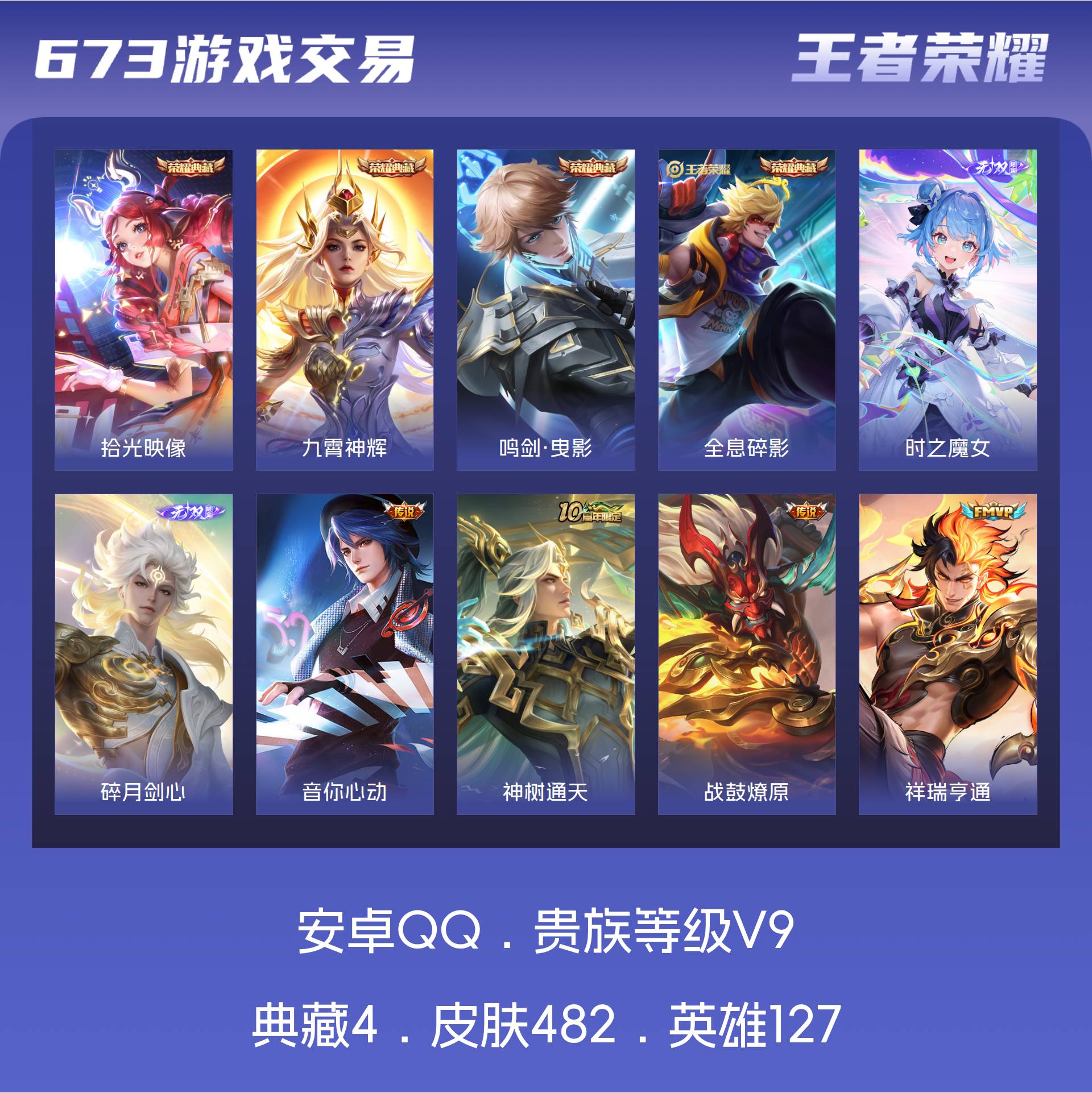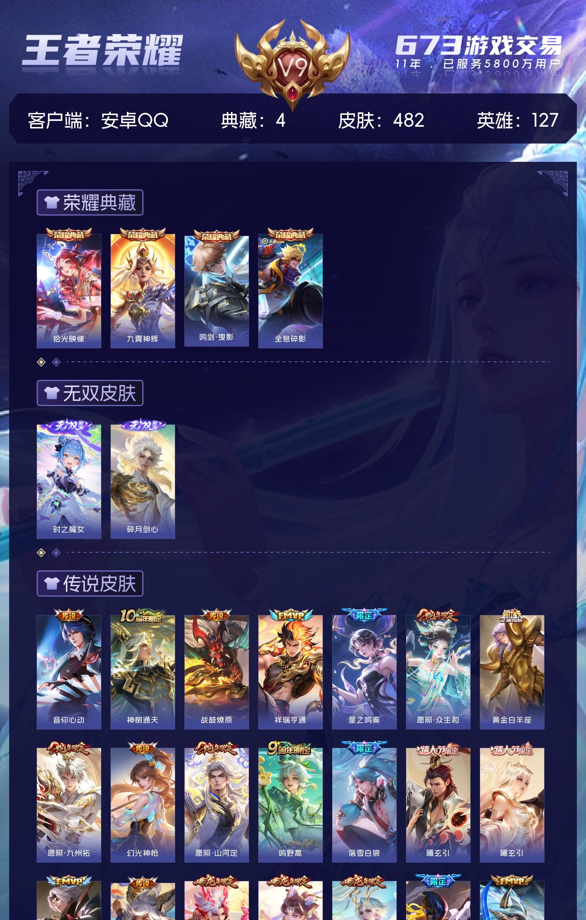 V9 皮肤482 英雄127 至圣王者 荣耀典藏4 无双皮肤2 传说39 其他皮肤443