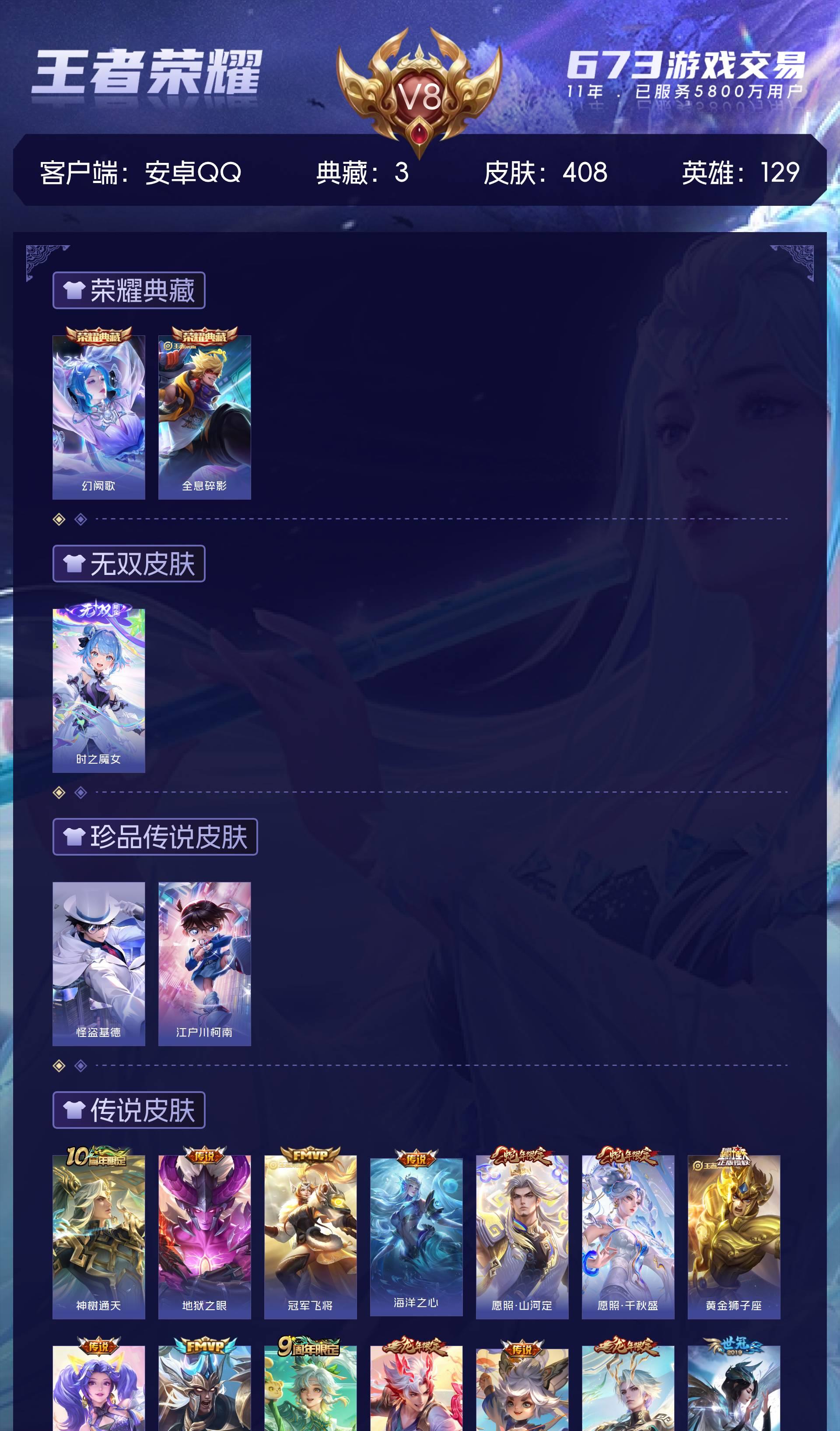 V8 皮肤408 英雄129 无双王者 荣耀典藏3 无双皮肤1 珍品传说2 传说22 其他皮肤387