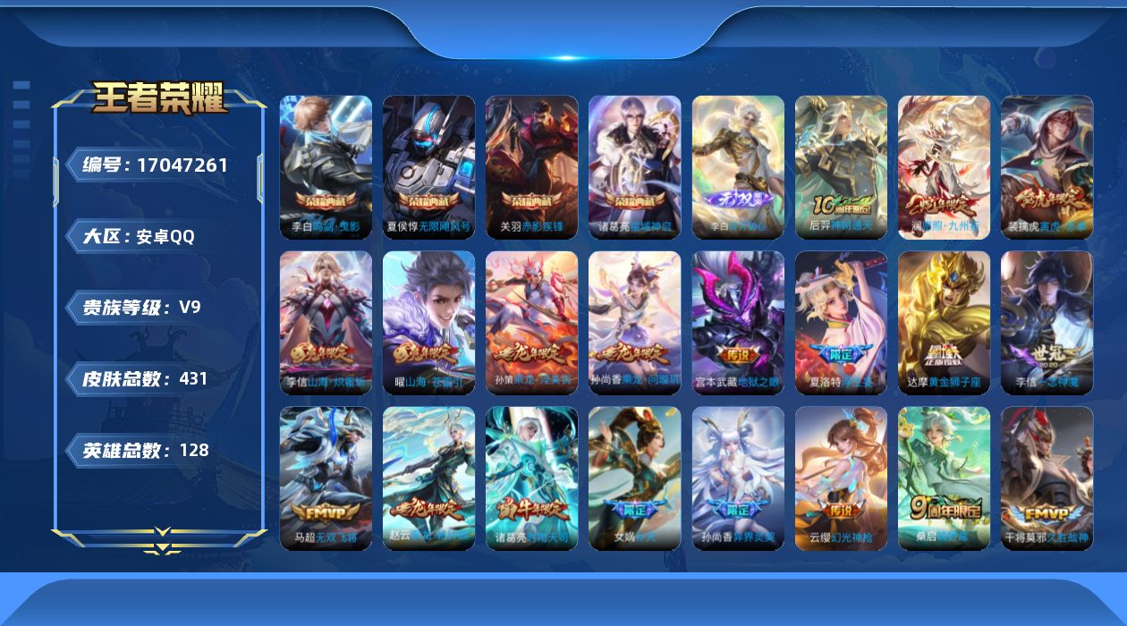 V9 皮肤431 英雄128 最强王者 荣耀典藏4 无双皮肤1 传说31 其他皮肤401