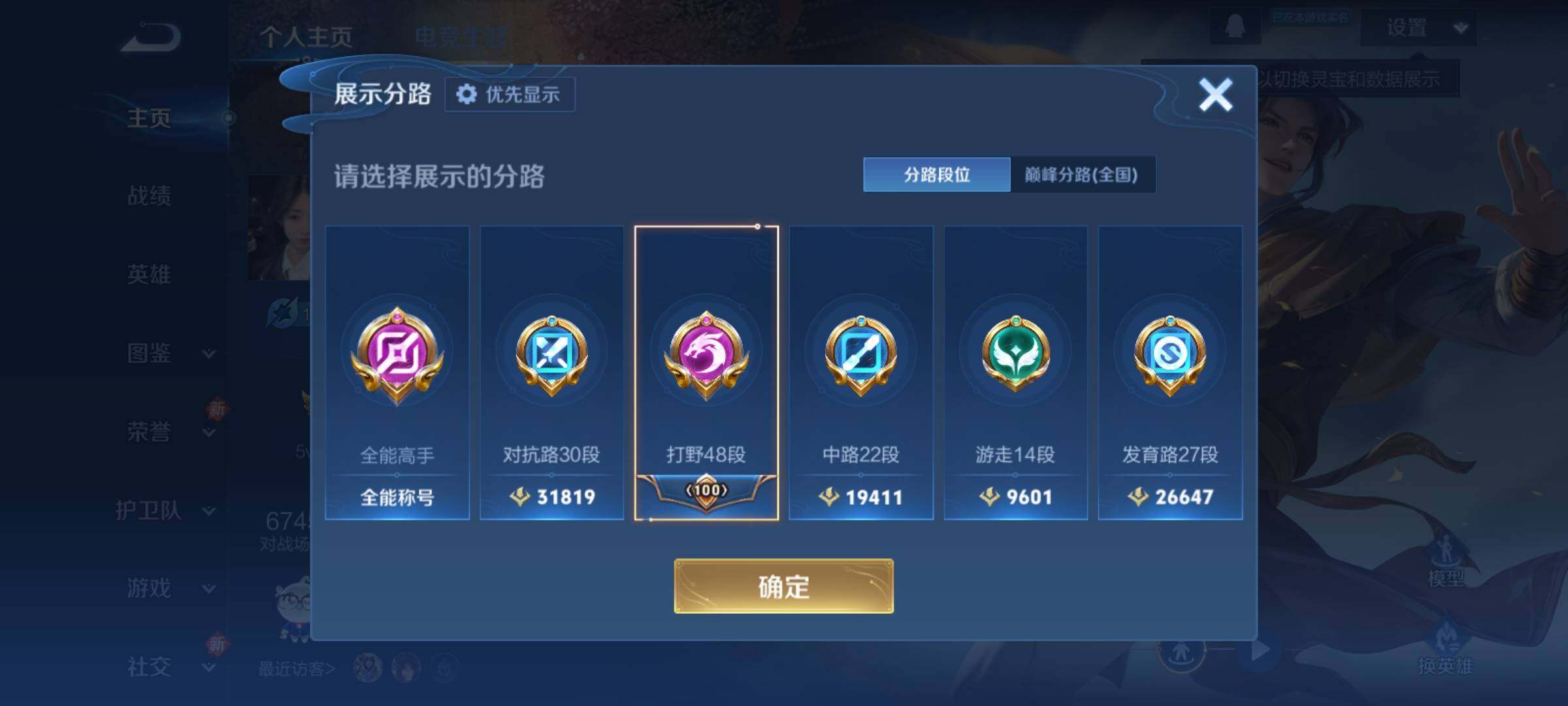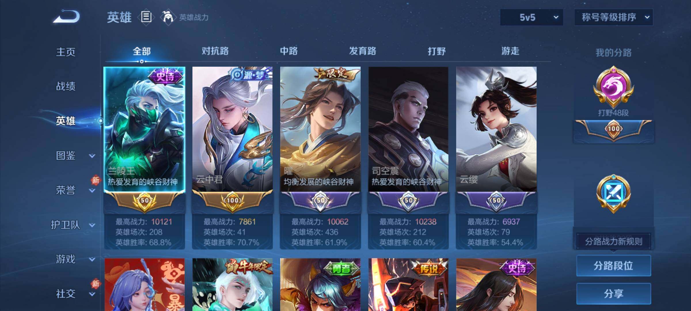 可换绑【高性价比·打野48段·金标万战兰陵王·银标万战司空震·银标万战曜·金标