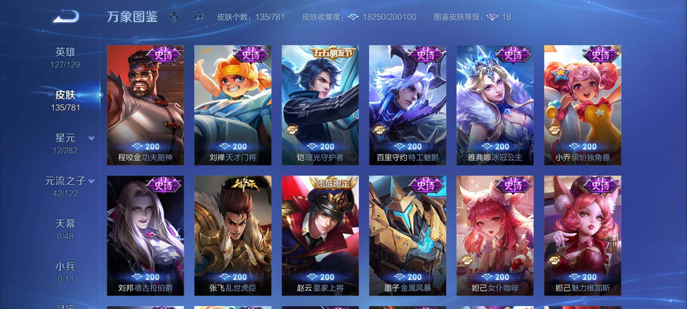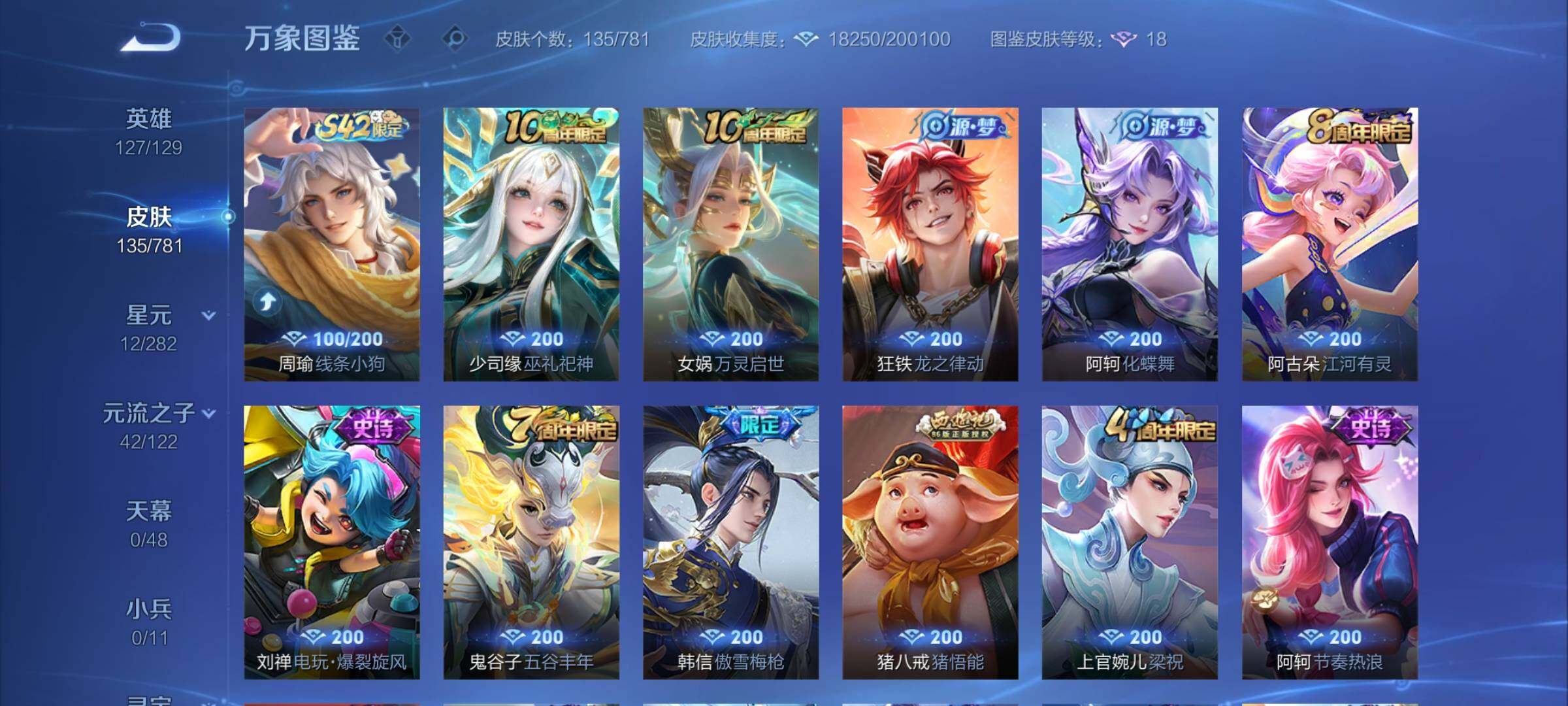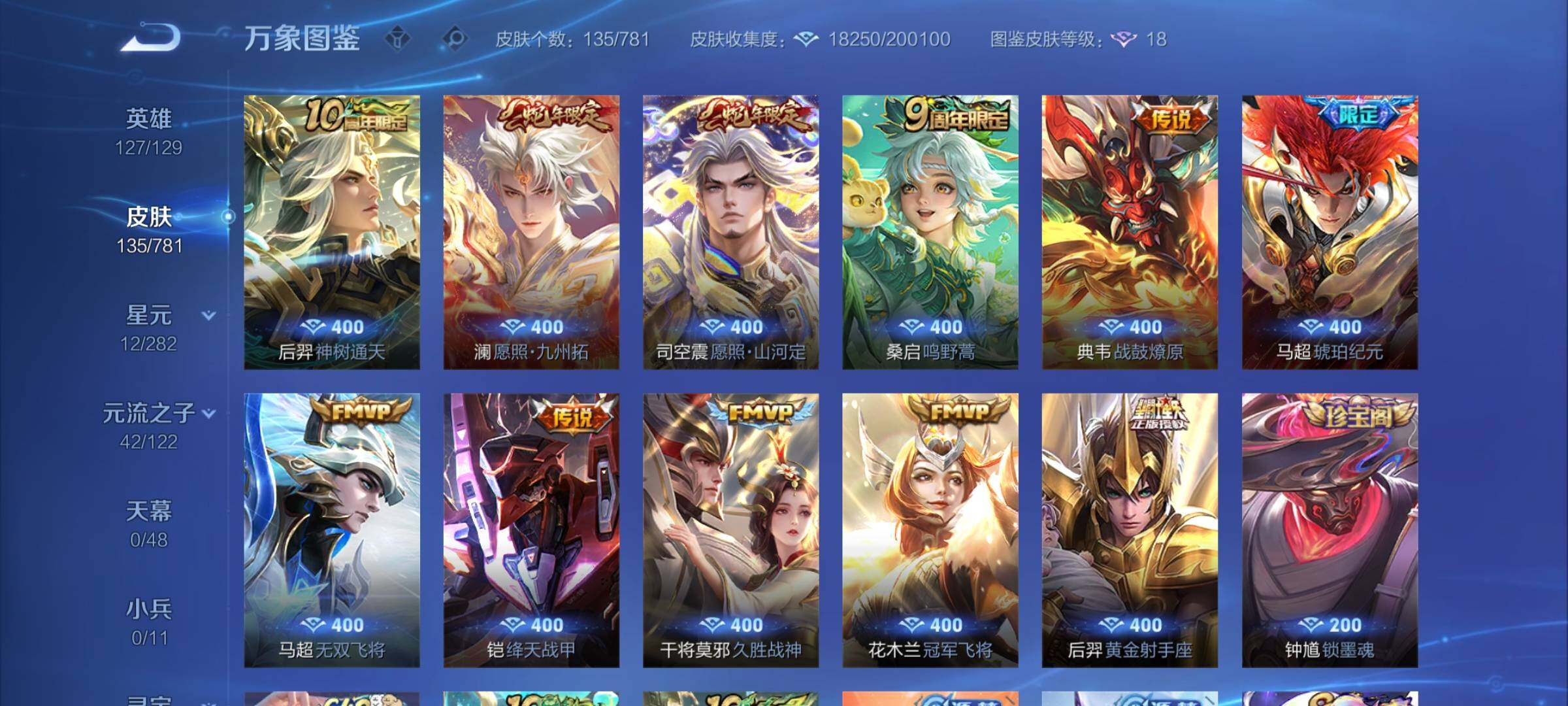 【英雄全皮】:孙权全皮【传说皮肤】:后羿神树通天,司空震愿照山河定,澜愿照九州拓,桑启鸣野蒿,典韦战鼓燎原,马超琥珀纪元,马超无双飞将,铠绛天战甲,干将莫邪久胜战神,花木兰
