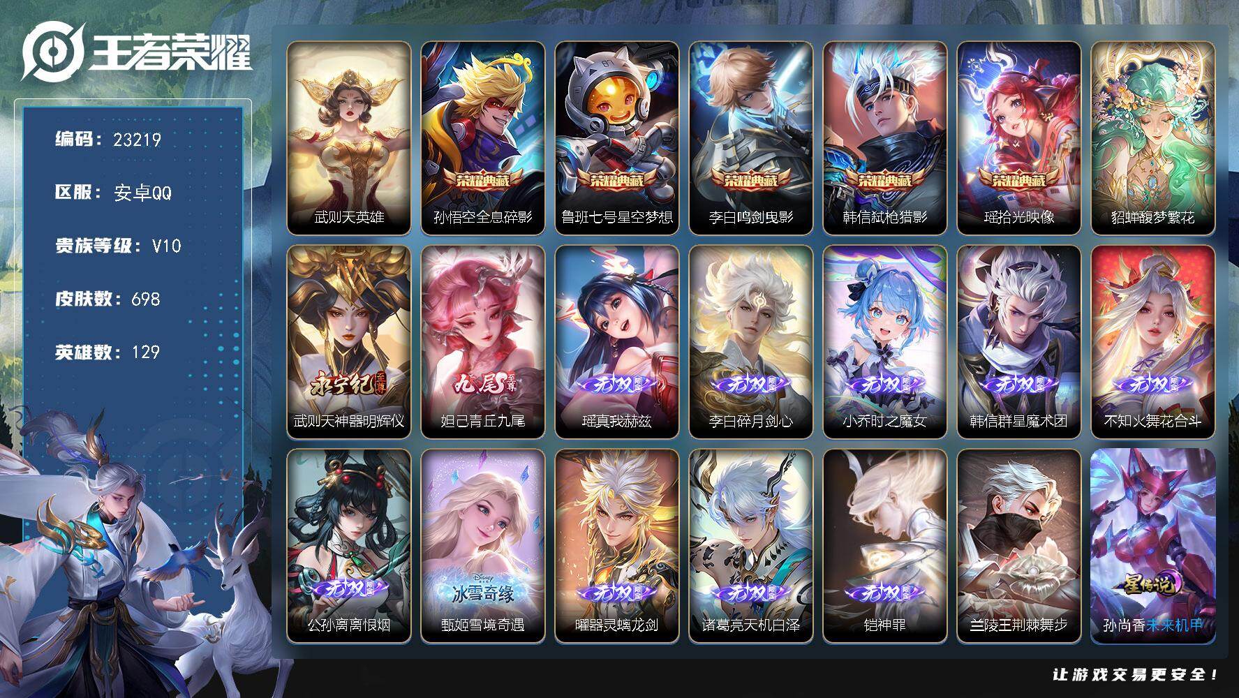 可换绑【V10精品号·大国标曹操2万战力·小国标女娲1.4万·历史小魔方·贵族积分53万·对抗路40段·17典藏含武则天英雄·3无双·13星元·秋月华灯天幕·浪翻一夏天幕·鸿兔大展天幕·春韵弦音天幕】6836皮肤碎片 54按键,13星传说,4天幕,535戳戳,23王者印记,满级铭文,可二次CD17468,安卓Q-V0-551皮肤-16典藏皮肤-1典藏英雄-3无双-92传