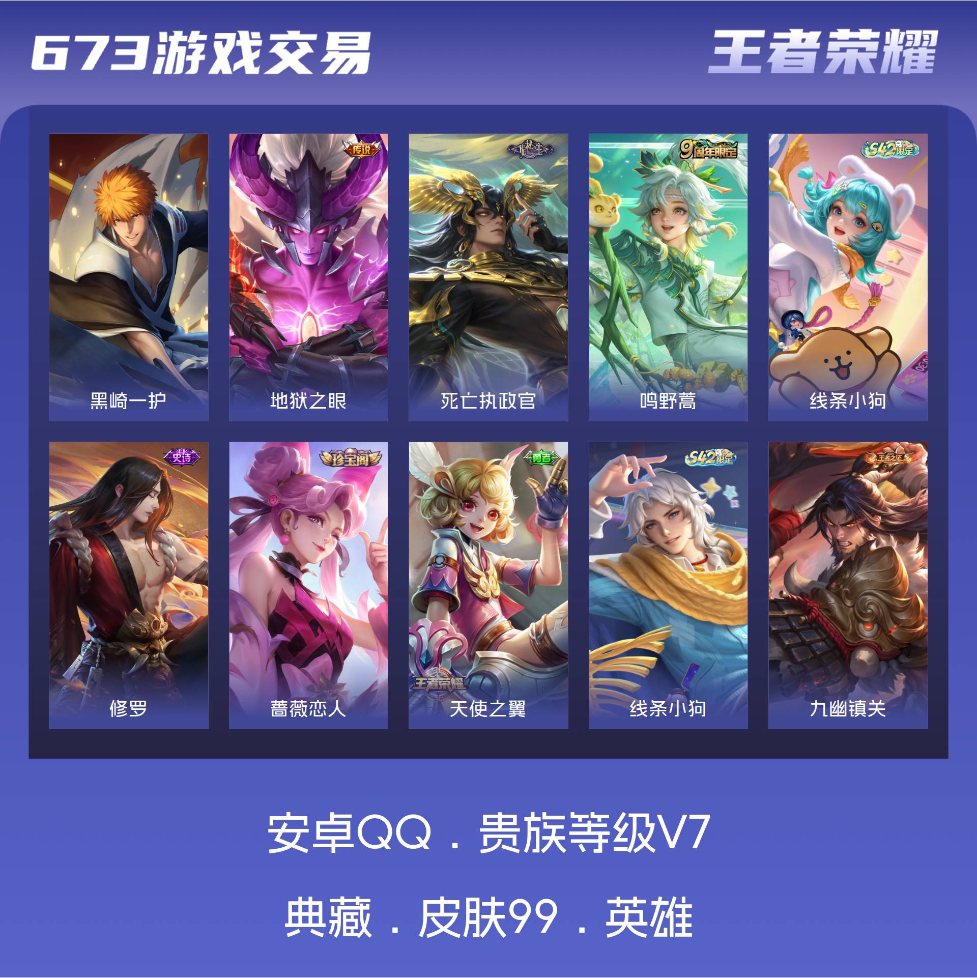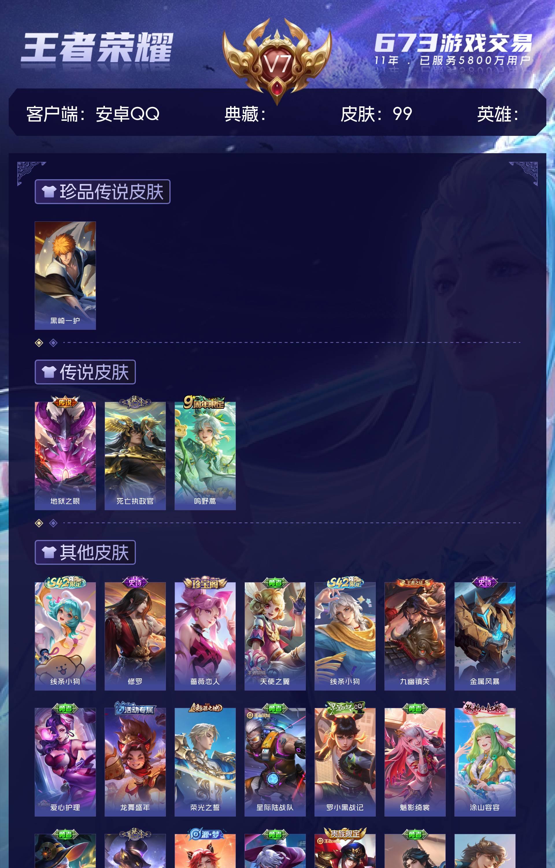 V7 皮肤99 至尊星耀 珍品传说1 星传说1 传说3 其他皮肤100