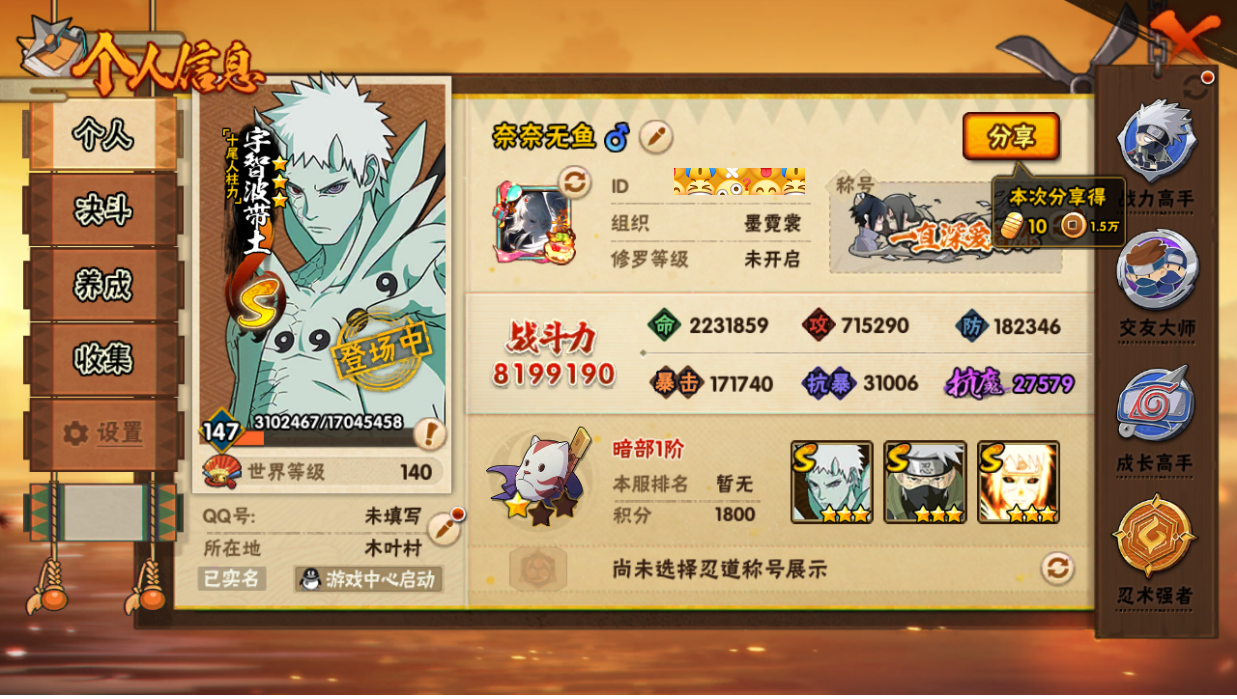 (可转苹果)819w破面白面十尾15s+1个198直购a35a+解斑碎片86