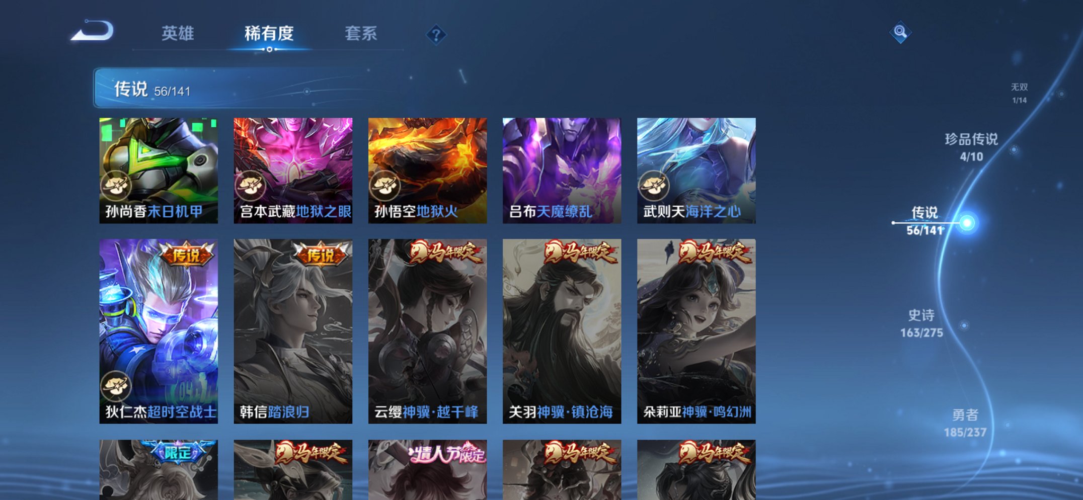 V10 496皮肤7水晶1珍品无双1无双4珍品56传说7星元4天幕1金标