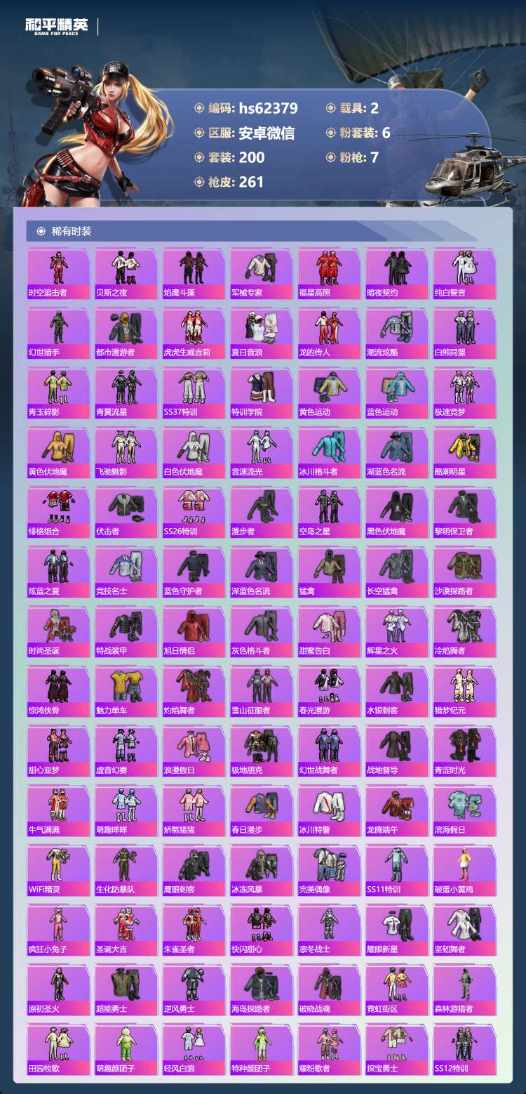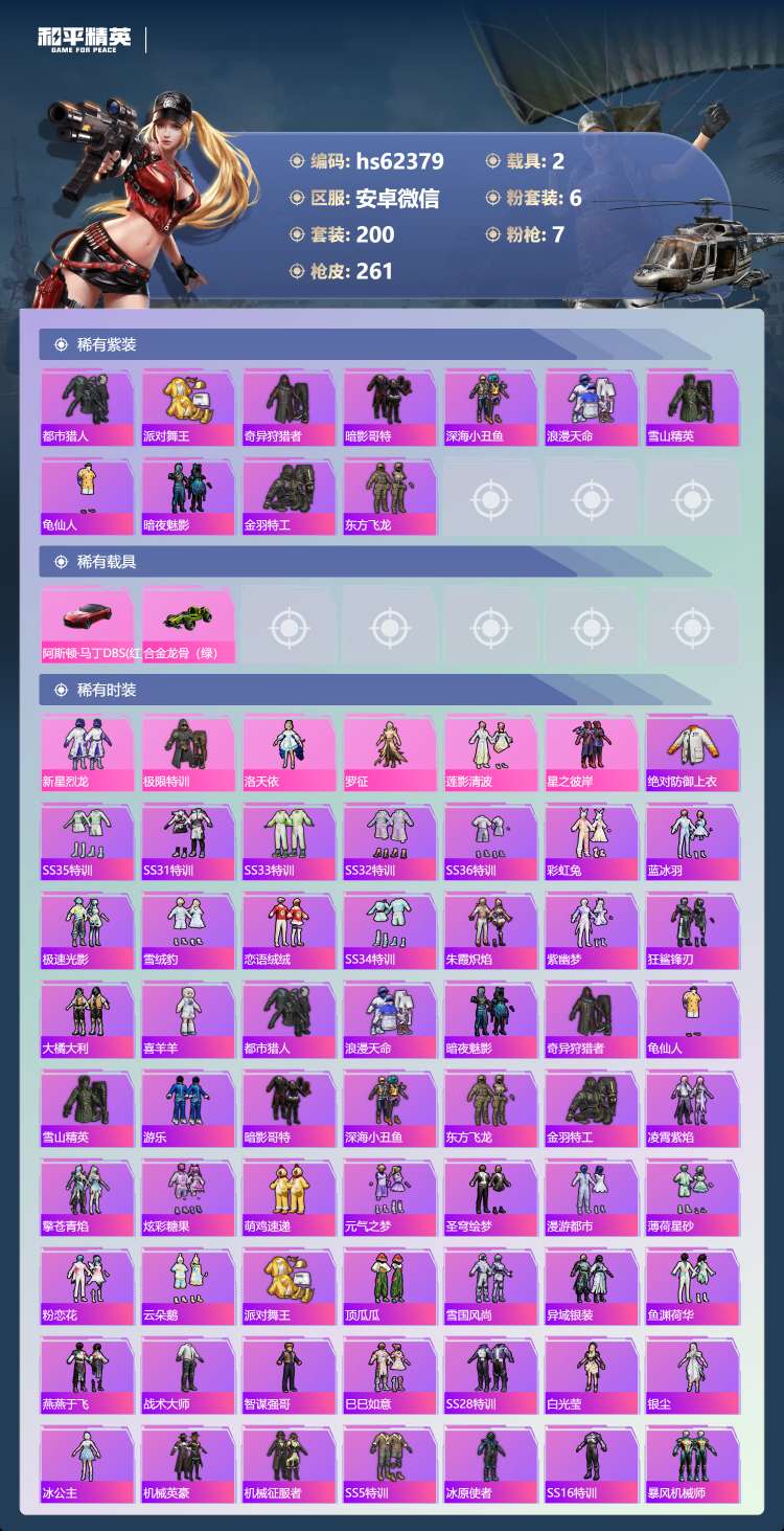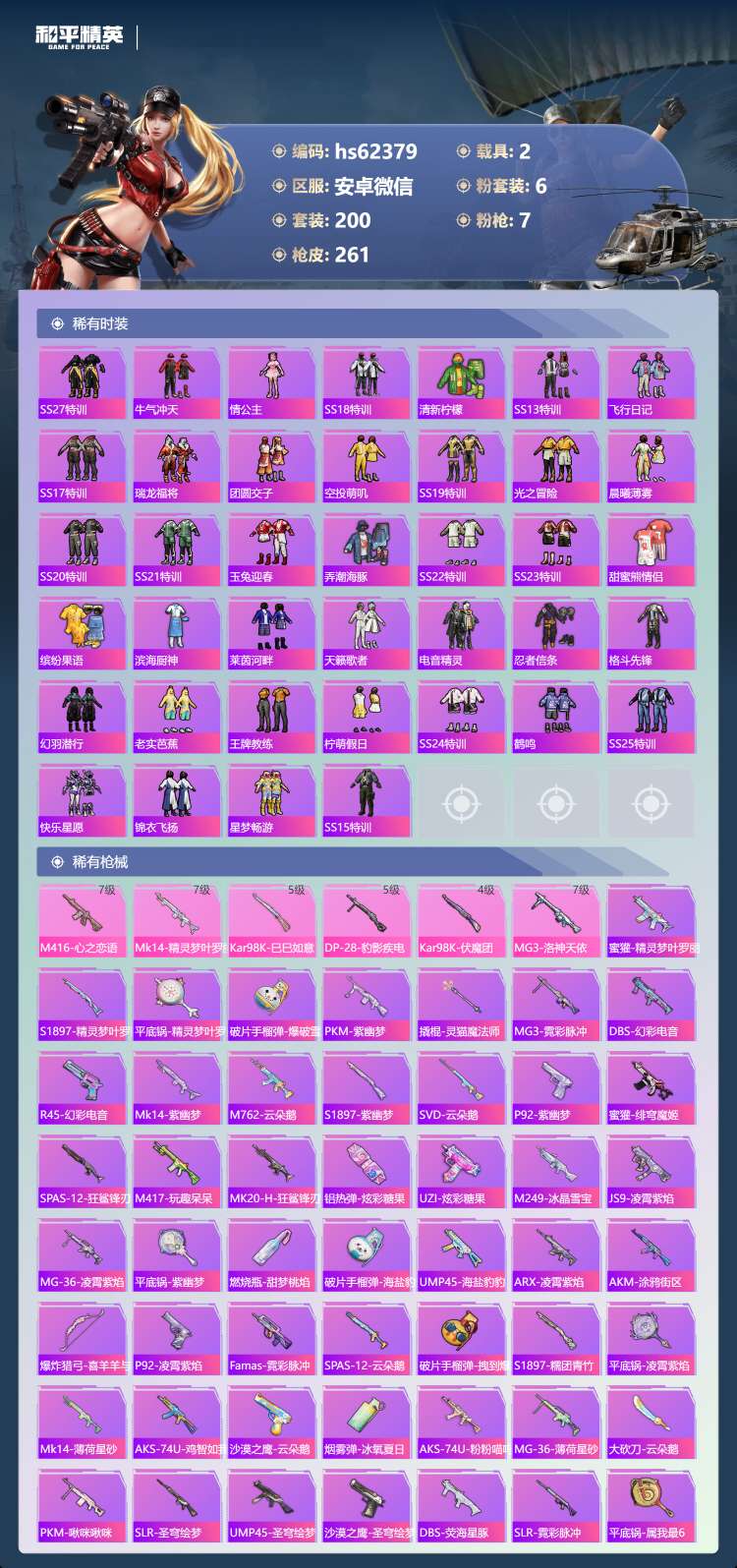 hs62379 安卓微-14王牌印记-6粉装-7特效枪-2载具-83231热力值-200套装-26
