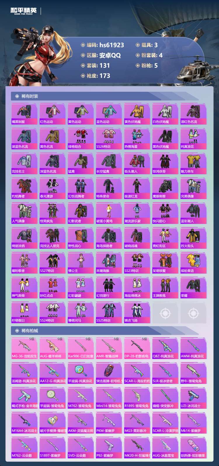 hs61923 安卓手Q-10王牌印记-4粉装-5特效枪-3载具-49089热力值-131套装-17