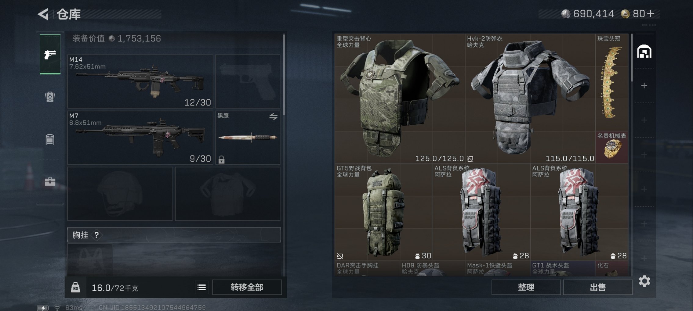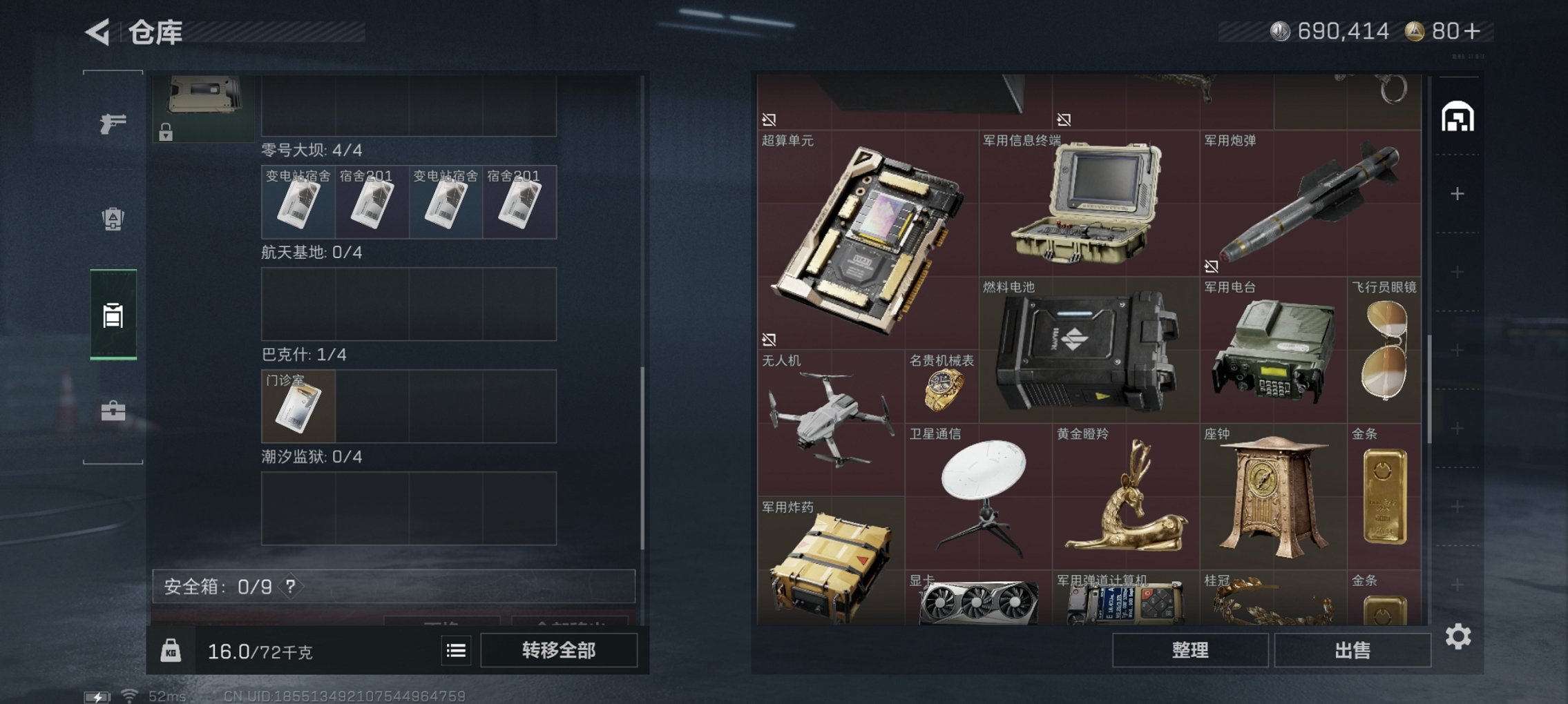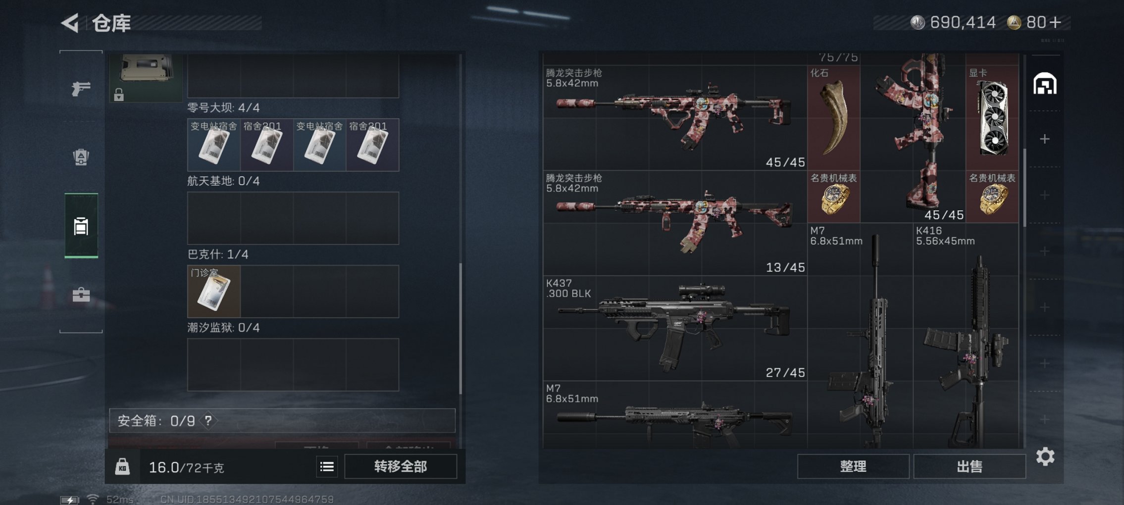 总资产43M【10颗AW子弹】哈夫币690K,行动等级:38,仓库等级:7,训练中心等级:3,靶场等级:1,枪皮:18